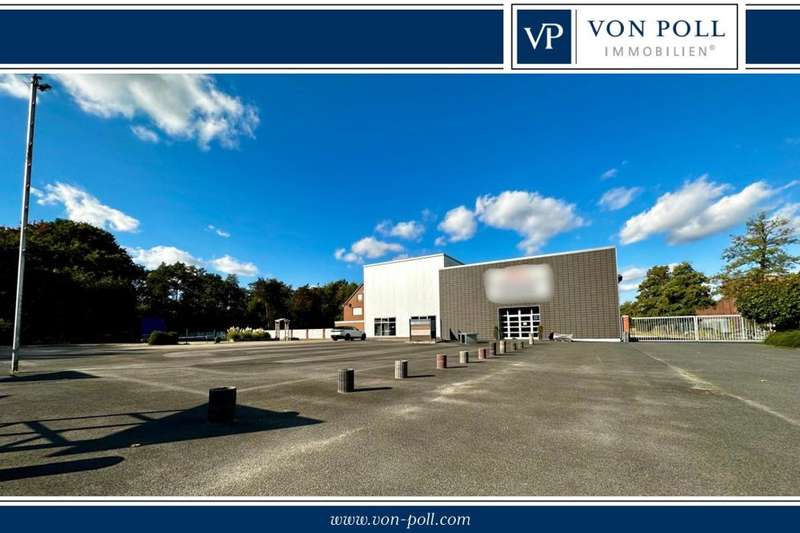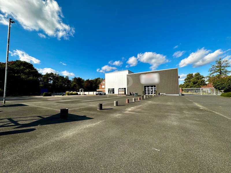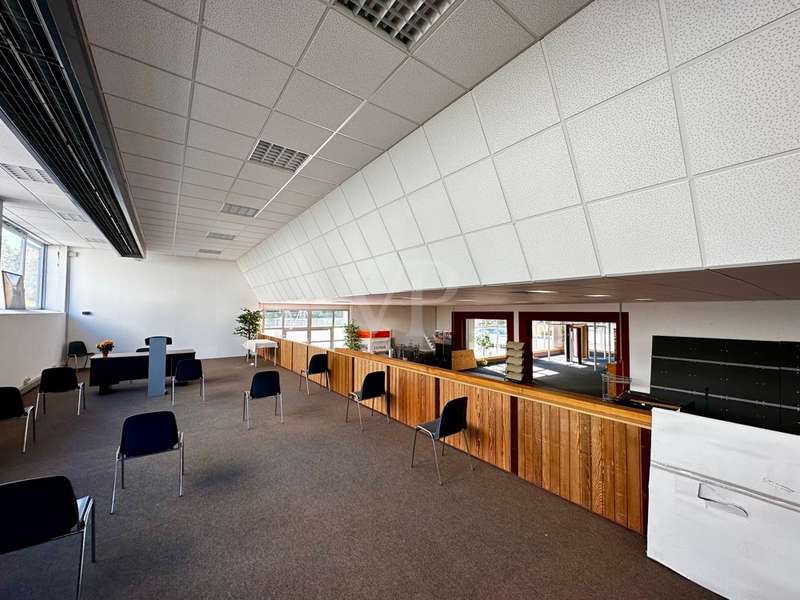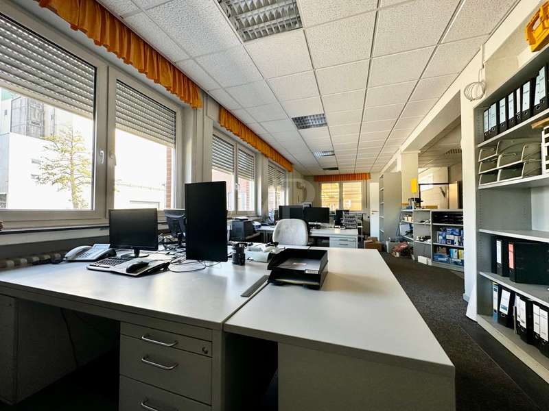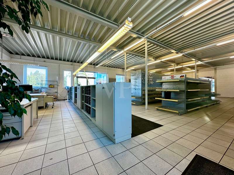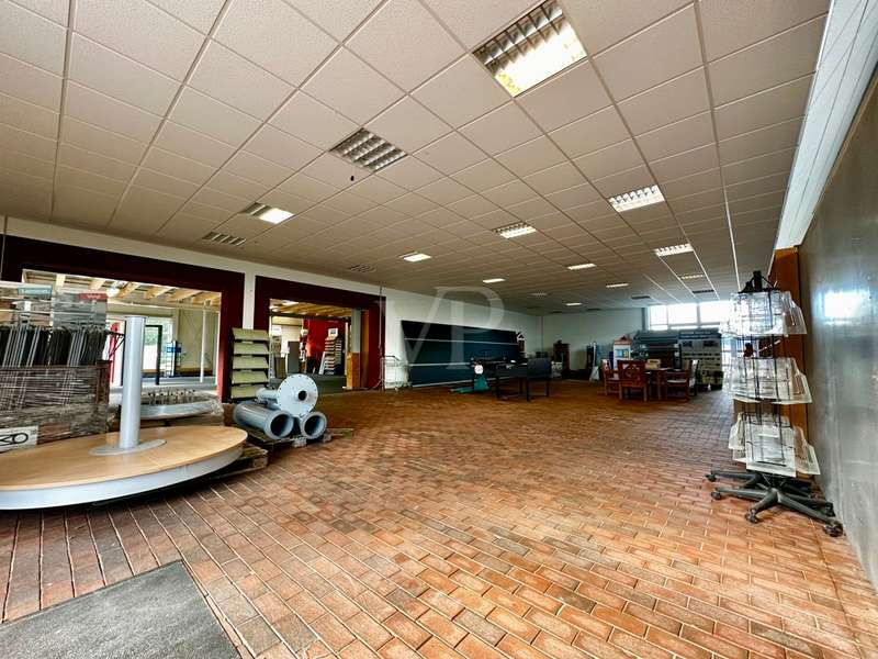 Offered is a commercial property with exhibition and sales areas, as well as offices for rent. The property is divided into the following areas: 200 m² office 121 m² showroom 209 m² specialty store 338 m² sales hall 1.265 m² parking spaces Each of the four areas can also be entered separately via a separate entrance. A podium is currently built in the sales hall, which can be used. Several levels are possible in the showroom. The office wing consists of an open-plan office, two separated offices and a meeting room with kitchen. The sales hall and the office wing have a partial basement. The objects may not be used for building materials trade.