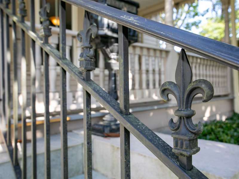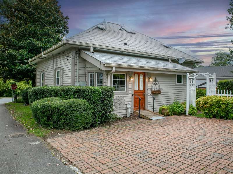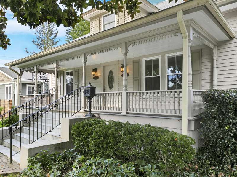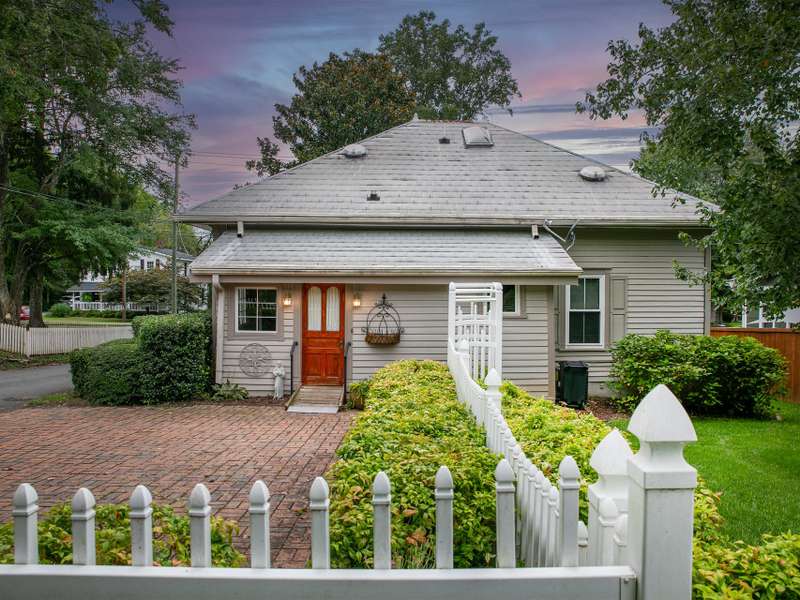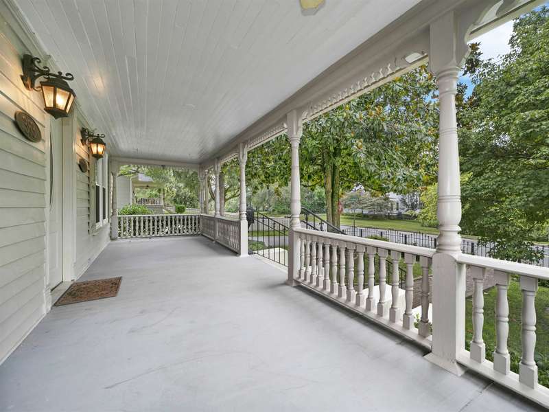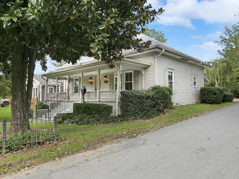 Charming Historic Home, 2BR/2BA Circa 1900. Step into history with this beautifully preserved 1900 built home that blends old-world charm with modern comfort. From the moment you arrive you'll be captivated by the beautiful front yard enclosed by a fleur de lis wrought iron fence. Framed by mature trees shading the front porch you are welcomed with character. The generously wide front porch, framed by classic columns and period details, this space is ideal for relaxing in a rocking chair. The porch's elevated setting gives you a peaceful, private view of the front yard and adds to the home's striking curb appeal. Inside, period-style lighting casts a warm glow throughout the home, highlighting the architectural charm, with soaring 10+ foot ceilings, all lovingly maintained. The cozy eat-in kitchen offers a delightful space for casual dining while original design elements create a sense of nostalgia and elegance. The primary bedroom is on the main level. Large, spacious suite which includes a separate sitting area or home office space. The exposed brick chimney is a beautiful architectural gem that adds charm to the space. Features 2 full baths, one on each level, both thoughtfully designed. Upstairs is a cozy bedroom with an en suite full bathroom and an additional mini split HVAC system. The home provides lots of storage space with extra built ins throughout. Laundry room on the main level. Rear entry from the brick paved parking area through a porch perfect for a drop zone. Enjoy the spacious rear yard with mature landscaping and a rear entry from the brick driveway. Come and see all this home has to offer!