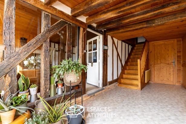 From the moment you enter, the charm of the half-timbering is immediately apparent. The various character features of the house are skilfully highlighted by the many windows that provide an abundance of natural light. The living room, where the warmth of wood reigns supreme, features an impressive stone fireplace. It is extended on one side by a pleasant lounge with lighter tones, and on the other by an open-plan kitchen that sits behind the half-timbering. This provides access to a pleasant terrace beside the river. A bedroom and two shower rooms complete the ground floor.
