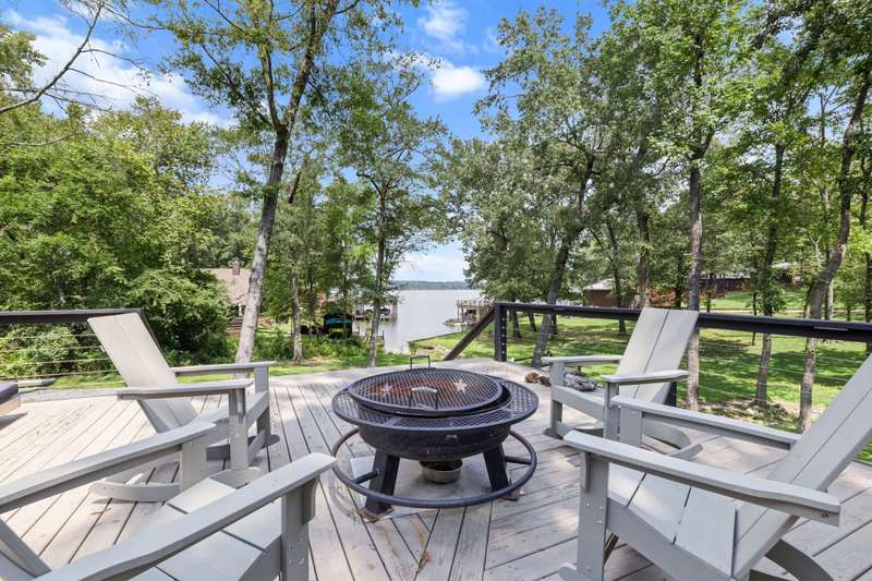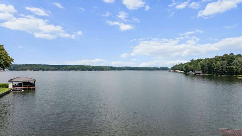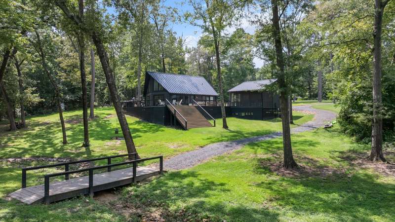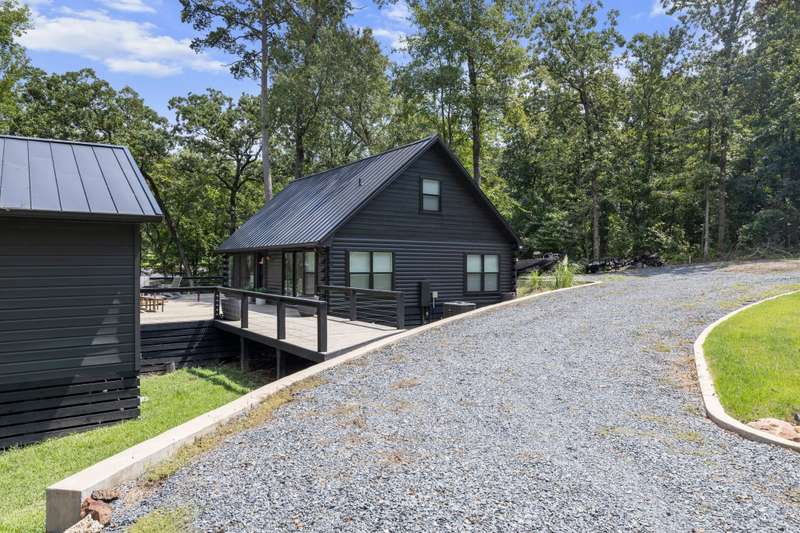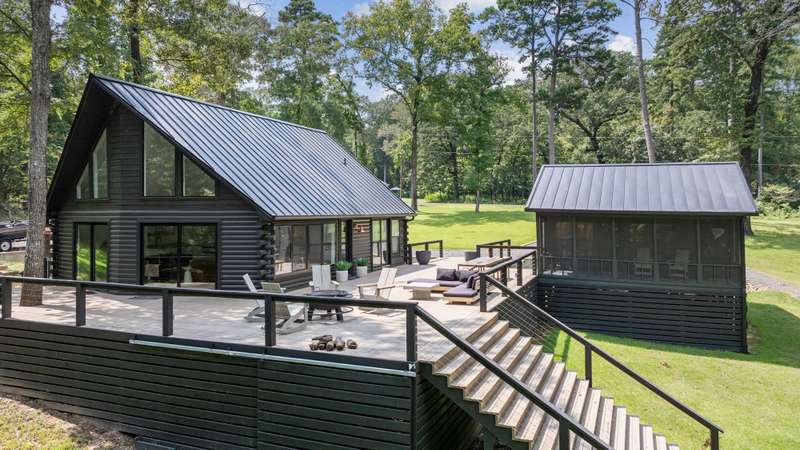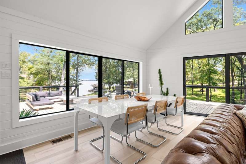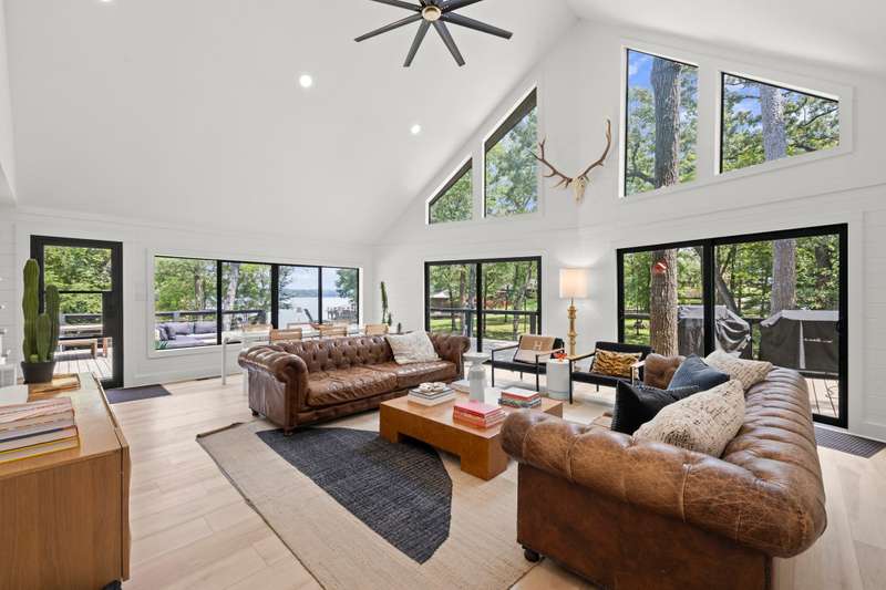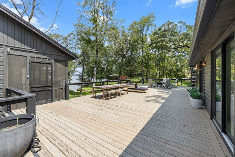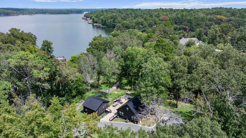 Experience lakeside living at its best in this beautifully remodeled A-frame retreat, perfectly positioned on a scenic 2.06-acre lot. Thoughtfully updated throughout, this home strikes the ideal balance between comfort and style, offering inviting spaces to both entertain and unwind. The open-concept living and dining areas are surrounded by dramatic floor-to-ceiling windows, filling the home with natural light and framing peaceful views of the lake and mature trees. Soaring vaulted ceilings add to the sense of openness, while a wood-burning fireplace creates a warm, welcoming focal point. The guest quarters provide an additional 375 sq. ft. guest quarters, complete with a full bath and a screened-in patio, providing a separate retreat without compromising the main homes footprint. Outdoor living is equally impressive, with an expansive wraparound deck designed for gatherings, relaxation, and evenings by the firepit. A private dock invites endless opportunities for boating, fishing, and lakeside fun. Within the gated community, residents also enjoy access to amenities including a pool, sports court, boat ramp, and more. Whether as a serene weekend escape or a year-round residence, this one-of-a-kind property offers the perfect blend of nature, recreation, and refined lakefront living.