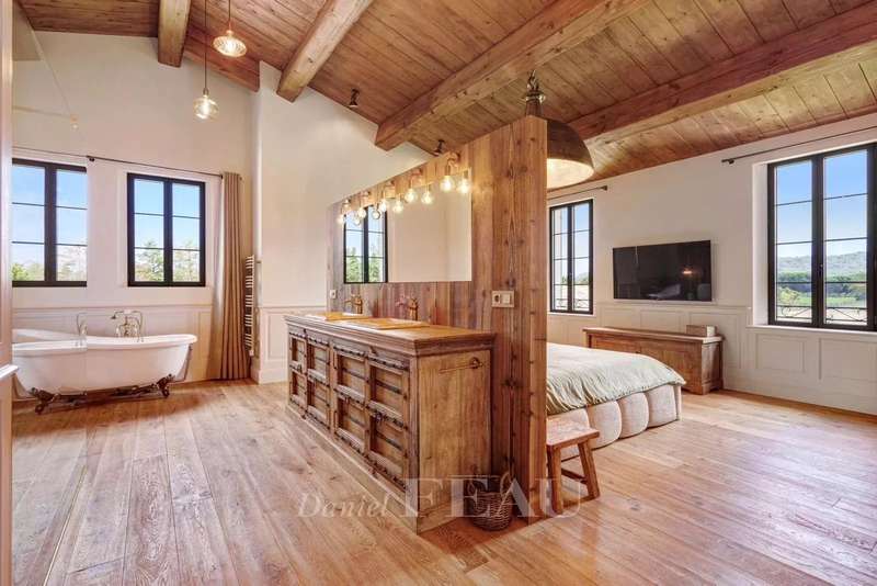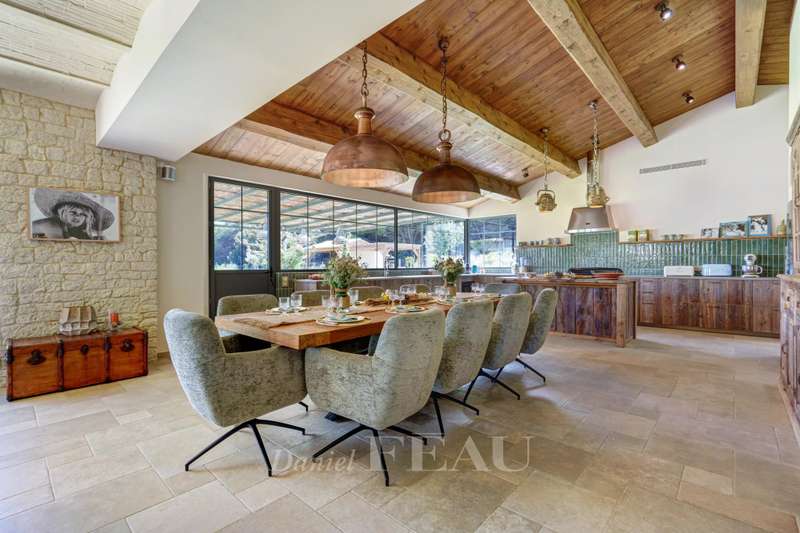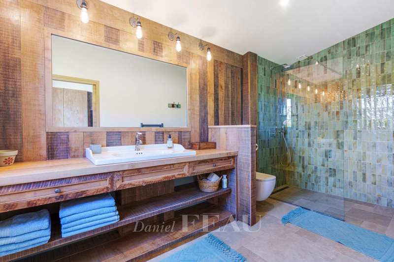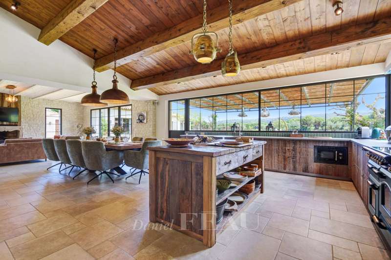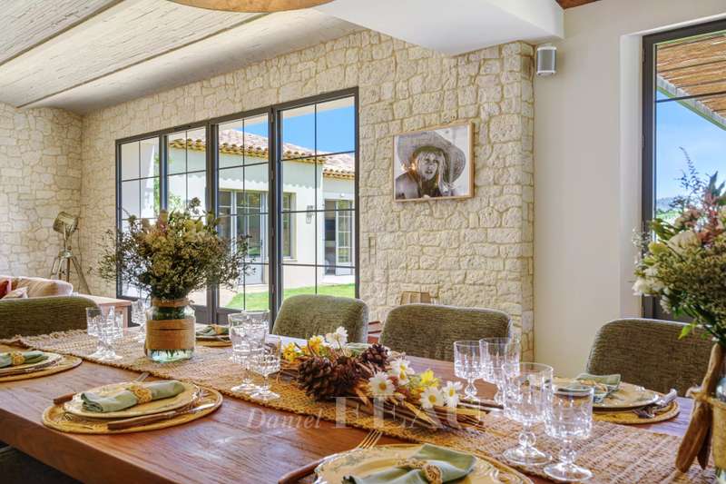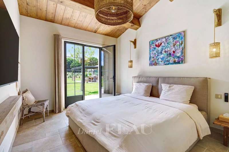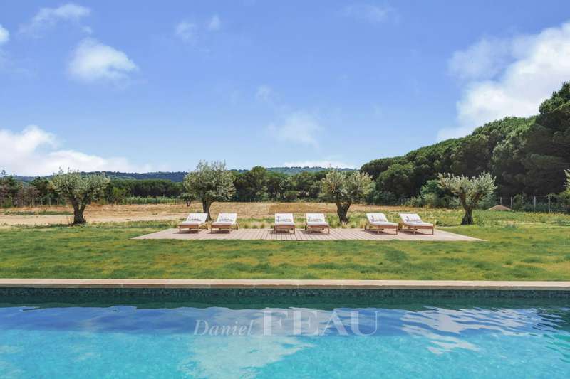 This recently renovated property is set in over a hectare of level grounds accessing Pampelonne Beach by means of a little track. Two distinct buildings offer a total of 350 sqm of living space and benefit from an open view of the surrounding countryside and a little stone-pine forest. The main villa includes a spacious living/reception room, and two generous bedrooms each with a bathroom and dressing room. An annex includes three suites. With a utility room, a double garage and a workshop.