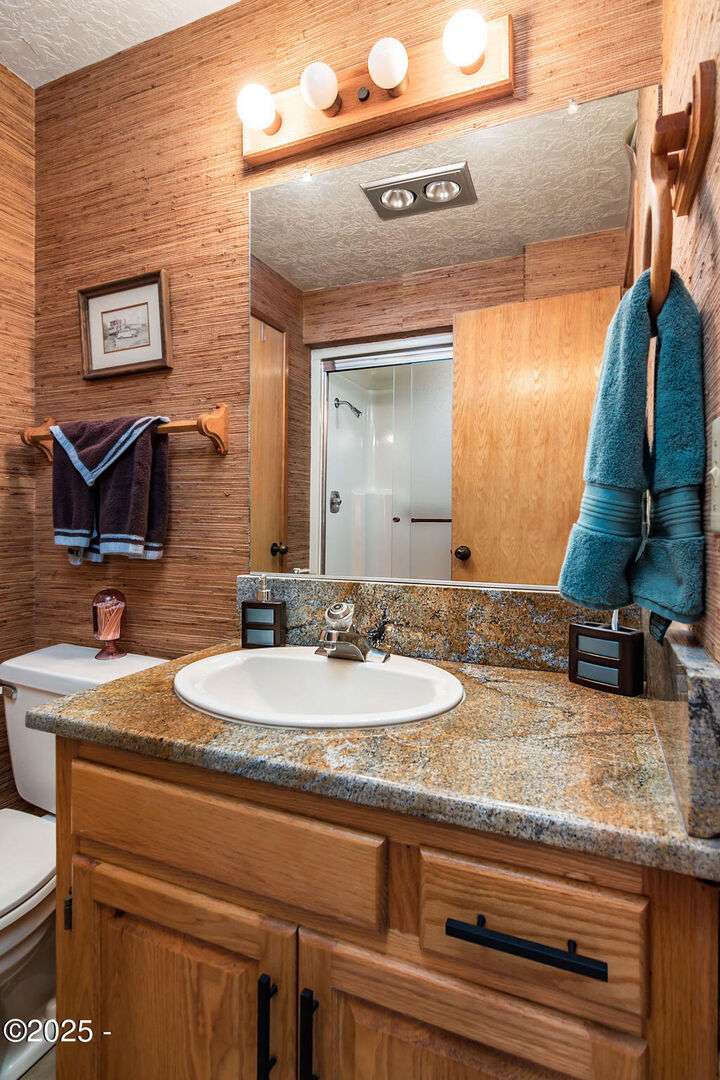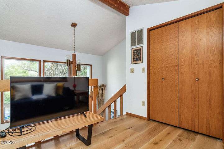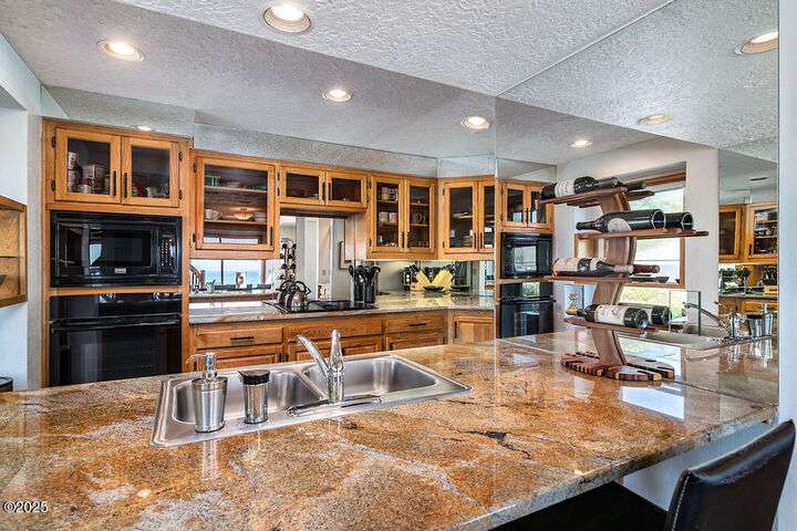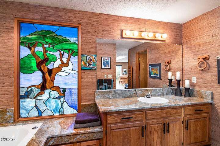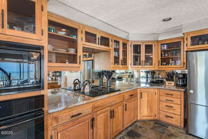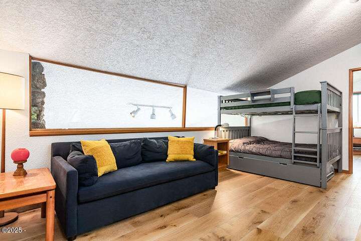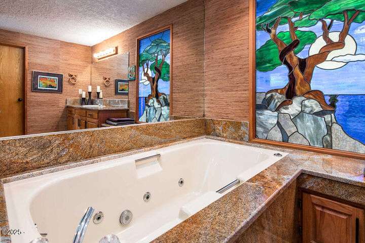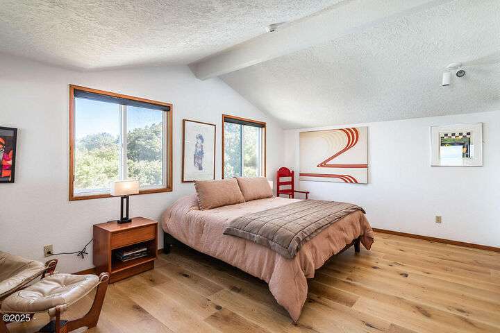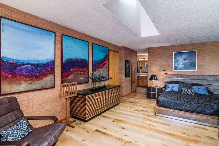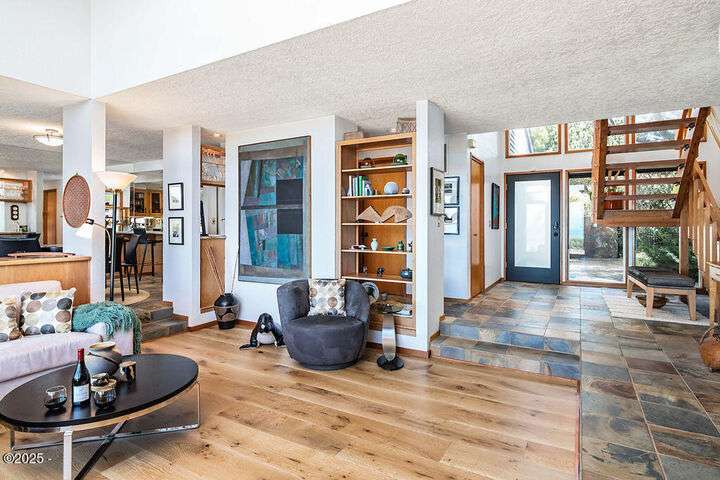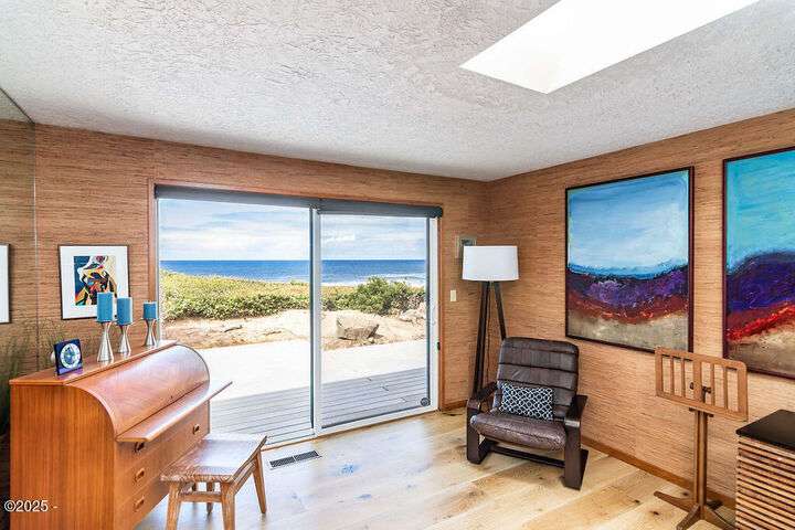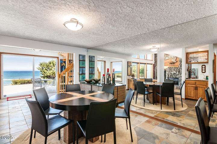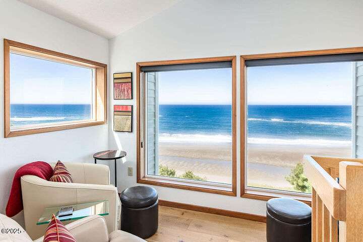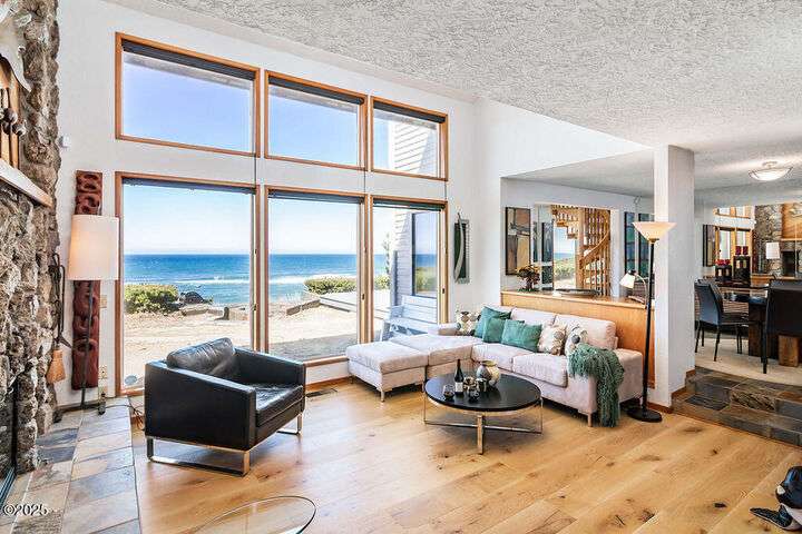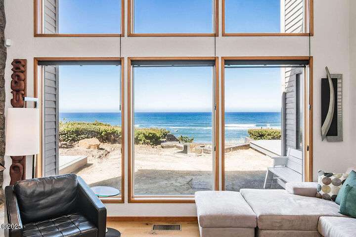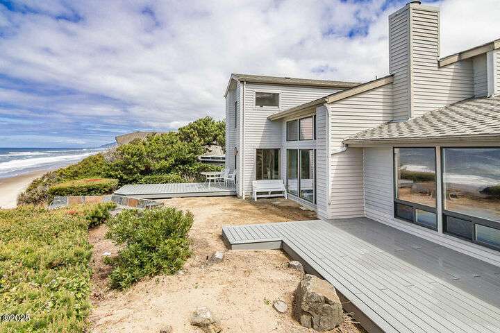 Salishan oceanfront contemporary home overlooking the coastline. This home features a gorgeous interior with hardwood floors, granite & stone accents and attention to detail throughout! Main level has open interior w/living room & gas fireplace & wall of windows overlooking the ocean & beach. Chef's kitchen w/ granite counters & dining area w/ artist spiral staircase to upper loft. Ocean front primary bedroom suite + den on main level. Access to wind protected oceanfront deck/patio with fire pit. Upper level features 2nd bedroom , bunk room, and bathroom, lots of storage. 2 car attached garage & courtyard entrance. Perfect & move in ready. Furnished (excludes all artwork, personal items).