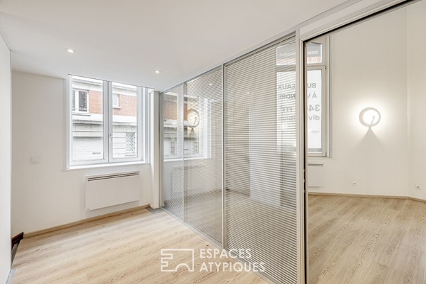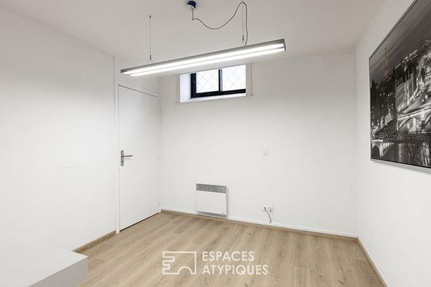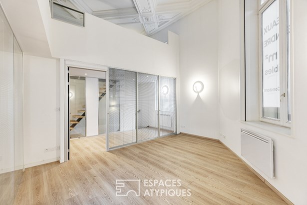 On the upper ground floor, the main living area captivates with its brightness and spaciousness. The ornate coffered ceilings recall the elegance of the period building, and the modern glass roofs and glass mezzanine give the space a decidedly contemporary and inspiring atmosphere, with a workshop feel. This floor overlooks the living area, exuding light and airiness, offering a beautiful office or social space.