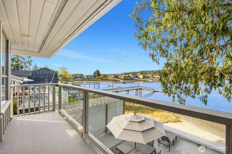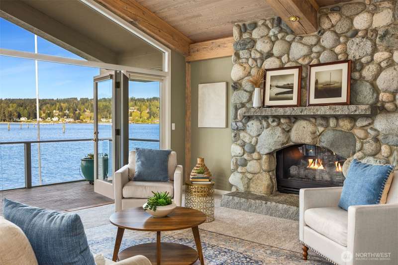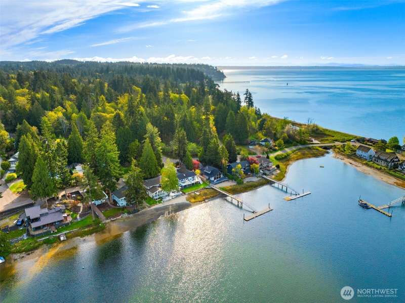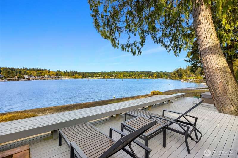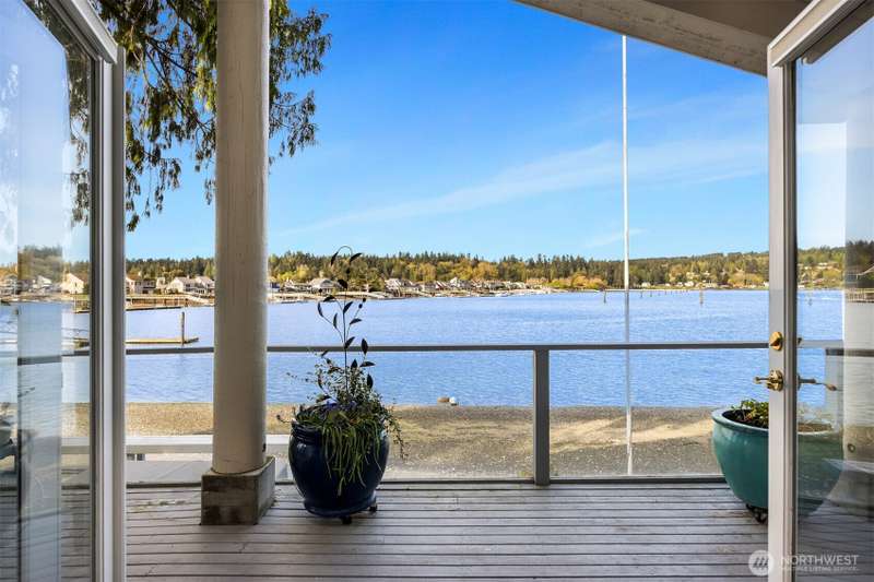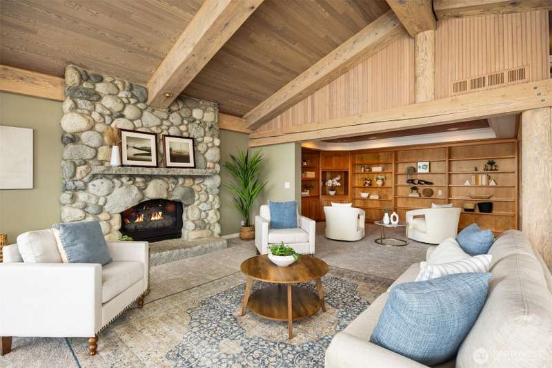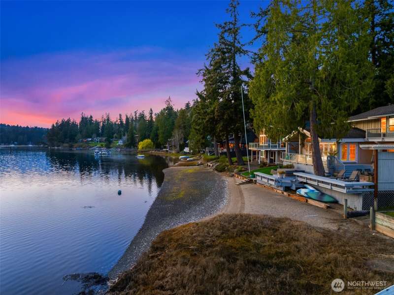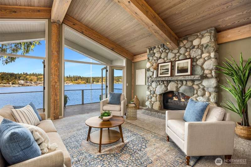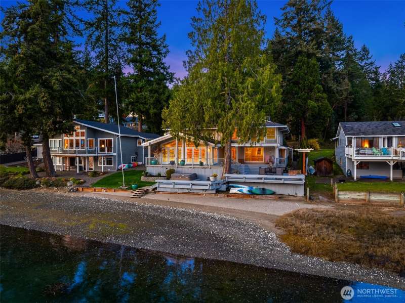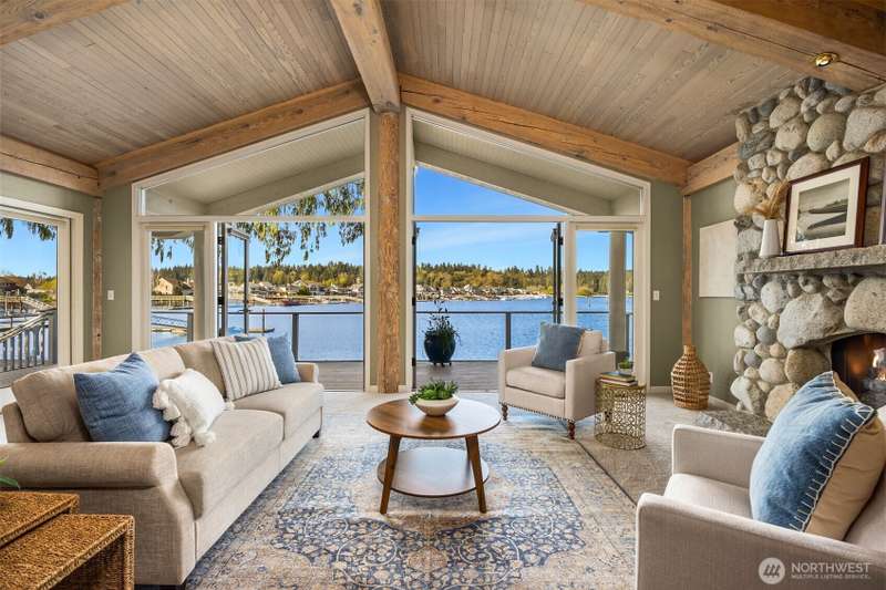 Discover a low bank waterfront gem in Indianola, where tranquility awaits on 68' of sandy beach. This home's main level offers spectacular views of Miller Bay & its abundant wildlife. Enjoy the whitewashed, oversized timbers & massive granite & river rock fireplace in the grand living room. The living room, library, dining area & kitchen all open to an expansive waterside deck, perfect for year-round entertaining. Upstairs, you will love the grand primary suite with a new balcony/deck, walk-in closet & oversized en-suite. Another bedroom & office adds practicality. Swim, paddle board, fish, & boat from your own slice of paradise. This vibrant neighborhood hosts social activities & community events like the Strawberry Festival year round.