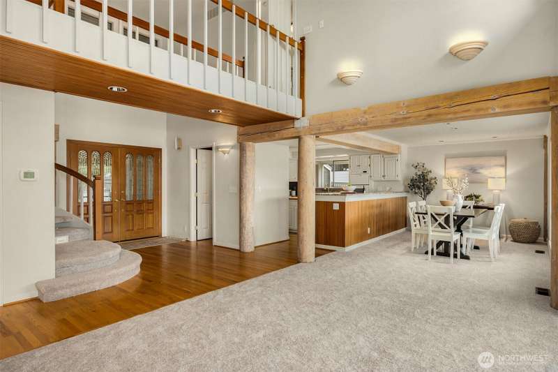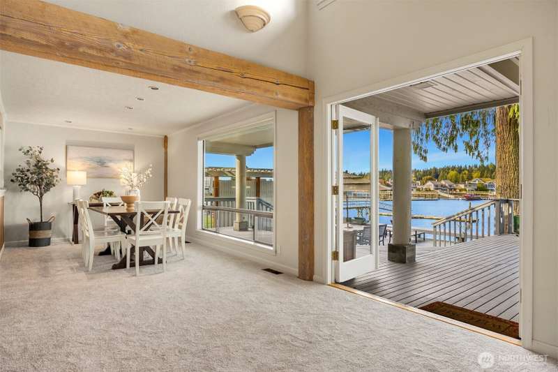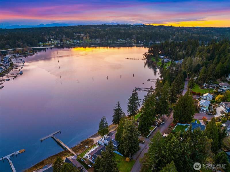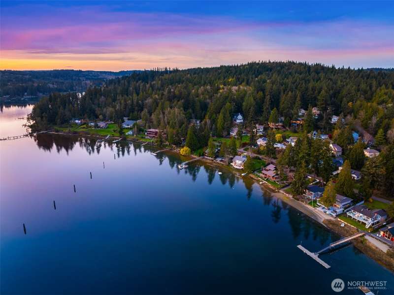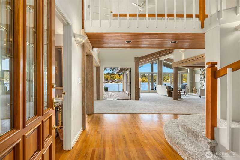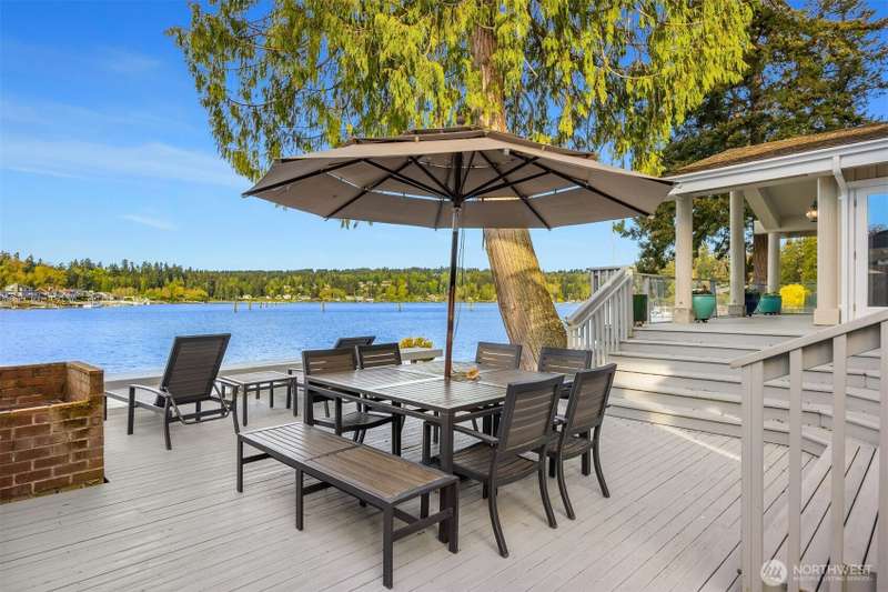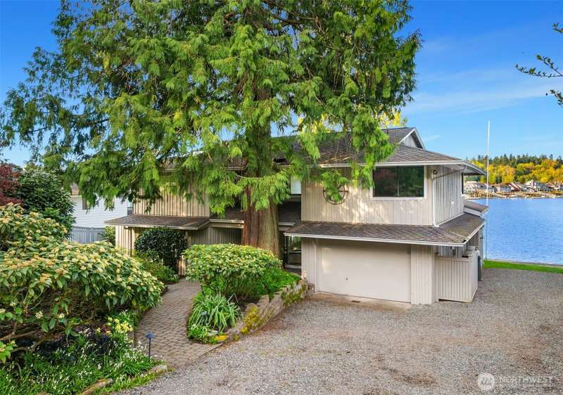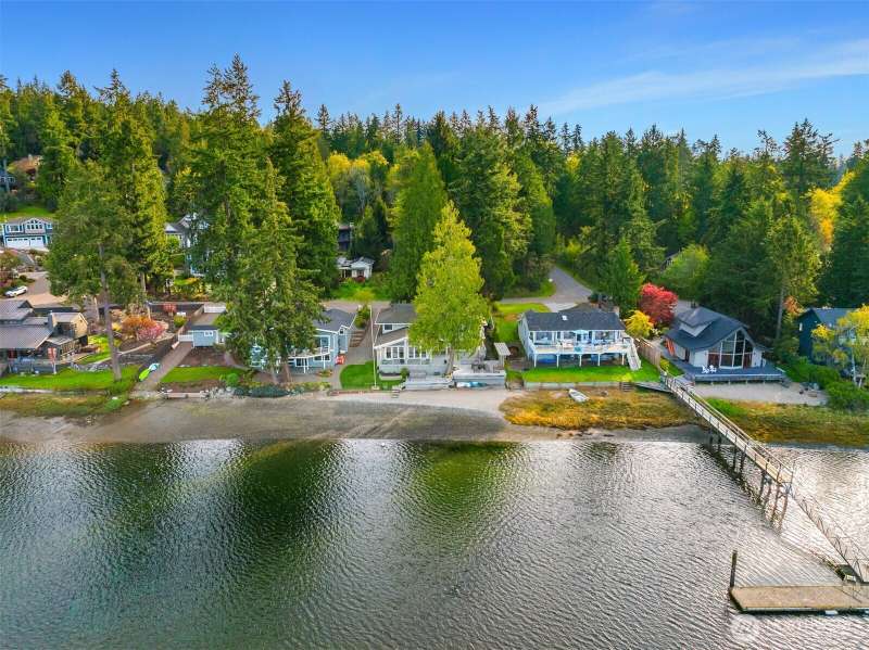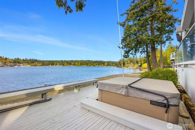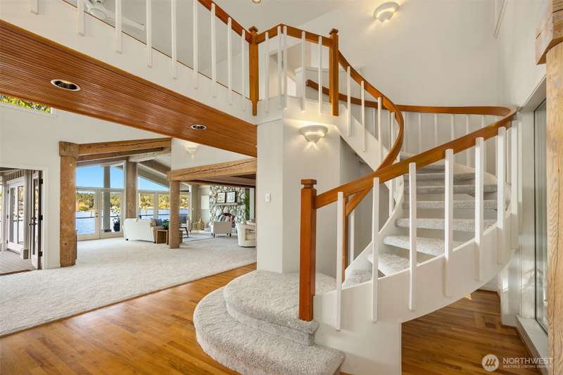 Discover a low bank waterfront gem in Indianola, where tranquility awaits on 68' of sandy beach. This home's main level offers spectacular views of Miller Bay & its abundant wildlife. Enjoy the whitewashed, oversized timbers & massive granite & river rock fireplace in the grand living room. The living room, library, dining area & kitchen all open to an expansive waterside deck, perfect for year-round entertaining. Upstairs, you will love the grand primary suite with a new balcony/deck, walk-in closet & oversized en-suite. Another bedroom & office adds practicality. Swim, paddle board, fish, & boat from your own slice of paradise. This vibrant neighborhood hosts social activities & community events like the Strawberry Festival year round.