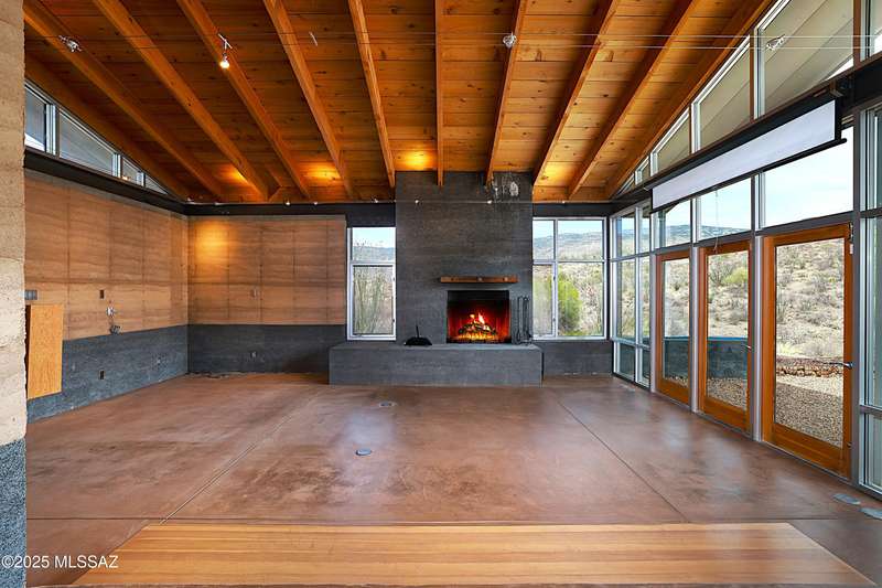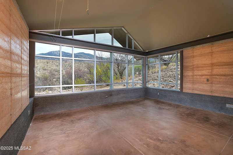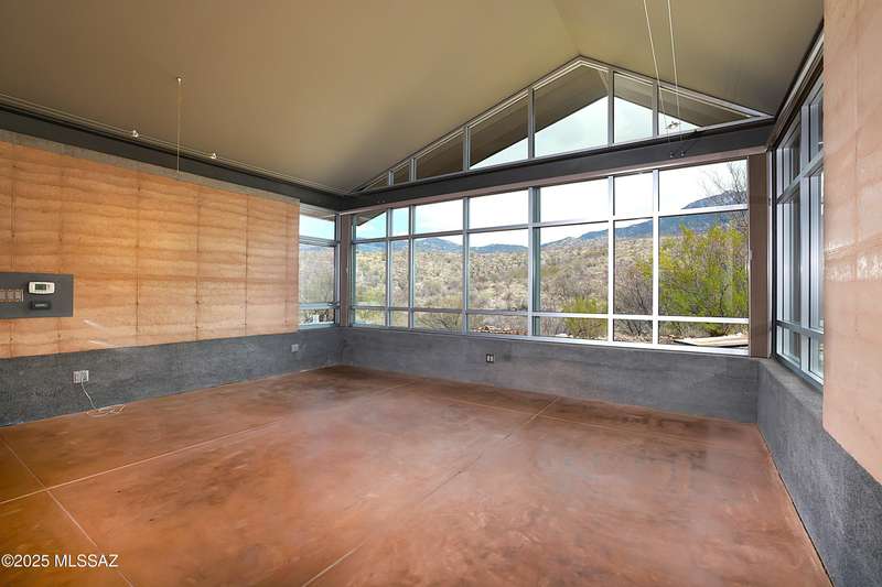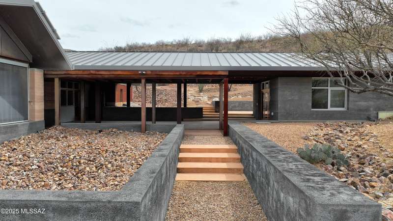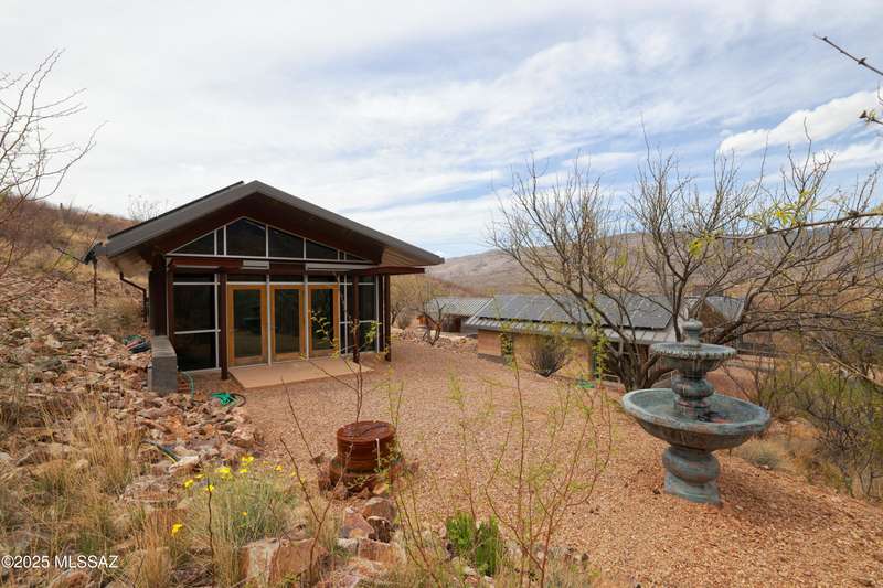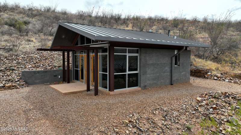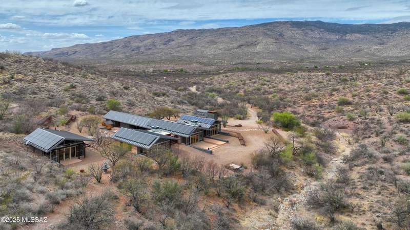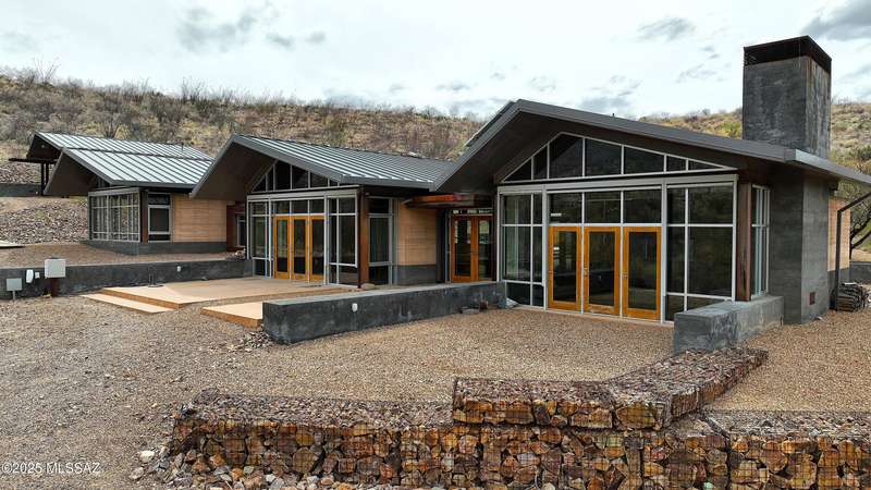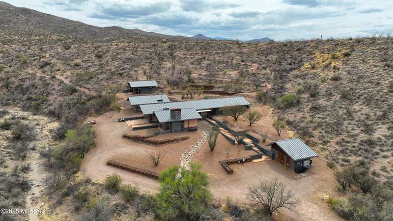 Welcome to this one of a kind compound on over 47 private acres w/spectacular views. Built to last with rammed earth & lava-crete construction designed for thermal mass w/commercial windows & doors, this home features beamed ceilings, metal roofs, underground wine cellar & a 1-mi. walking trail on the land. Spacious living area w/walls of windows framing the views, striking FP, modern kitchen w/lg island, breakfast bar & sizable dining area. Concrete flrs thruout. Primary Suite w/more views & ensuite bath. Gst Qtrs connects by a lg covered breezeway & features 2 bdrms & full bath. Terrific outdoor sauna. Detached studio w/half bath ideal for ofc/gym. Located in the gated X9 Ranch commty, it's the perfect place to get away from it all & immerse yourself in the beautiful Sonoran Desert.