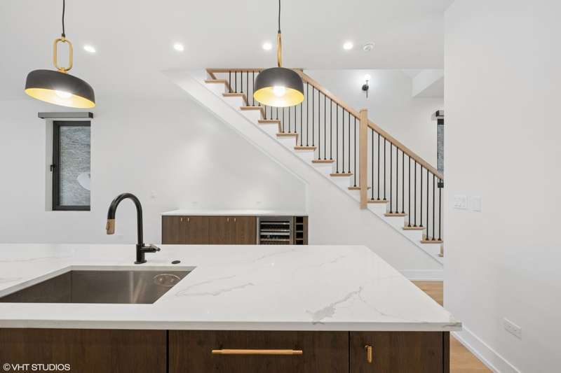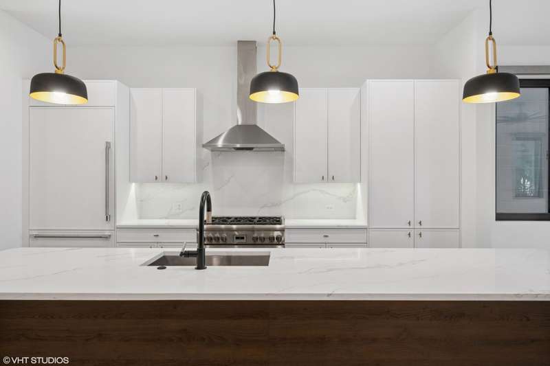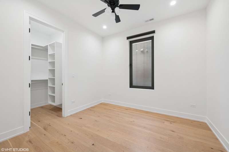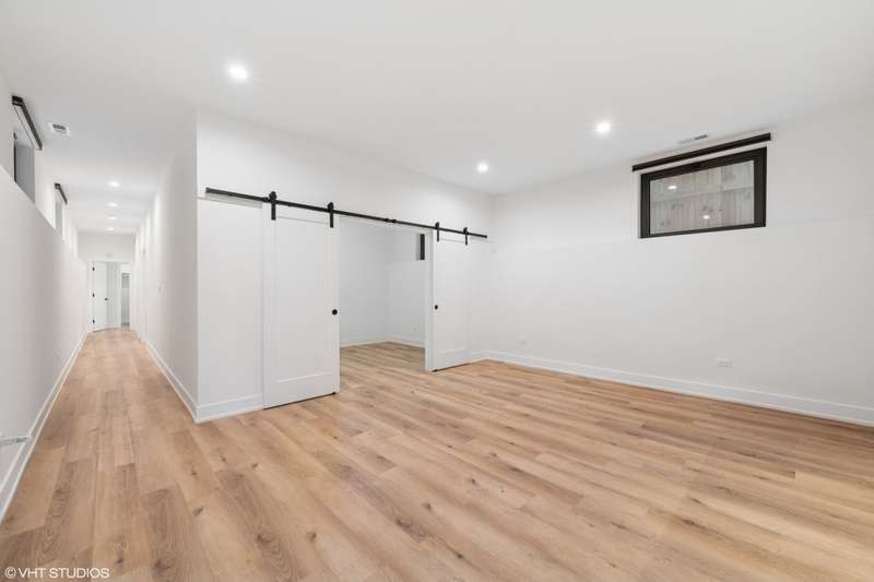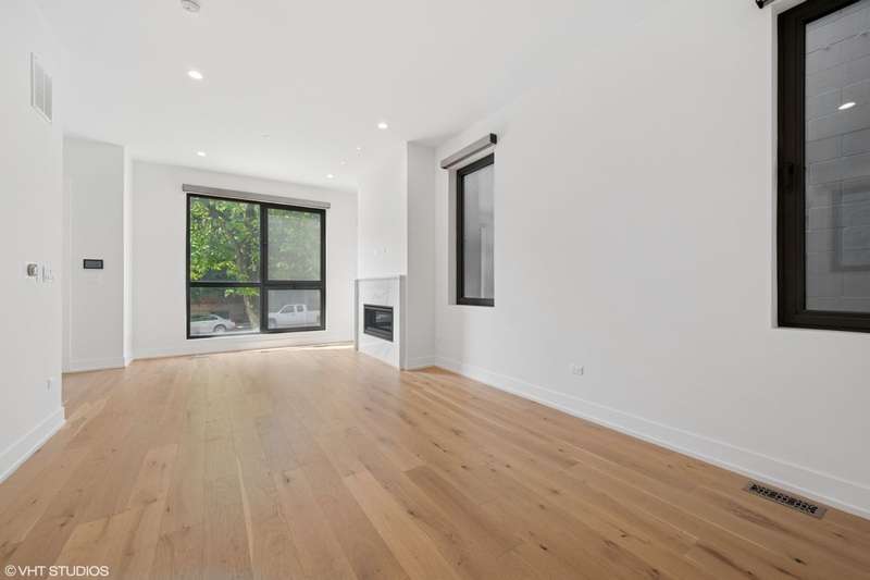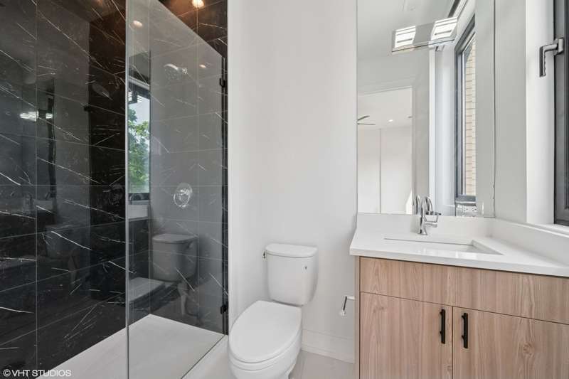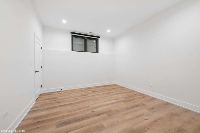 Newly constructed in 2023, this elegant single-family home in West Town seamlessly blends modern luxury with functional design. This 5-bedroom, 4.5-bathroom residence features a full rooftop deck, a garage deck, and a spacious grass front yard and backyard. Lumini windows and 6.5-inch wide-plank hardwood floors enhance the interior's sophistication. The open floor plan showcases a bright, south-facing living and dining area with a quartz-surround fireplace. The gourmet kitchen boasts high-end Thermador appliances, Brizo fixtures, and a large quartz island. Post-construction upgrades include high-end motorized window shades, custom closets, and dual HVAC systems for year-round comfort. The second floor offers three bedrooms, each with en-suite bathrooms, and a convenient side-by-side laundry closet with a countertop. The primary suite features two spacious closets and a spa-like bathroom with an extended double vanity, heated floors, a freestanding soaking tub, and a multi-jet glass shower. The lower level includes two large bedrooms, a recreation room with a den and wet bar, a full bathroom, extra storage, and an additional laundry hookup. The recreation room's den, enclosed by barn doors, provides versatile space for an office, gym, or guest room. Ideal for entertaining, the home features a stunning rooftop deck with skyline views and a backyard perfect for grassy turf or a paved patio. A two-car garage with an additional deck expands outdoor living options. Located in vibrant West Town, steps from West Loop, this home is surrounded by top-tier restaurants and boutique shops.