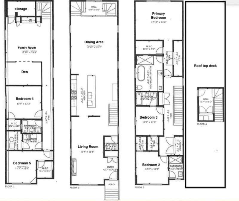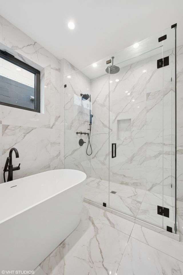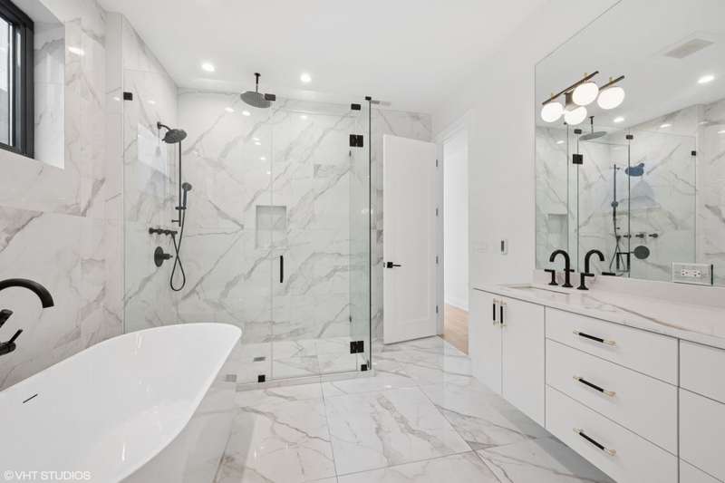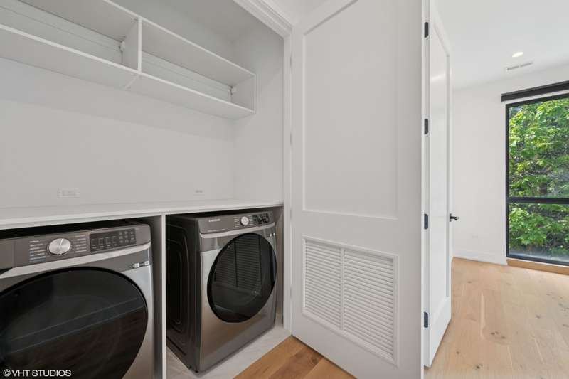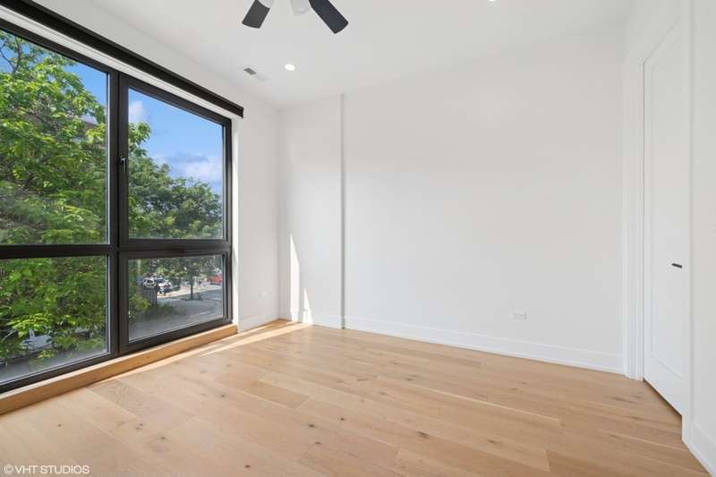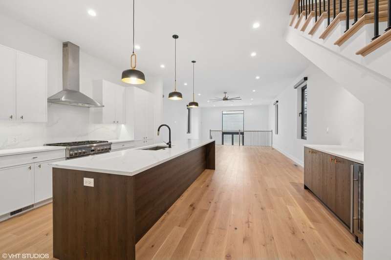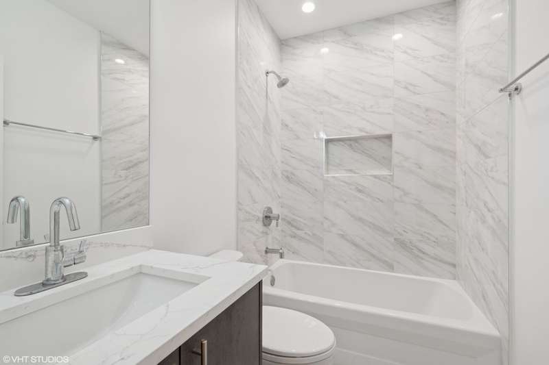 Newly constructed in 2023, this elegant single-family home in West Town seamlessly blends modern luxury with functional design. This 5-bedroom, 4.5-bathroom residence features a full rooftop deck, a garage deck, and a spacious grass front yard and backyard. Lumini windows and 6.5-inch wide-plank hardwood floors enhance the interior's sophistication. The open floor plan showcases a bright, south-facing living and dining area with a quartz-surround fireplace. The gourmet kitchen boasts high-end Thermador appliances, Brizo fixtures, and a large quartz island. Post-construction upgrades include high-end motorized window shades, custom closets, and dual HVAC systems for year-round comfort. The second floor offers three bedrooms, each with en-suite bathrooms, and a convenient side-by-side laundry closet with a countertop. The primary suite features two spacious closets and a spa-like bathroom with an extended double vanity, heated floors, a freestanding soaking tub, and a multi-jet glass shower. The lower level includes two large bedrooms, a recreation room with a den and wet bar, a full bathroom, extra storage, and an additional laundry hookup. The recreation room's den, enclosed by barn doors, provides versatile space for an office, gym, or guest room. Ideal for entertaining, the home features a stunning rooftop deck with skyline views and a backyard perfect for grassy turf or a paved patio. A two-car garage with an additional deck expands outdoor living options. Located in vibrant West Town, steps from West Loop, this home is surrounded by top-tier restaurants and boutique shops.