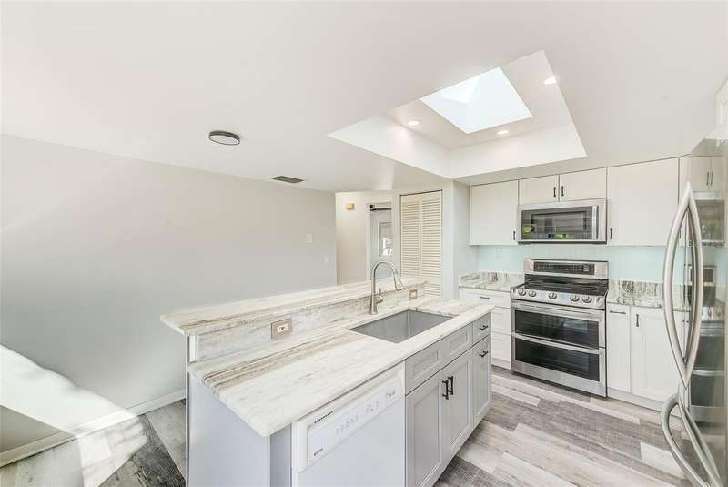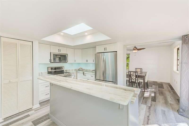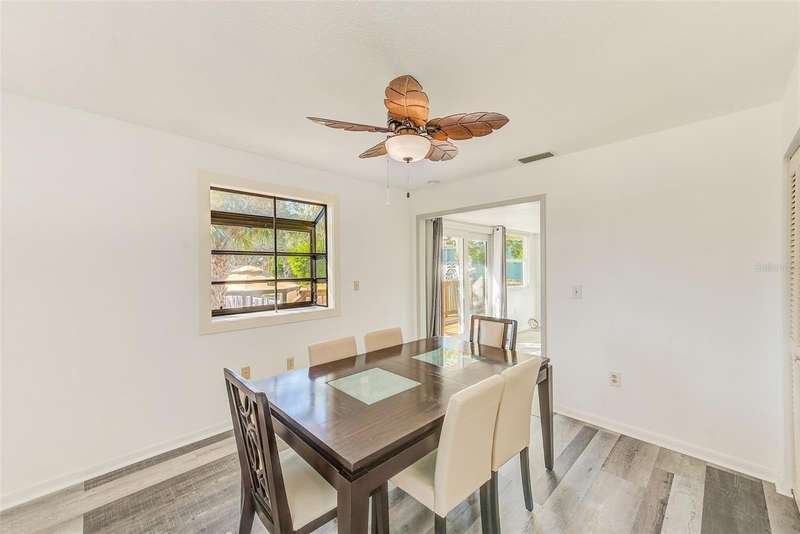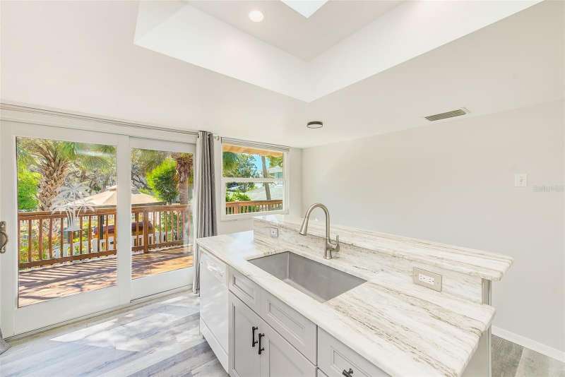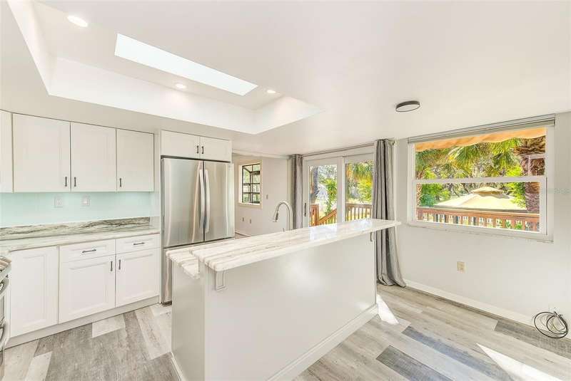 High and Dry in Crystal Beach, NEVER FLOODED! NO DAMAGE AT ALL FROM EITHER HELENE OR MILTON! The best part, wait for it, NO FLOOD INSURANCE REQUIRED! Lovely, elevated, split-level 2 bedroom, 2 bath home in the heart of Crystal Beach, a charming "Old Florida" community just a few blocks west of Alt.19 between Tarpon Springs and Dunedin. The main level features a large open living room, a spacious kitchen with a center island, a separate dining area, guest bedroom and bath. The primary suite is accessed from the living room by just a few steps up to the next level. An ample deck with a retractable sunshade opens off the kitchen and provides the perfect place for entertaining, grilling or just soaking up some of the great Florida weather. An enclosed deck, in the style of a "Florida Room" opens off the living room, a cozy space for afternoon napping or curling up with a good book. The home also includes a one car garage with additional covered parking available at the rear of the house with alley access. A shed provides extra storage space, room for a man-cave, or she-shed. The roof was replaced in 2016, impact windows installed in 2019, the kitchen was updated and upgraded in 2022, and the A/C replaced in 2023. This property is perfect for a primary residence, vacation home, or investment property. It's just a short walk from the Post Office, the community park, the Pinellas trail, beach, and the new pier (old pier destroyed by Helene). The Innisbrook Golf Resort featuring the Copperhead course, home of the PGA Tour's Valspar Championship is just a short hop away on Alt. 19. Oh, and don't forget the spectacular sunsets over St. Joseph's Sound are just outside the door. Like they say around here, "If you're lucky enough to live in Crystal Beach, you're lucky enough". Come see for yourself, and you won't want to leave.