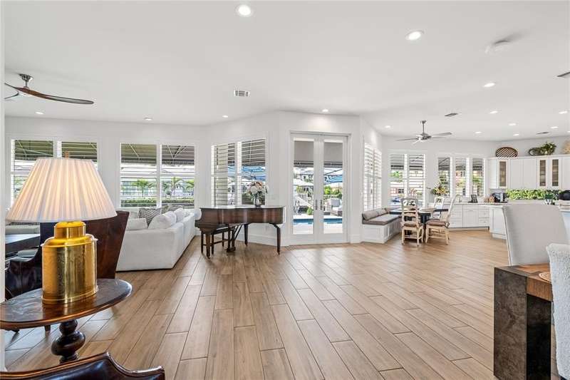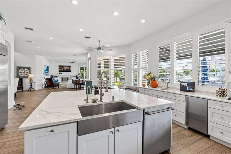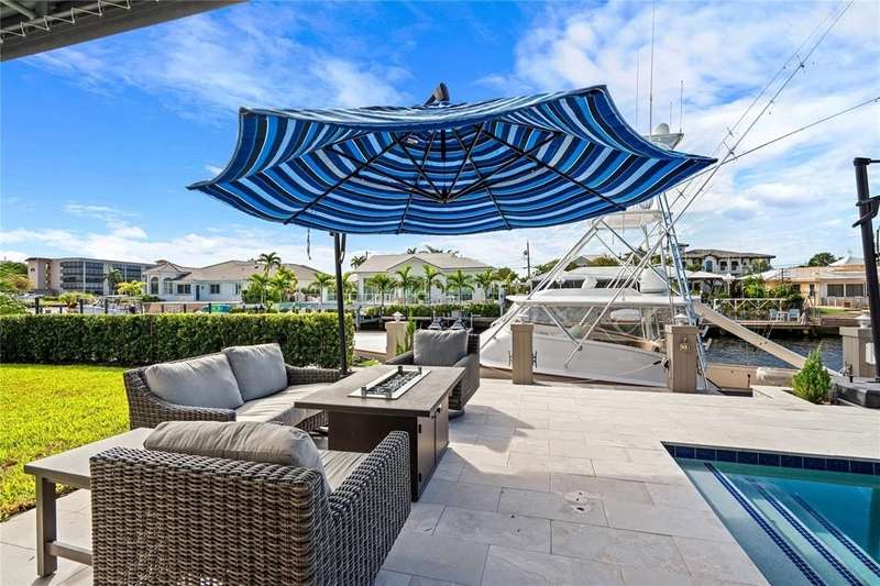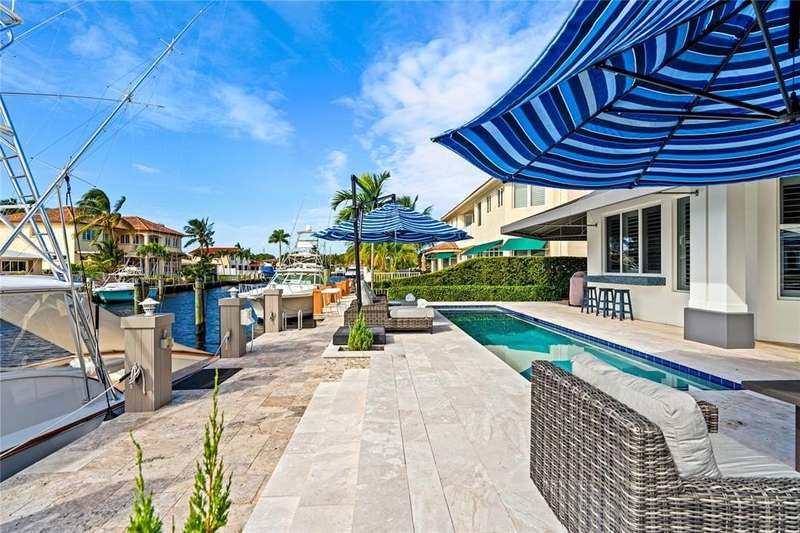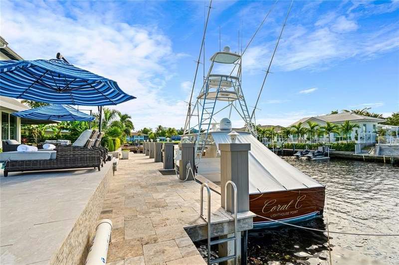 Coastal-Inspired Deepwater Estate sited one lot off the Intracoastal on 85' of waterfrontage. Formal foyer entrance with soaring ceilings & light-filled interiors. Gourmet chef's kitchen with luxe appliances, quartz countertops & gas cooktop. First floor living includes two bedrooms w/en-suite baths. Second floor master suite with dual closets, dual vanities & glass enclosed shower. Three additional bedrooms upstairs all w/en-suite baths. Other features include fireplace, cabana bath, upstairs family room, 2 bay garage & porcelain tile floors throughout and is generator ready. Outdoor entertaining awaits at the south-facing, heated saltwater pool with spillover spa, while boating enthusiasts will enjoy the 60’ concrete dock offering quick access to the Hillsboro and Boca Raton Inlets.