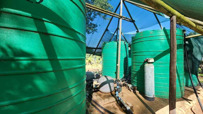 Step outside and discover your own private paradise. Three sparkling fish ponds teeming with life add a touch of whimsy, while a 60,000-liter JoJo tanks, complete with pumps and filters, ensures a constant supply of water for your verdant oasis. Three garages provide ample storage, while a sparkling pool beckons refreshing dips on warm summer days.