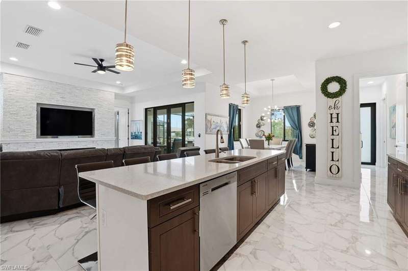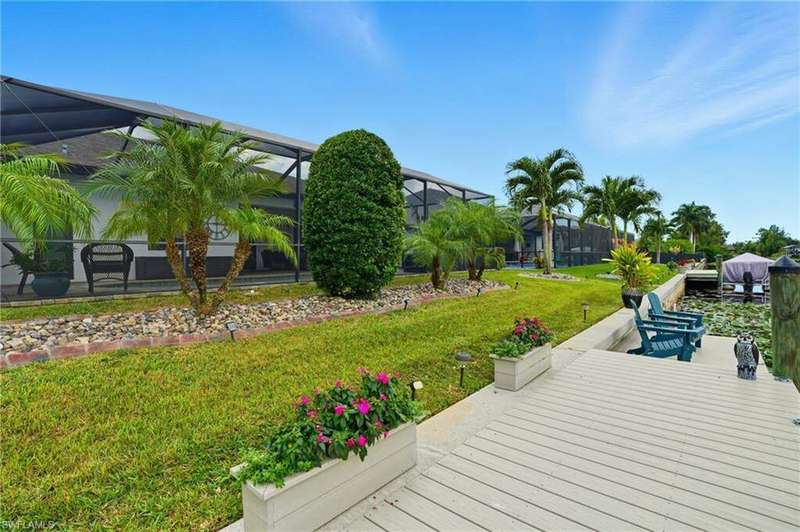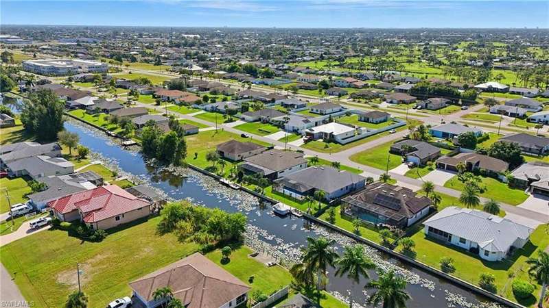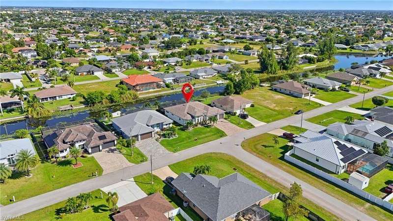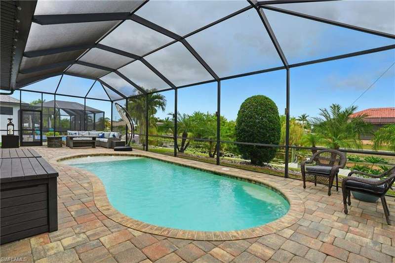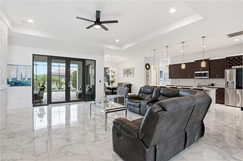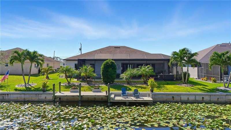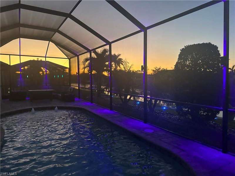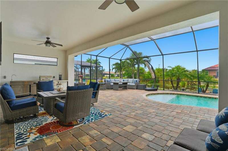 Meticulously maintained NEVER FLOODED canal-front POOL home offering 4 spacious bedrooms and 3 full bathrooms being sold TURNKEY in a prime Cape Coral location. Designed for comfort and style, this property showcases high-end finishes and a thoughtful layout, perfect for Florida living. Step inside to find oversized porcelain tile throughout, tray ceilings, and a custom stone fireplace that adds warmth and character to the living space. The kitchen features Corian countertops and a breakfast bar that opens to the main living area, making it perfect for entertaining. Step outside to your private backyard oasis with a saltwater pool and a fully equipped outdoor kitchen, ideal for relaxing or hosting gatherings. The spacious primary suite includes an en suite bath with separated dual vanities, a soaking tub, and a walk-in shower. Three additional bedrooms offer comfort and privacy for family or guests. Located on a peaceful canal, this home combines elegant design, functional space, and the laid-back Cape Coral lifestyle. Don't miss this exceptional opportunity!