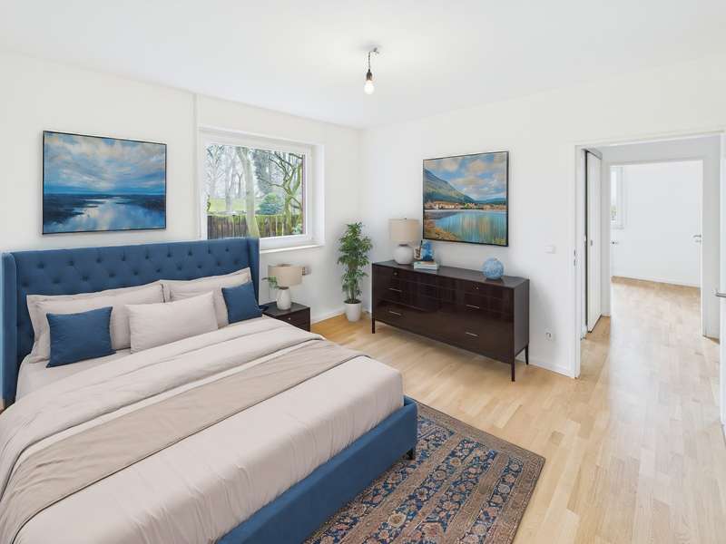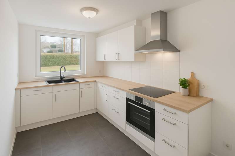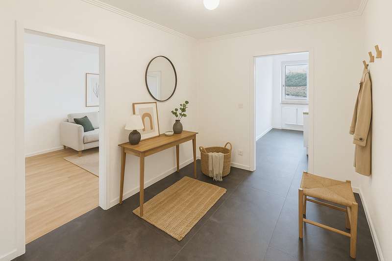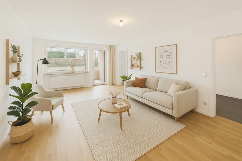 VON POLL IMMOBILIEN presents this newly renovated 3-room apartment in a sought-after location in Frechen-Königsdorf. The property is located in a well-kept, barrier-free accessible apartment building from 1983 with a total of 24 residential units. The apartment is currently unlet and can be used for owner-occupation or as an attractive investment. The raised first floor apartment impresses with its well thought-out room layout and pleasant living atmosphere. The spacious entrance area with ample space for a checkroom leads to the approx. 28 m² living area, which offers access to the sunny, south-facing loggia with a view of the greenery - a perfect place to relax. The adjoining kitchen is accessible from both the hallway and the living area. The living rooms were recently fitted with high-quality parquet flooring, while easy-care vinyl flooring with a slate look was laid in the hallway and kitchen. The daylight bathroom was modernized in 2013 and impresses with bright, timeless furnishings and a bathtub with shower enclosure. Two well-designed bedrooms offer versatile usage options. The basement of the building has its own cellar room, a bicycle cellar and several drying rooms. The apartment is easily accessible via the staircase or the elevator. The offer is rounded off by a garage in the garage courtyard with an electric door, which belongs to the apartment and costs an additional 12,000 euros.