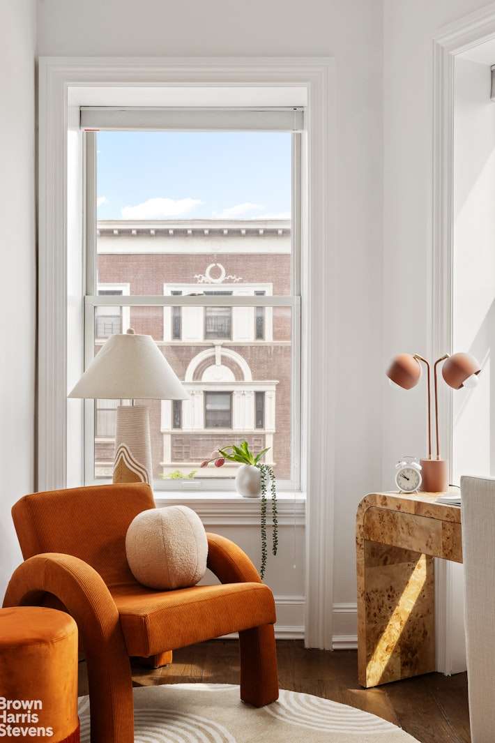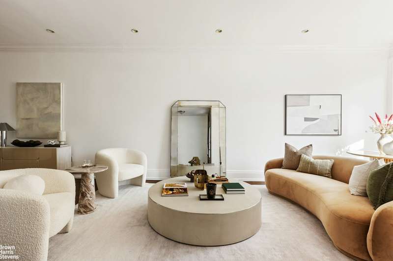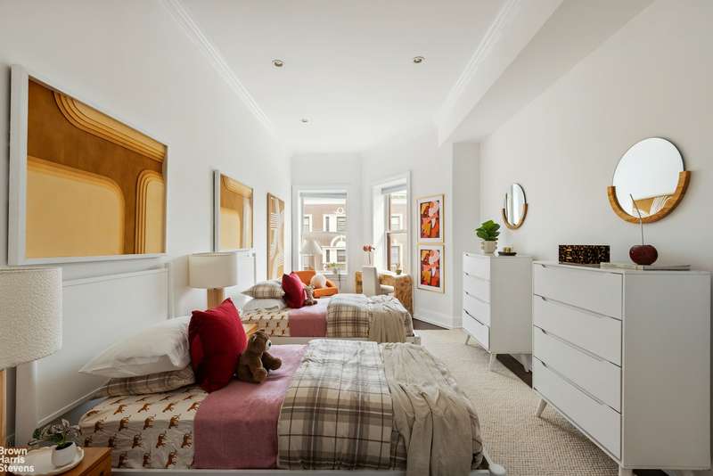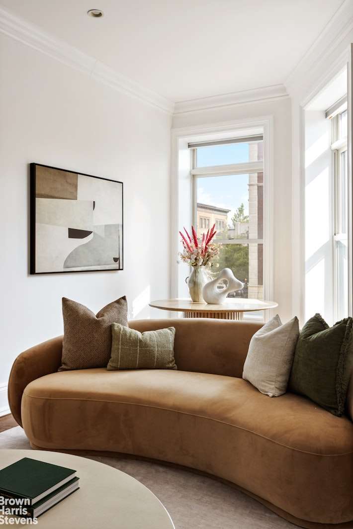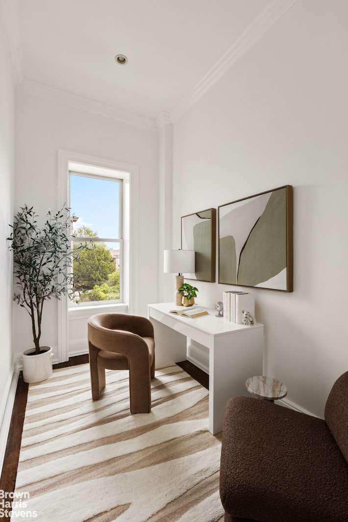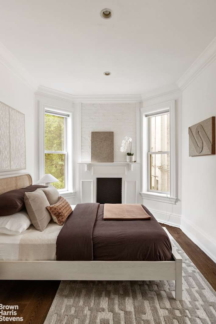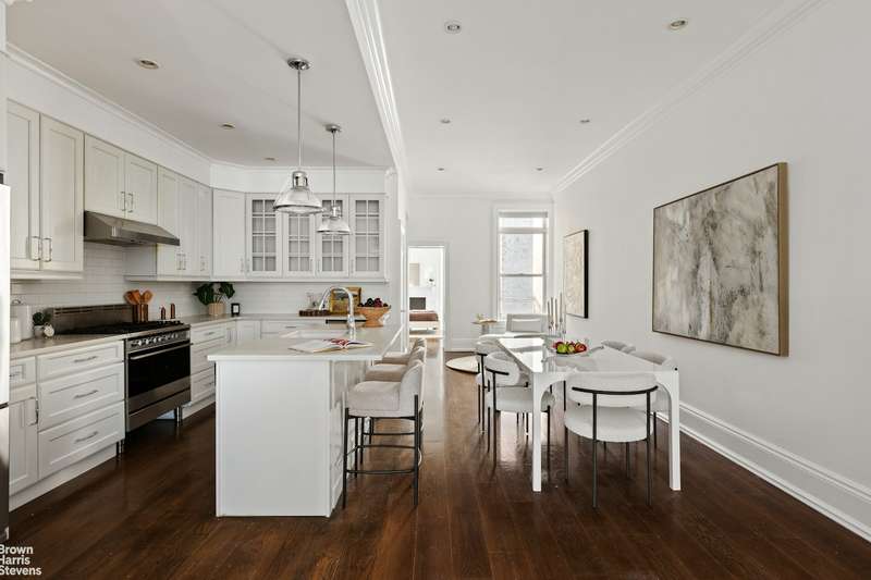 The upper duplex welcomes you with a grand parlor floor boasting an open-concept layout ideal for entertaining. Sunlight pours into the spacious living and dining areas through oversized windows, highlighting the white oak hardwood floors and intricate crown moldings. The well-appointed kitchen features Caesarstone quartz countertops, a classic subway tile backsplash, custom cabinetry, and a full suite of stainless steel appliances-including a gas range and hood, refrigerator, dishwasher, and wine cooler.