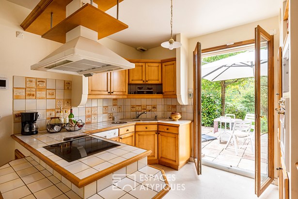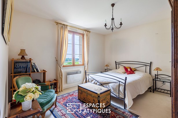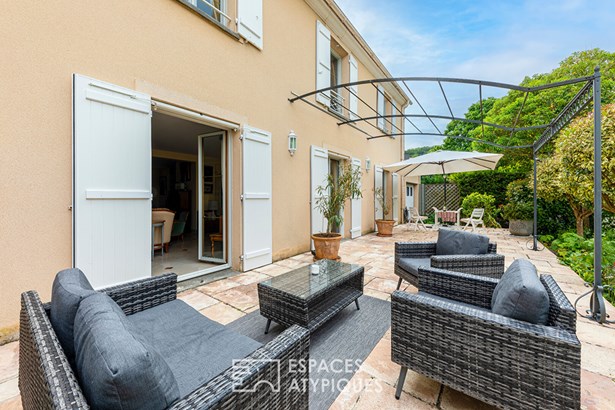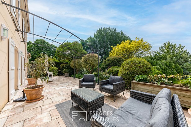 Outside, the Bradstone stone terrace extends the living spaces and invites suspended moments facing nature, sheltered from view. The landscaped garden, designed like a living painting, evolves with the seasons and promises a total immersion in serenity. Here, the gaze is lost between sky and greenery.