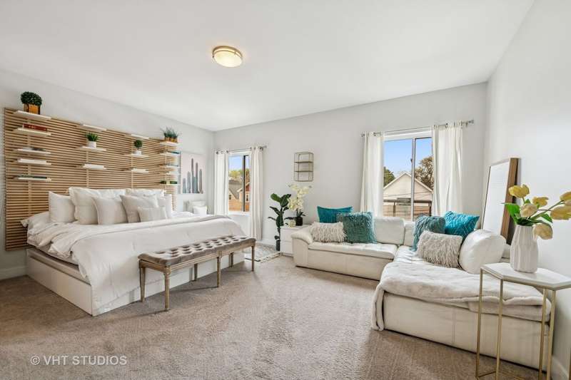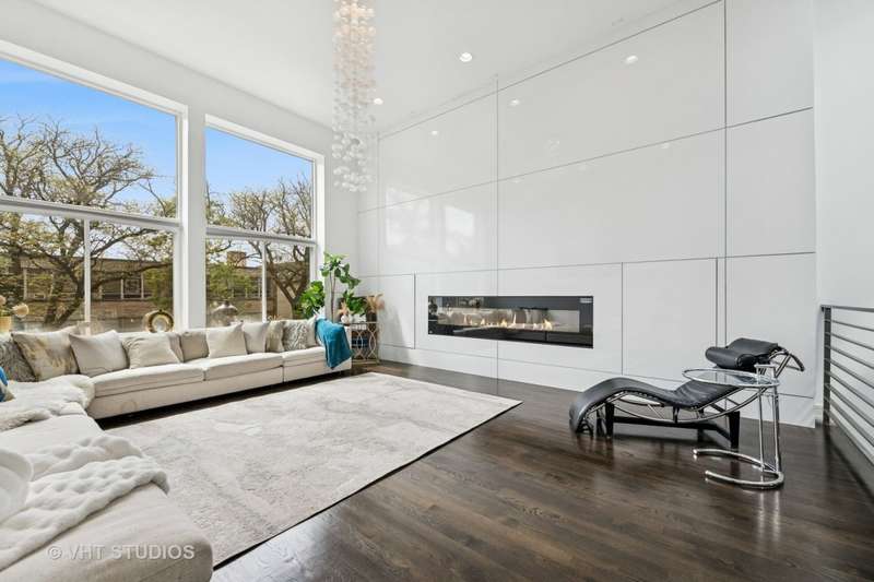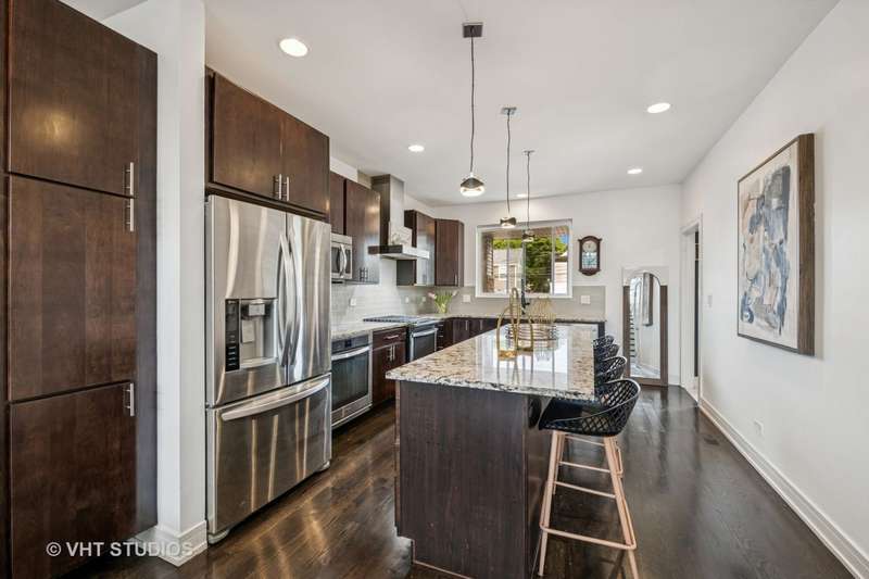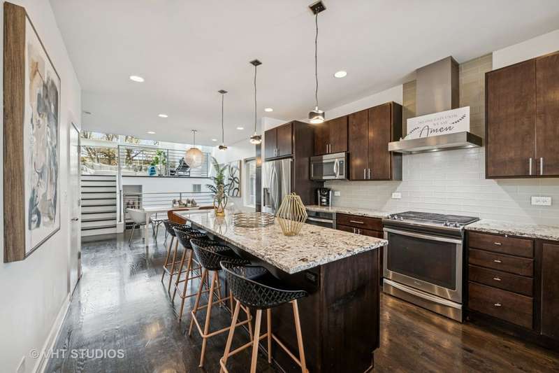 Step into a truly exceptional four-bedroom, three bath single-family home, now on the market for the first time since its construction. Thoughtfully designed to defy the typical tri-level layout, this residence spans six distinct levels, each offering its own gathering space and the flexibility to be styled or purposed differently. From relaxed movie nights, billiards and cocktails or dinner parties, the home's versatile floorplan is tailored for seamless family living and gracious entertaining alike. Each floor of this multi-level home can be styled or purposed uniquely, offering the freedom to create separate living zones, whether an elegant formal lounge, a cozy family den, a home office, or a creative studio on a different level. Soaring 20-foot ceilings and warm hardwood floors sets the stage in the common areas, while the custom floor-to-ceiling retrofitted cabinetry and a decorative fireplace make the main living area truly memorable. The open kitchen/dining level overlooks the second living area and includes a full-size island with wine fridge, dual ovens, and appliances, ideal for holiday dinners and daily meals alike. The top-floor primary bedroom is spacious enough for a seating area and features a custom walk-in closet and bathroom with dual vanities, which all provide a tranquil retreat at the end of each day. Skylights and plentiful windows ensure sunshine fills every room, highlighting the home's volume and details throughout. The lower level boasts a dedicated family theater, creating an ideal space for movie nights or sports events with family and friends. Step outside to a large upper-level terrace, directly off the kitchen, and a garden-level covered porch, both perfect for summer barbecues or evening gatherings. The sizable garden is great for children, pets and most elaborate city gardening ideas. Nestled in a vibrant neighborhood this home is just minutes from the Blue Line, 606 Trail, and a host of trendy restaurants and cafes. Whole Foods and other amenities are nearby, making every day errands a breeze. With quick access to both city living and neighborhood charm, this home offers a blend of convenience.