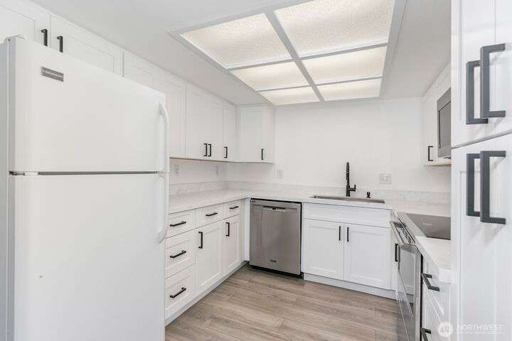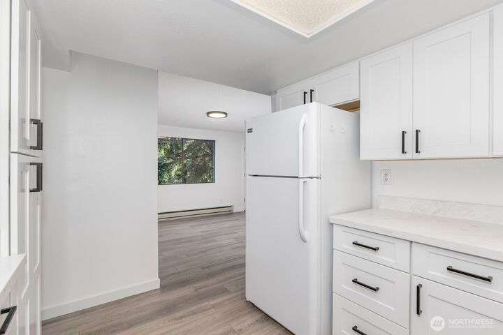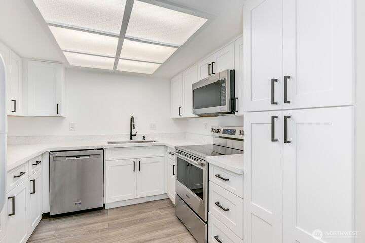 Welcome to Cascade Views amazing ground level no stairs unit! Only 7 units on a shy 1-acre lot! Brand new interior from top to bottom! Living/dining area showcase a brick heatolator fireplace. All new flooring, doors, woodwork, light fixtures, hot water tank & new paint throughout. New light & bright kitchen w/ new soft close cabinets, quartz counters, stainless appliances, sink & disposal. All new bath w/ new fixtures, quartz counter, & walk-in shower. Laundry w/ full size washer/dryer. Spacious bedroom & large closet w/ full length mirrored doors. 2 dedicated parking spaces & private side yard right outside your front door! Parklike area across from unit, is perfect for walking your furry friends. Amazing home & price, so don't miss out!