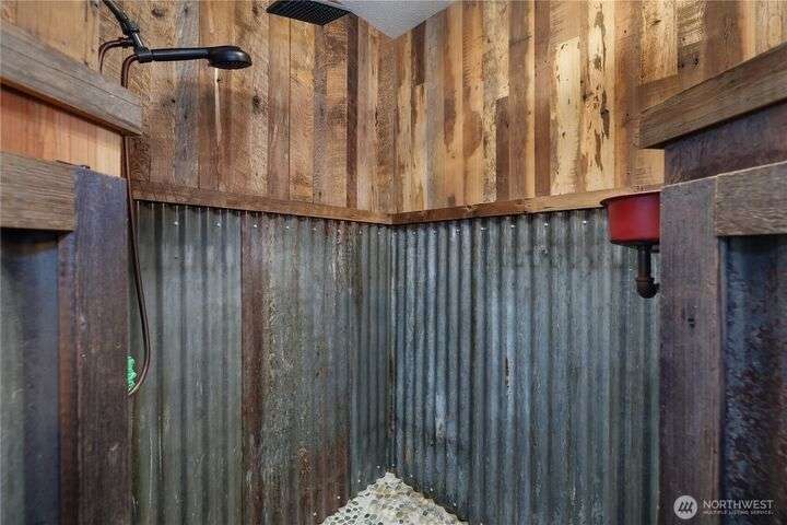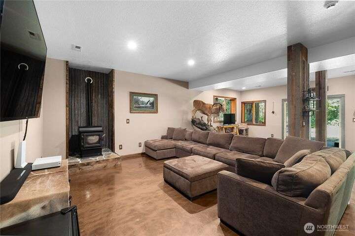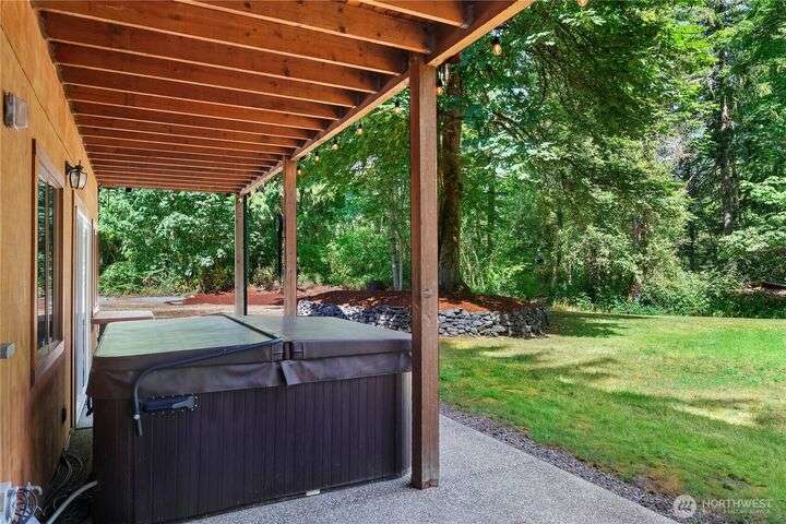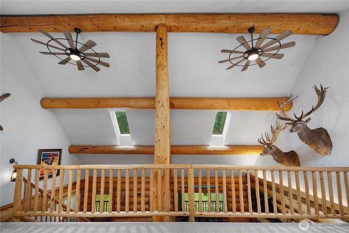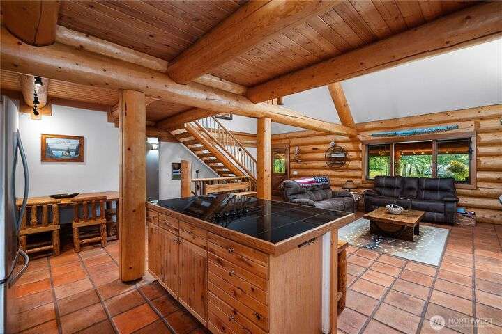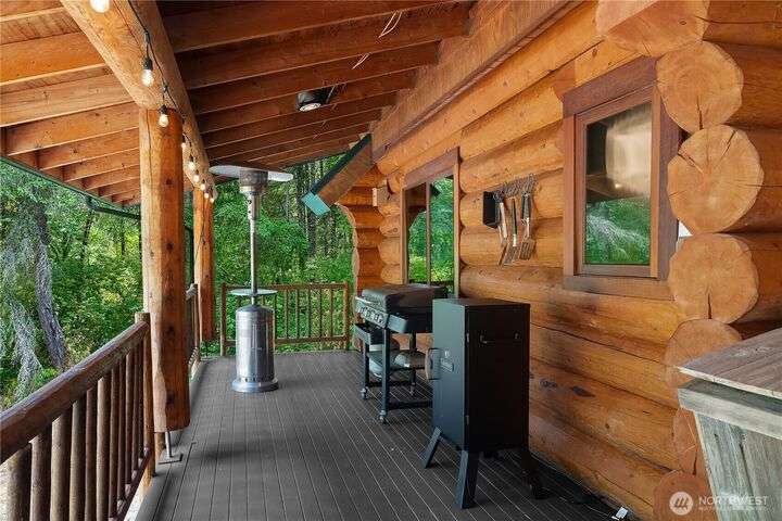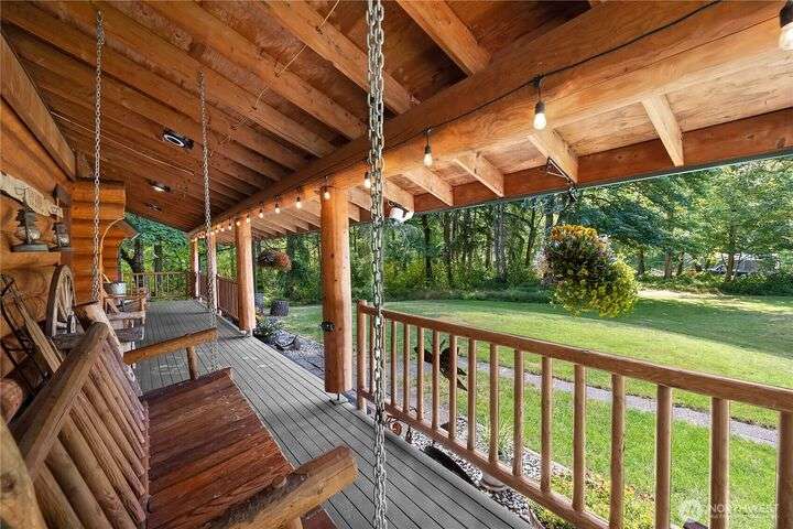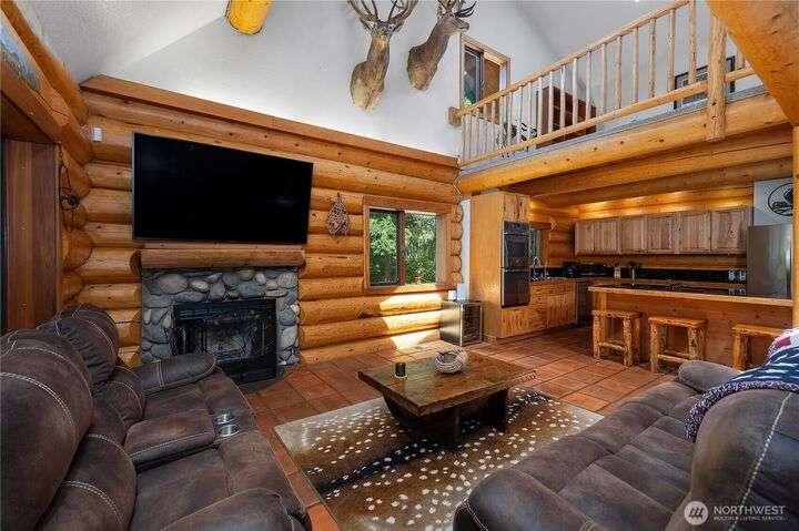 A captivating 3544 sq ft log home offering rustic charm and modern luxury. This Pacific NW retreat provides a privately gated and secluded 10+ acres. The multi-level functional design has 3 bedrooms, a den & 3 bathrooms. Large windows and skylights invite natural light and offer breathtaking views of the surrounding landscape. The gourmet kitchen boasts custom wood cabinetry, high-end appliances, and stunning countertops. A focal point of the living area is the stone fireplace, perfect for cozy nights and gatherings. The primary suite is a private sanctuary, complete with spa-like bathroom, walk-in closet, and dedicated balcony. Multiple viewing decks and patio with hot tub for outdoor enjoyment. Bonus: Oversized garage with shop.
