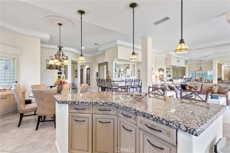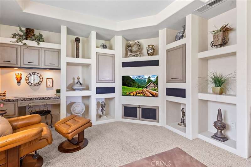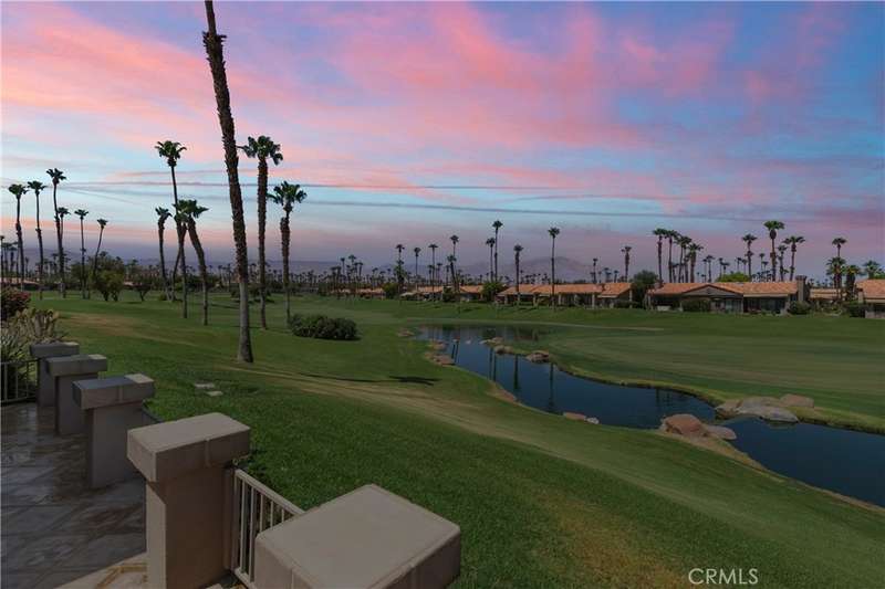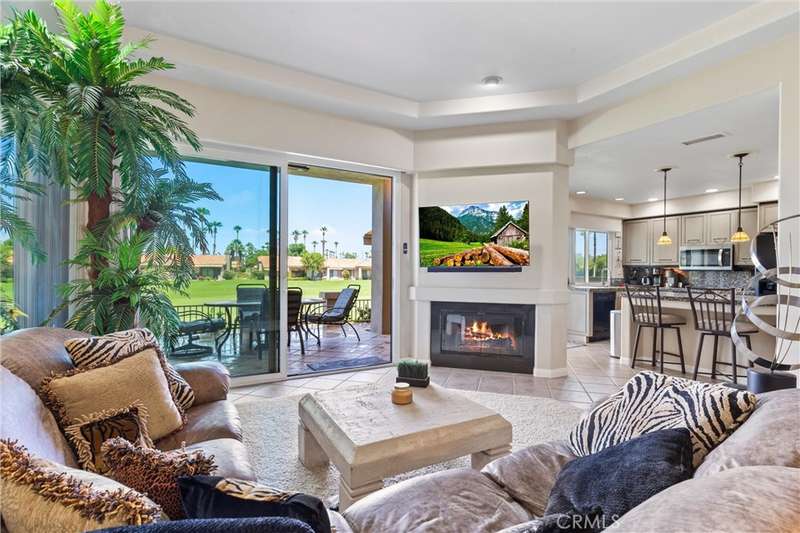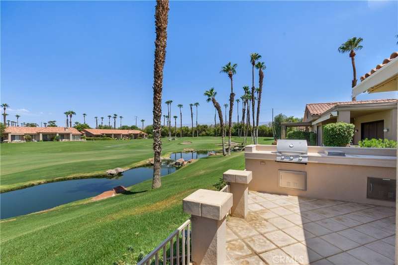 Recent upgrades include newer windows and sliding doors, outdoor counters with built-in barbecue, remote retractable awning , radiant heater , a misting system, and more. Tile and carpet flooring flow throughout, with direct access to a large patio overlooking the golf course and incredible sunsets with mountain views.