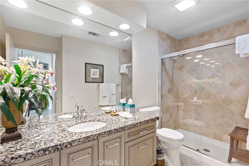 The primary suite includes a spa-like bathroom, generous closet space, and a private courtyard. A secondary bedroom is en suite, while the third bedroom is currently being used as a den/media room.