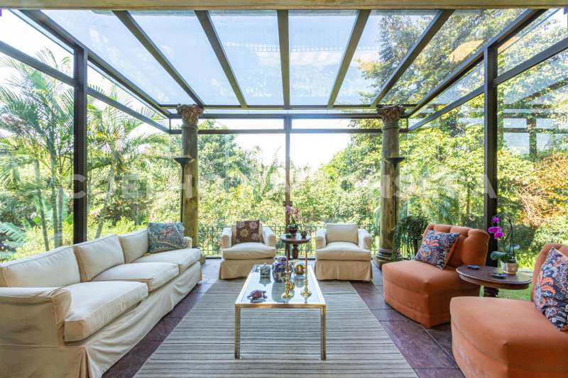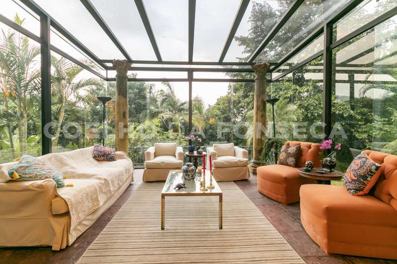 Sala de inverno envidraçada, aconchegante, rodeada de verde.