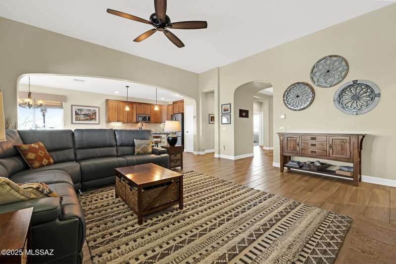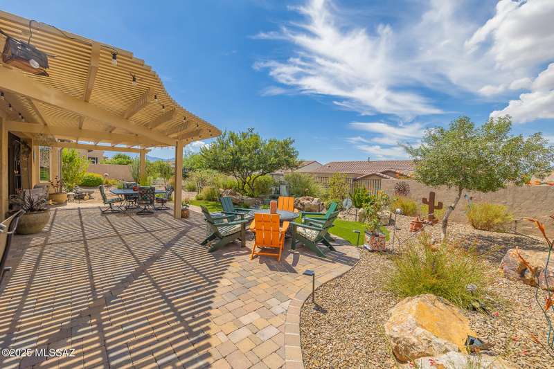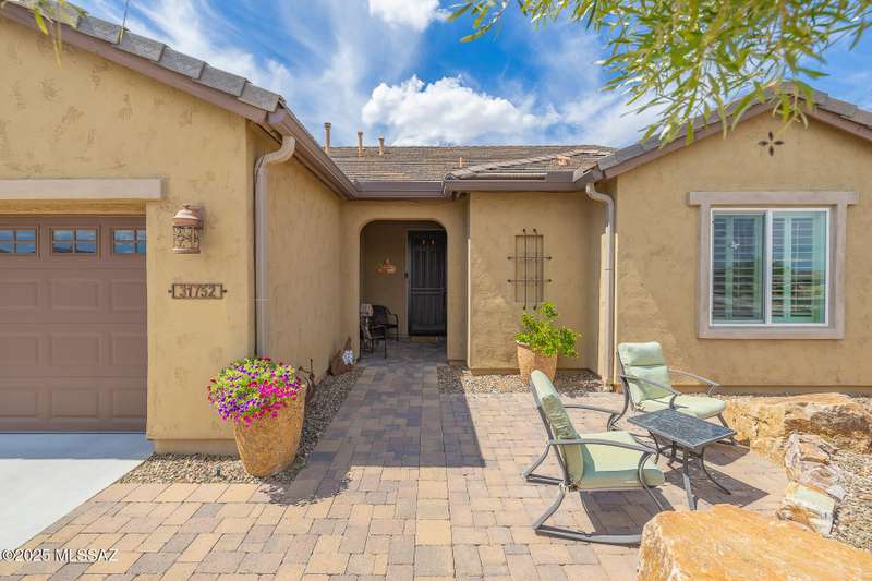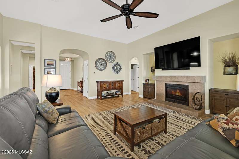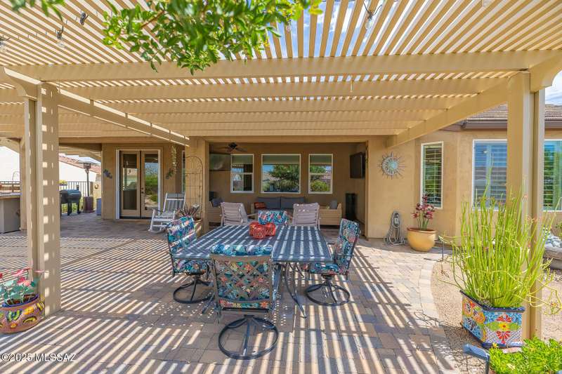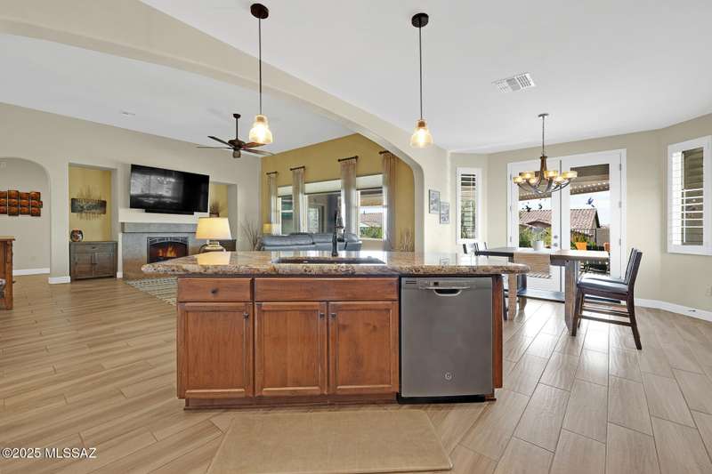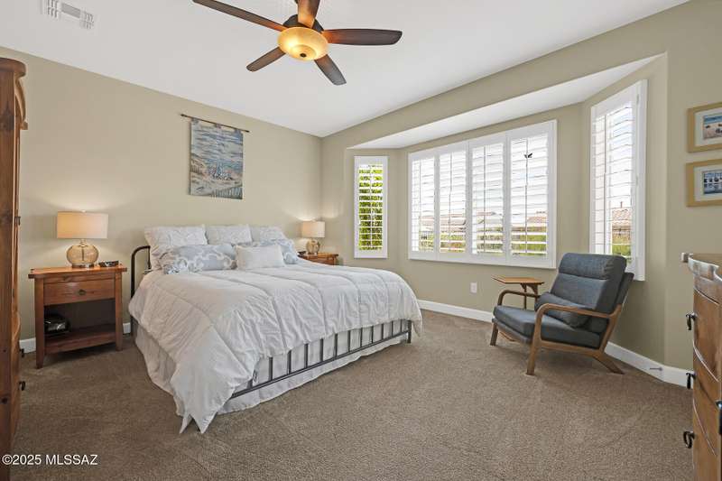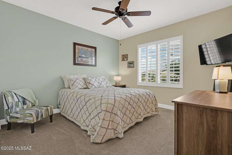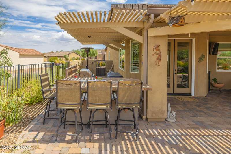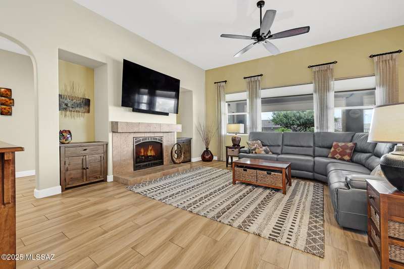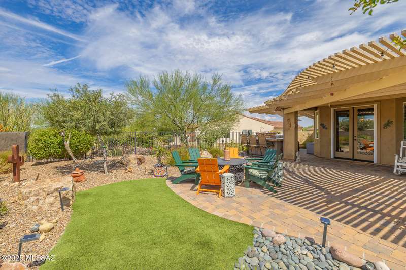 Gorgeous Artesa model on premium, elevated lot with common area to one side is situated close to all amenities while offering a spectacular rear yard plus Catalina views. This 2BD/2BA +Den (1,980 sq ft) split bedroom plan boasts energy-efficient Solar (builder installed), wood-look ceramic plank tile with carpeted bedrooms, wood shutters and rich-hued cultured marble bath vanities. Inviting foyer flows to an open concept Great room hosting walls of windows, media wall and upgraded fireplace w/ Travertine surround. Fabulous chef's kitchen features 2'' bullnose granite counter on enlarged island, matte SS appliances, electric induction stove, pecan cabinetry and butler's pantry with sink. Primary suite accessing rear patio is highlighted by large bay window, dual sink vanity, walk-in tiled