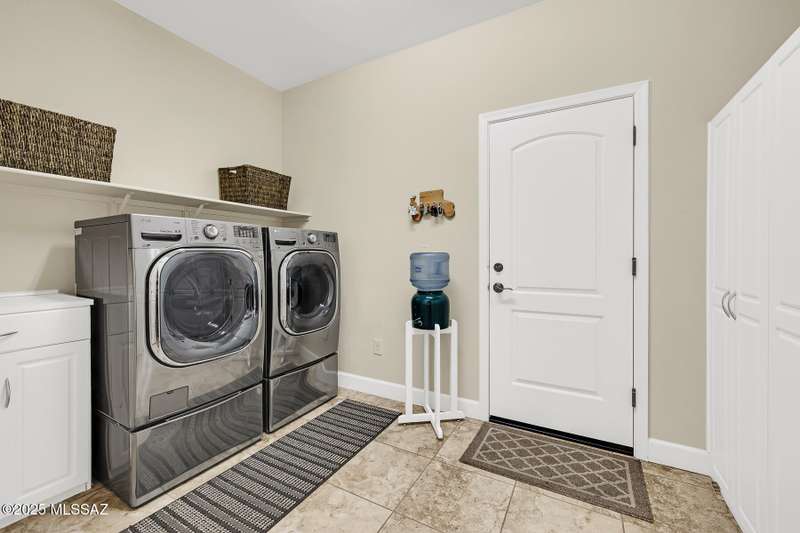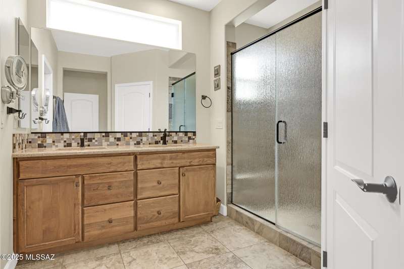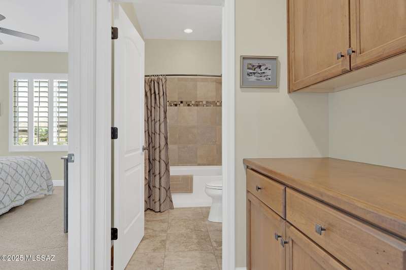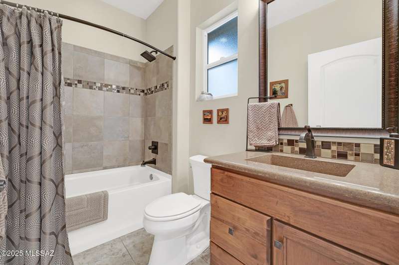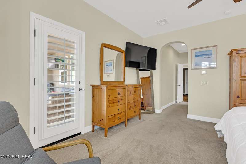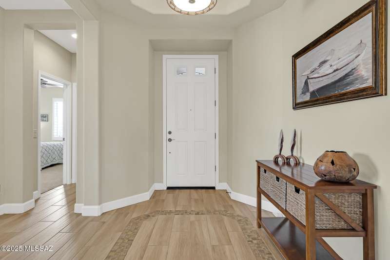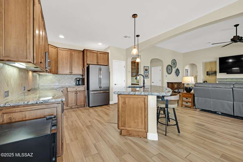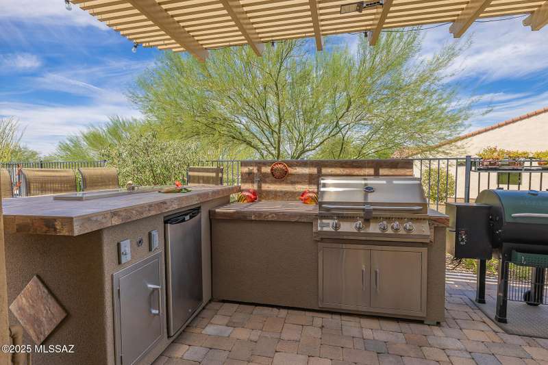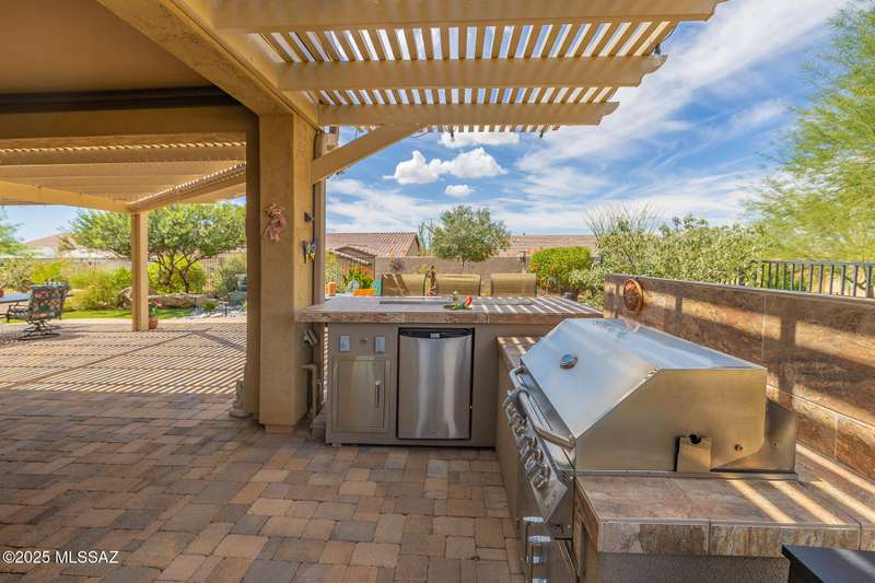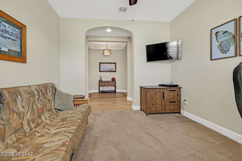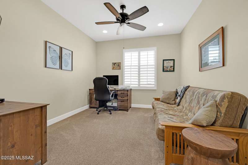 Gorgeous Artesa model on premium, elevated lot with common area to one side is situated close to all amenities while offering a spectacular rear yard plus Catalina views. This 2BD/2BA +Den (1,980 sq ft) split bedroom plan boasts energy-efficient Solar (builder installed), wood-look ceramic plank tile with carpeted bedrooms, wood shutters and rich-hued cultured marble bath vanities. Inviting foyer flows to an open concept Great room hosting walls of windows, media wall and upgraded fireplace w/ Travertine surround. Fabulous chef's kitchen features 2'' bullnose granite counter on enlarged island, matte SS appliances, electric induction stove, pecan cabinetry and butler's pantry with sink. Primary suite accessing rear patio is highlighted by large bay window, dual sink vanity, walk-in tiled