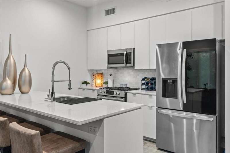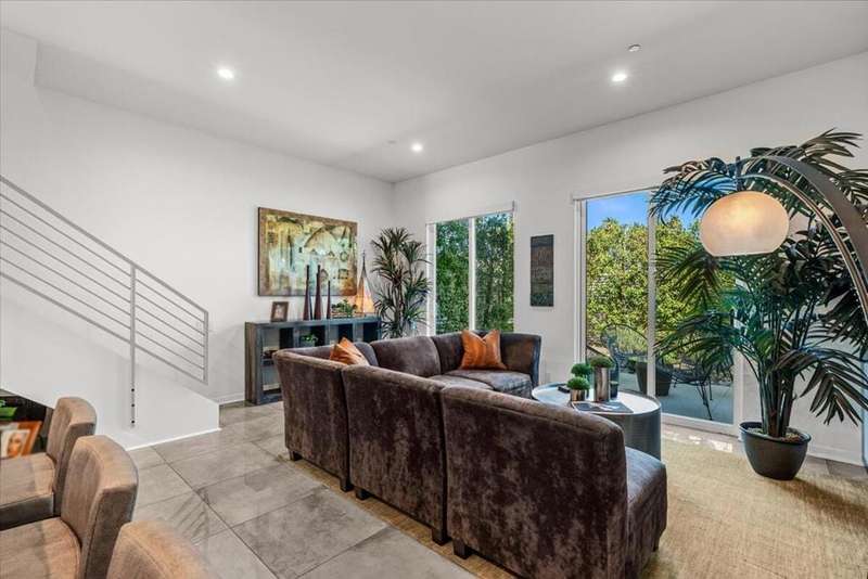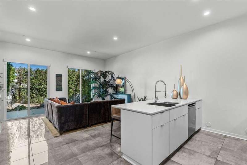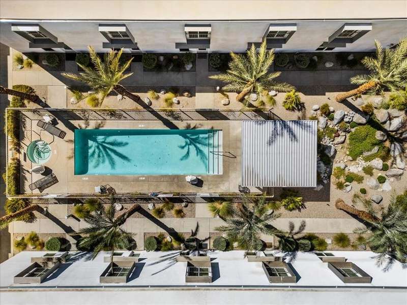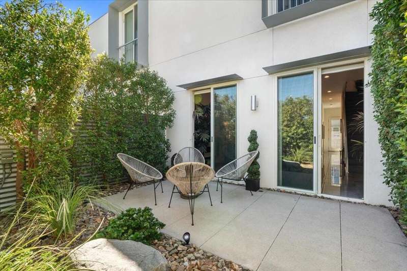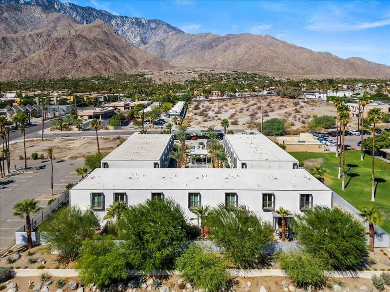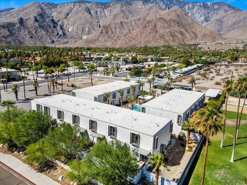 Welcome to unit 303 at Palm 2150, where contemporary Bauhaus elegance meets true Palm Springs living. This stunning 3-bed, 3-bath townhome spans approximately 1,440 sq ft of refined indoor/outdoor space -- perfectly suited for full-time living, a stylish getaway, or an income-producing property.Step inside to an open-concept layout where the kitchen, dining, and living areas flow seamlessly under expansive windows and glass doors, bathing the interiors in natural light. Stylish modern floor tiles, linear electric fireplace, sleek quartz countertops, stainless steel appliances, and frameless contemporary cabinetry elevate the space with modern minimalism.The two upstairs bedrooms offer privacy and tranquil mountain-lined views, with the primary suite delivering en suite luxury. Each bath reflects high-end design and function.Outdoor living is a delight here: enjoy your own private patio off the main living area, perfect for entertaining or quiet mornings. As part of the exclusive Palm 2150 community (17 townhomes), this residence also enjoys access to the lush courtyard with palm-lined landscaping, 45-foot pool & spa, lounge areas, and common gardens -- an idyllic backdrop for relaxed living.Centrally located on Zanjero Road, you're minutes from all Palm Springs has to offer -- restaurants, art, culture, desert adventures.Don't miss this rare opportunity to own a state of the art, architecturally inspired townhome that harmonizes modern design, outdoorsy charm, and prime Palm Springs location.
