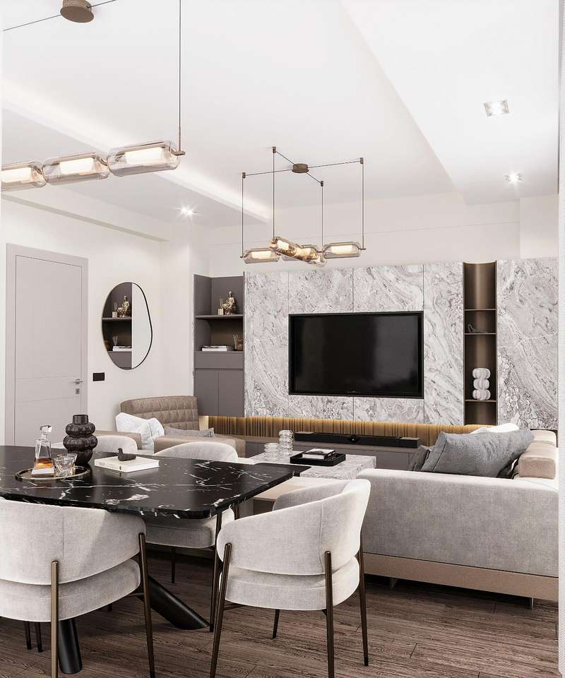 The apartments have underfloor heating system, natural gas, built-in set, steel door, electric Equipped with blinds, air conditioning infrastructures, lacquered doors and kitchen cabinets, porcelain kitchen countertops, shower cabin, spot led lighting, central satellite TV system.
