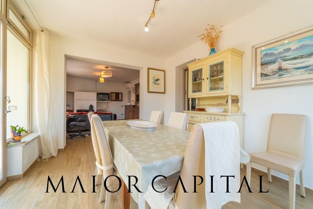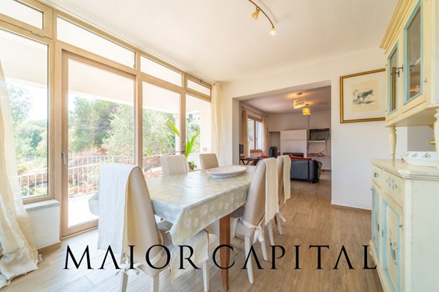 The villa is arranged on a single level and features an extremely bright dining area, enhanced by large windows overlooking the greenery. The glass surfaces highlight the view and allow natural light to filter in throughout the day, creating airy, welcoming, and relaxing spaces. The wood-effect porcelain stoneware flooring enhances the Mediterranean style of the house, combining practicality with aesthetic value. Its natural tone harmonizes with the furniture and the surrounding landscape, strengthening the visual connection with nature. Completing the living area are a separate kitchen and a living room, perfect for convivial moments.