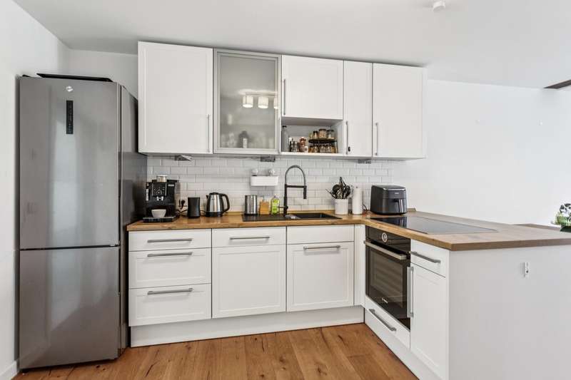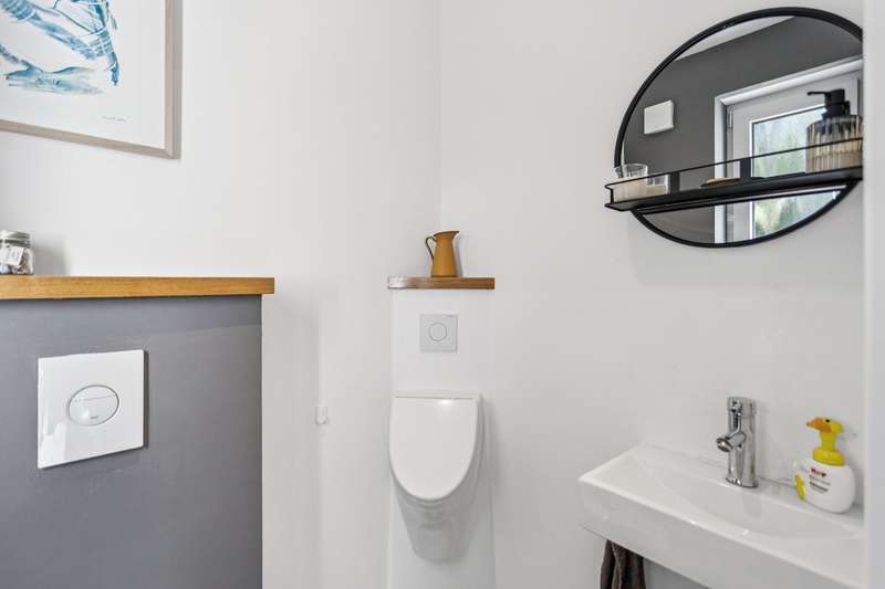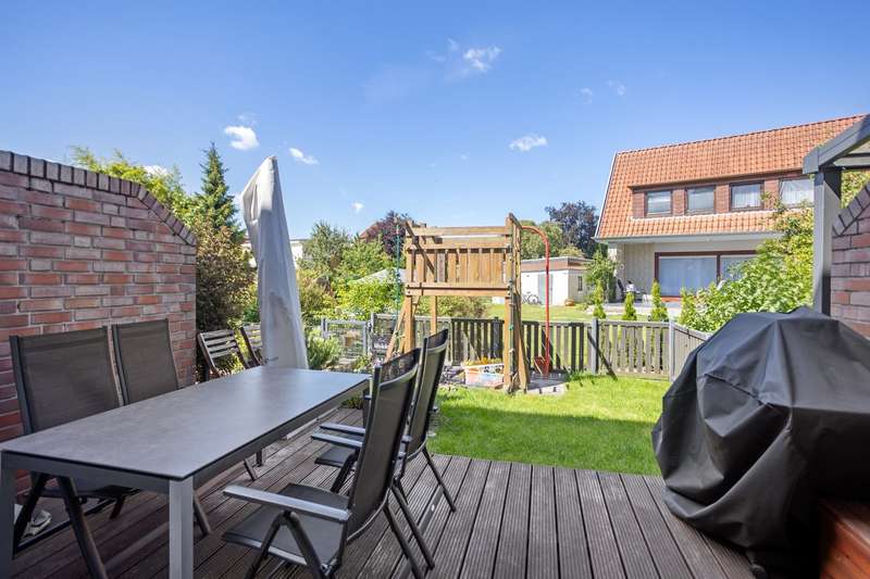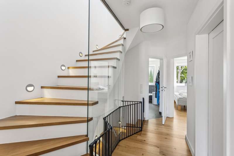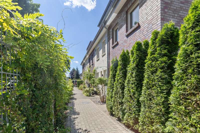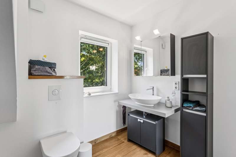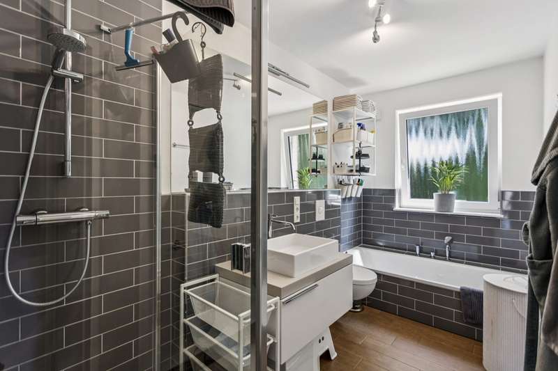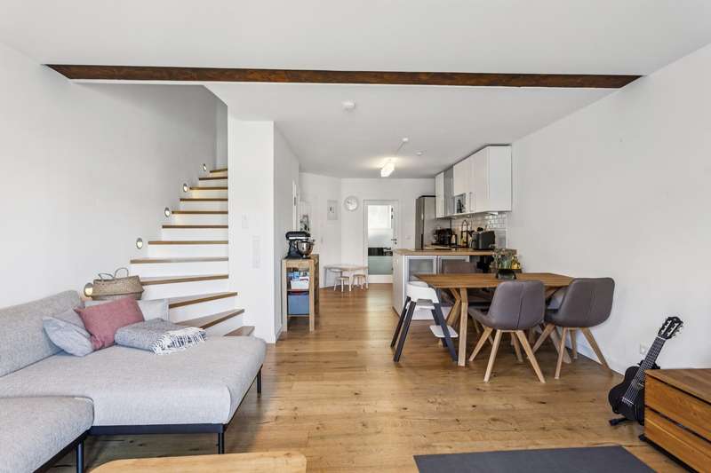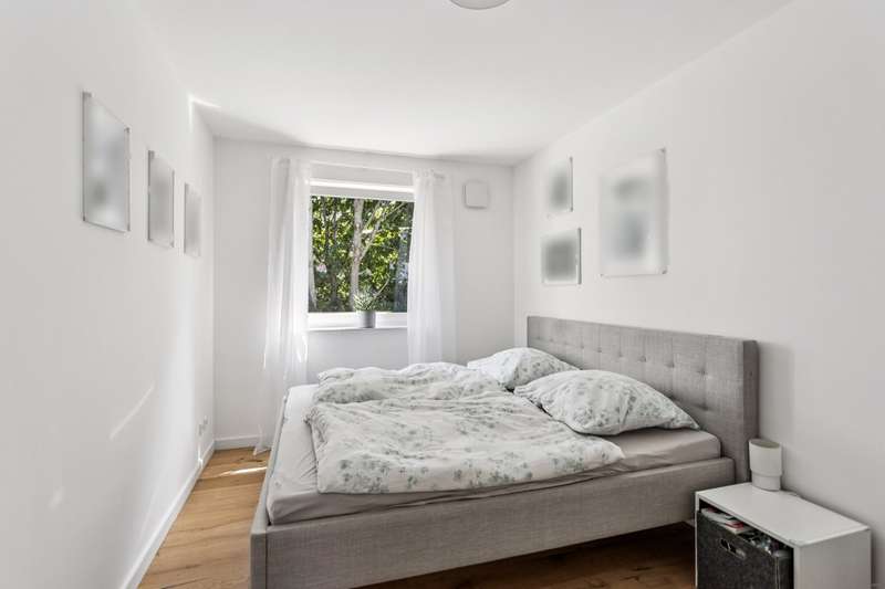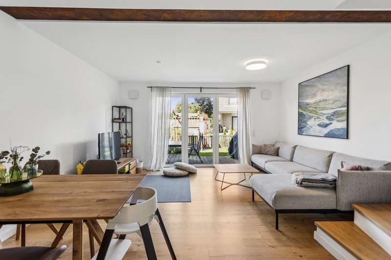 This charming and very beautiful mid-terrace house was built in 2016 and complies with the KfW Efficiency House 70 standard. Thanks to this energy-efficient construction method, the house requires around 30% less primary energy than a comparable reference building in accordance with the German Building Energy Act (GEG). The property is divided up in accordance with the German Condominium Act (WEG) and impresses with its modern architecture and well thought-out room layout. Upon entering the house, you are greeted by a stylishly tiled entrance area with space for a checkroom. A practical guest WC is also located in the entrance area. Straight ahead is the open-plan living and dining area with an elegant, white fitted kitchen. The generous window fronts create a bright and friendly atmosphere. From here you have direct access to the terrace and the well-tended garden - ideal for relaxing hours outdoors. A staircase with oiled oak floorboards leads to the second floor. A special highlight is the large pane of laminated safety glass, which stylishly complements the open staircase area. Here you will find two spacious bedrooms, a daylight bathroom with bath and shower and a utility room with a technical center. The top floor rounds off the space perfectly. A spacious gallery with access to the roof terrace creates a special living atmosphere. The top floor also offers a guest room or study and a further bathroom with shower. This attractive property offer is rounded off by a garage and an additional parking space. The property is currently rented out and is ideal as a long-term investment for investors who value modern construction quality and good rentability.