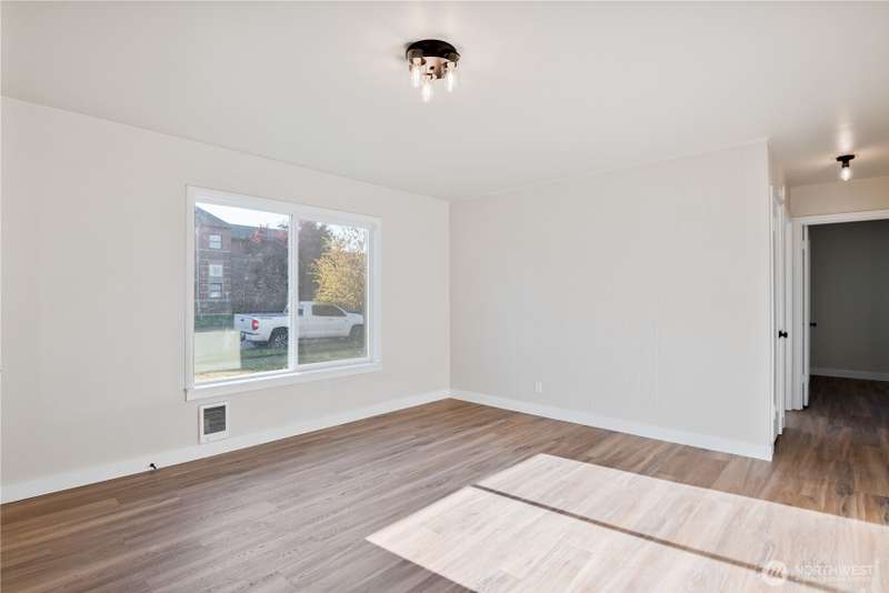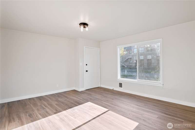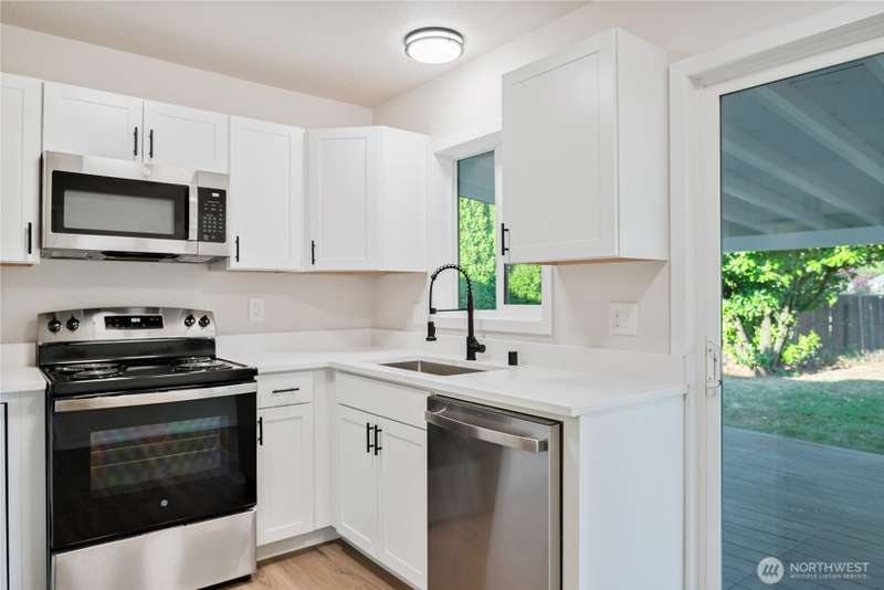 Freshly remodeled one level home w/private fully fenced back yard! Pristine home boasting 2 large bedrooms, updated bathroom w/new fixtures, light filled living room w/picture window, beautiful kitchen w/new cabinetry-quartz countertops-under mount sink-stainless steel appliances & slider to large covered Trex deck, new luxury vinyl floors throughout, new vinyl windows, 30 year architectural roof, fresh interior & exterior paint, 240 SF garage with garage door opener and a well groomed yard. The home is conveniently located to parks, shopping, restaurants, I-5, and schools.