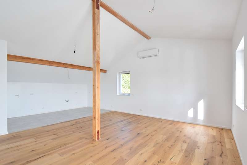 This modern, bright 3-room apartment is located in a quiet area of Limburgerhof. The building has been extensively renovated and is now available for first-time occupancy. An elevator takes you comfortably to the top floor, a hallway leads to the open-plan kitchen and living area. Large windows bring in plenty of light, even in the darker months of the year. From here you have access to the balcony, where you can relax on sunny days. Two further rooms can be arranged according to your needs as bedrooms, children's rooms or studies. The daylight bathroom is equipped with a bathtub and a floor-level shower. A guest WC completes the floor plan. The building is sustainably supplied with electricity via a photovoltaic system, while a heat pump ensures pleasant temperatures via the underfloor heating and low energy costs overall. A storage room is available in the basement. An outdoor parking space where you can park your car completes the offer.