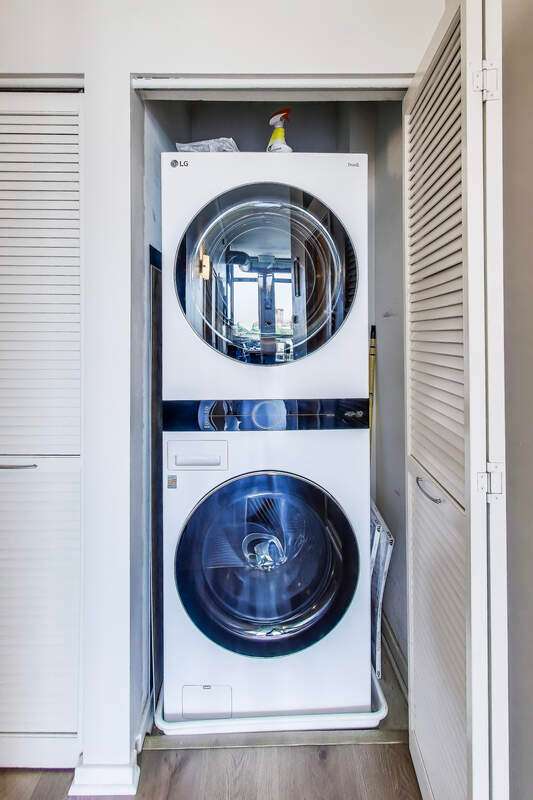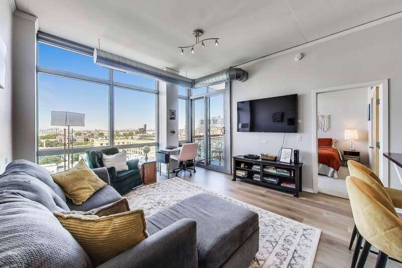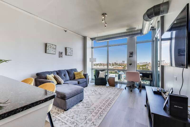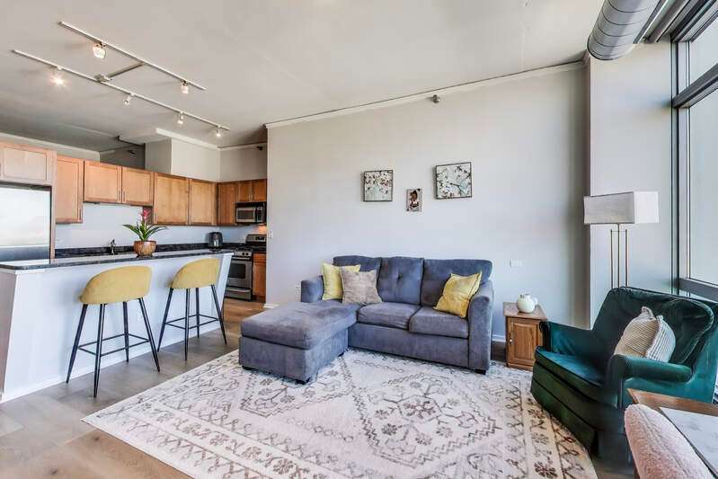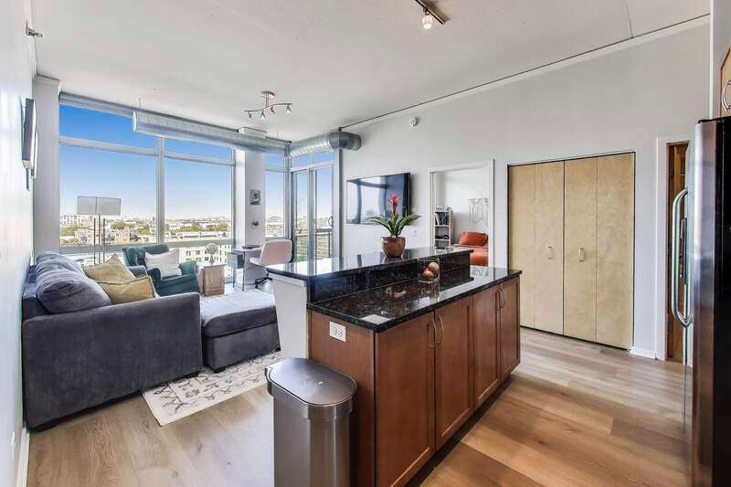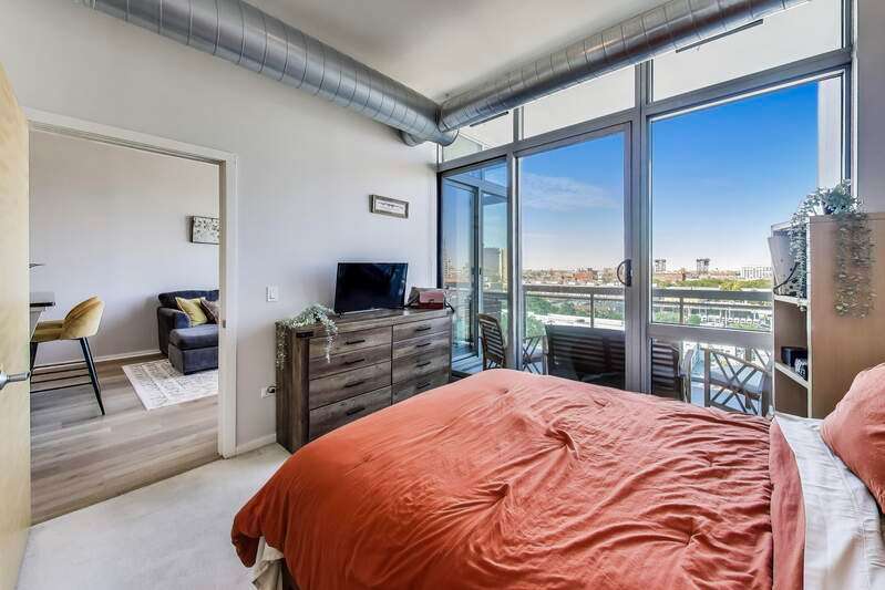Enjoy stunning city views from this stylish high-floor 2 bedroom, 1 bath home in a modern South Loop building along vibrant Michigan Avenue! Floor-to-ceiling windows fill the space with natural light, highlighting the open layout and tall ceilings. The bright living room flows seamlessly to a spacious glass-inset balcony-perfect for entertaining or relaxing while watching the sunset. The updated kitchen features abundant cabinet space, stainless steel appliances, and a large island with seating. The generous primary bedroom offers two closets and direct access to the semi-ensuite bathroom, also accessible from the hallway. New luxury vinyl tile floors, in-unit laundry, and excellent storage throughout add convenience and comfort. Deeded garage parking available for $25K. Ideally located near the lakefront at 18th Street, Soldier Field, Grant Park, museums, dining, shopping, and easy public transit.