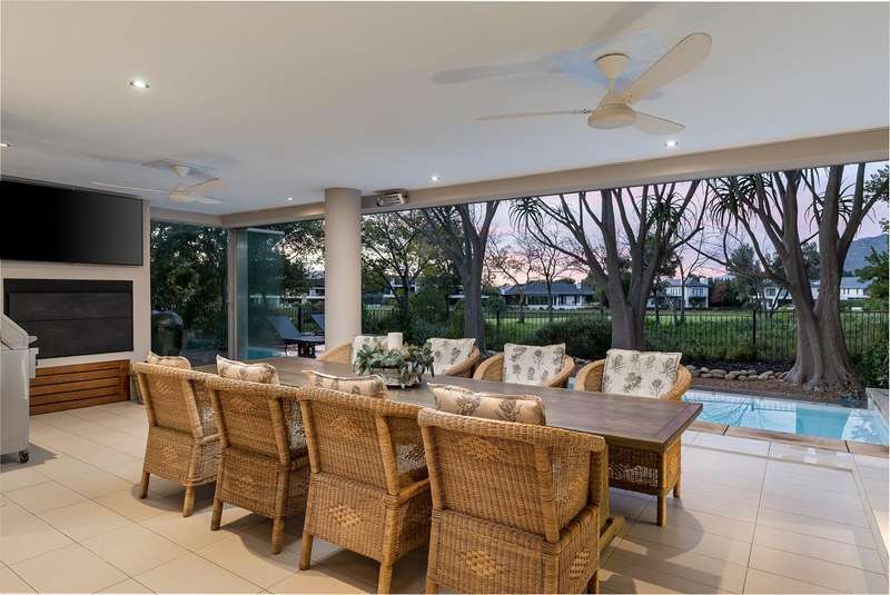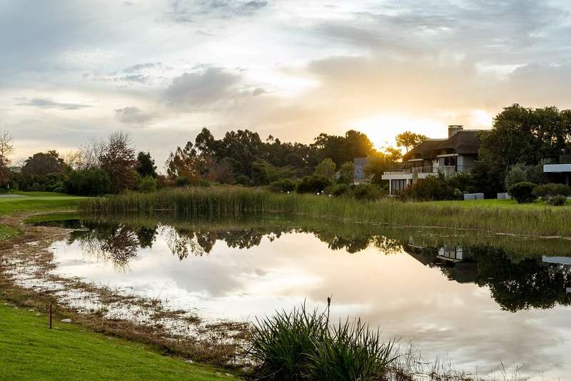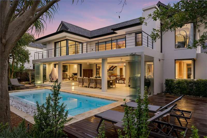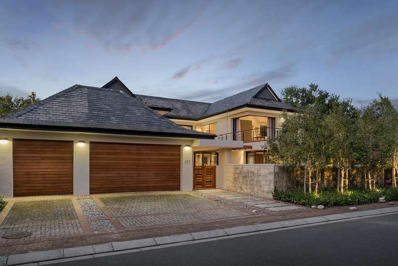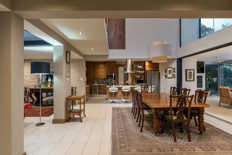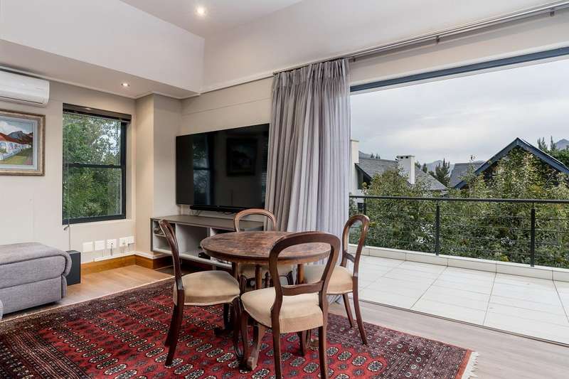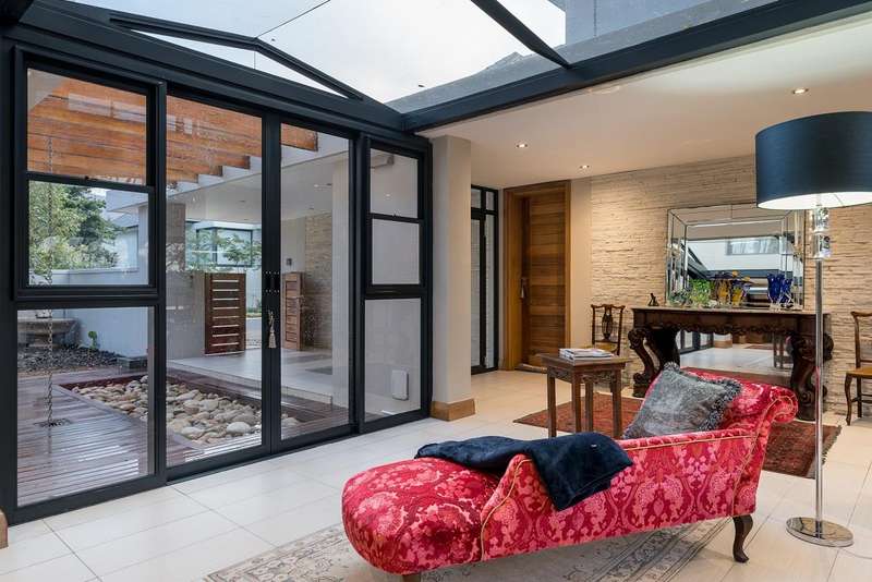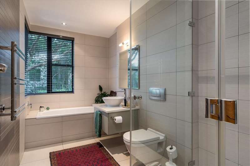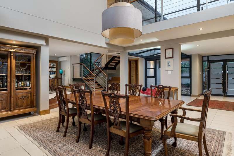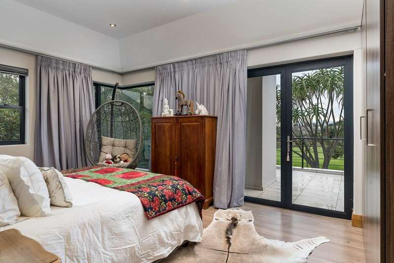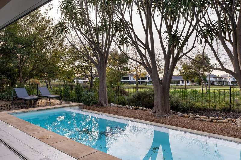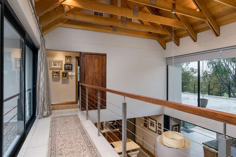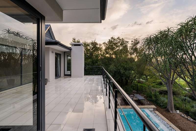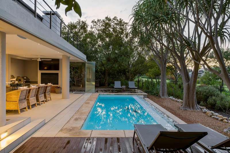Set in a cul de sac this stylish North facing Louis Phillips designed home is immediately welcoming with it's covered walkway to the double glass doors that, on entering, give you views through the entrance hall to the enclosed patio, pool and garden area. The ground level offers spacious open plan living areas with a modern kitchen, dining area and split level lounge / TV room as well as a separate entrance guest bedroom / study space. The living areas open to a wide covered patio with a built in braai - ideal for entertaining while overlooking the pool, waterwise garden and golf course with it's lake. There are glass stacking doors enabling the patio an ideal all year round space. The second level of this home comprises 3 bedrooms and a study / TV room. The master bedroom has a spacious ensuite bathroom and sliding doors that open to a large balcony. The lounge, master bedroom, guest bedroom / study and study / TV room all have corner sliding doors that, when opened into cavities, give seamless views from these rooms. There are many added features to this home that we are very thrilled to be marketing.