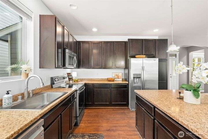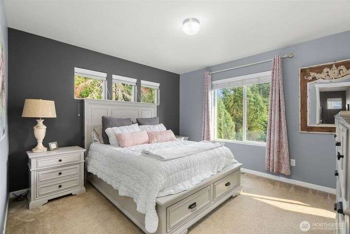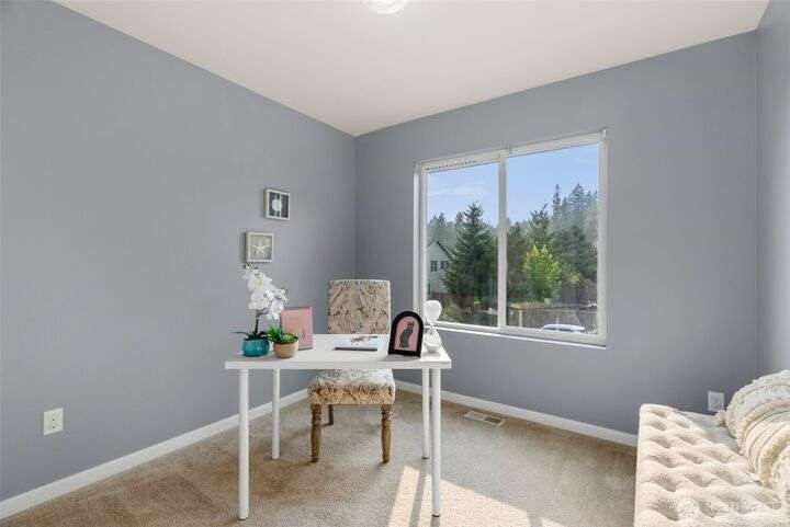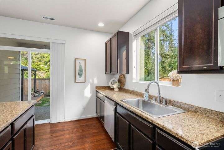 Welcome to your Liberty Hill retreat! This 3-bed, 2.5-bath home offers 1,792 sq ft of comfort with durable LVP floors, a welcoming living room, and a kitchen with brand-new stove and dishwasher. Upstairs, the spacious primary suite includes a walk-in closet and private bath, plus two bedrooms, full bath, laundry, and a flexible bonus space. Outside, relax in your fully fenced backyard oasis with mature landscaping, patio, and gazebo—all backing to a peaceful greenbelt for added privacy. Liberty Hill offers community parks, playgrounds, and walking trails, with a convenient Poulsbo location close to schools, shopping, ferries, and bases. Truly the best value in Liberty Hill!