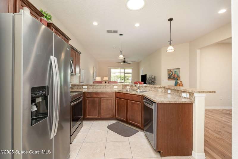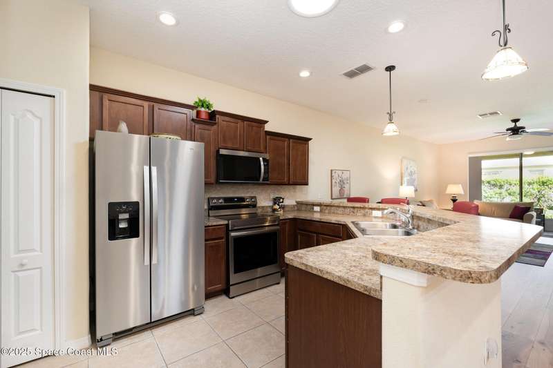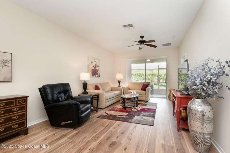 Nestled in the most prestigious 55+ resort-style community in Viera Is where you will find this better than new impeccably kept, move in ready villa. Brand new roof, gutters, freshly painted outside, accordion storm shutters, brand new mohawk wood flooring, all new whirlpool appliances, comfort height toilets, private back yard oasis. Enter into this open floorpan, featuring 2 bedrooms, 2 bathrooms and den,. Enjoy mornings and evenings on your private screened in patio. This villa has been crafted for a life of comfort, luxury, and vibrant community living. The resort-style amenities allow you to immerse yourself in the social scene, whether it's a refreshing dip in the exquisite heated pool & hot tub/spa, a game of tennis or pickleball, a light workout in the fitness center or a leisurely stroll through manicured pathways and community events. This community is close to everything,y et so far away from it all! Start living your dream resort style.