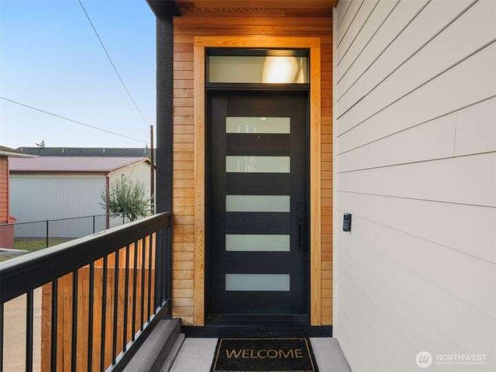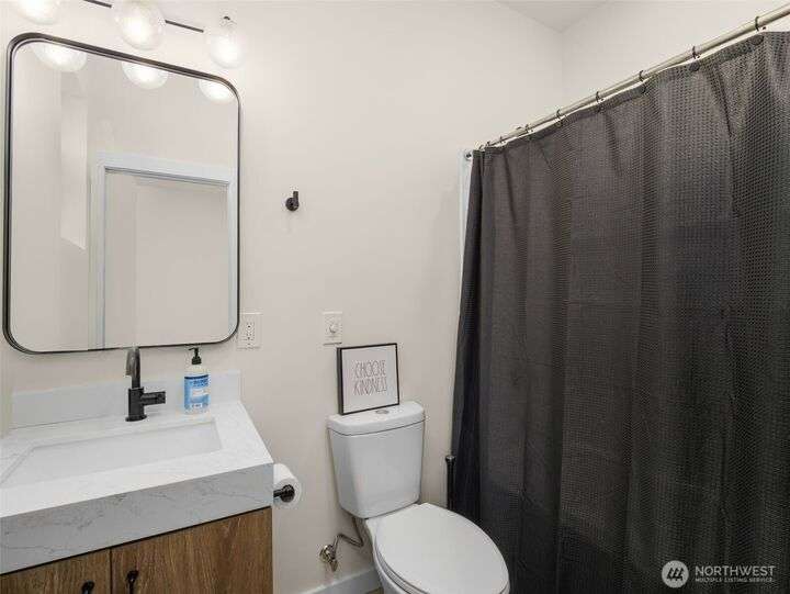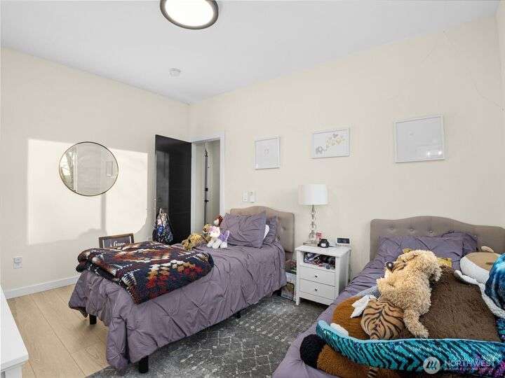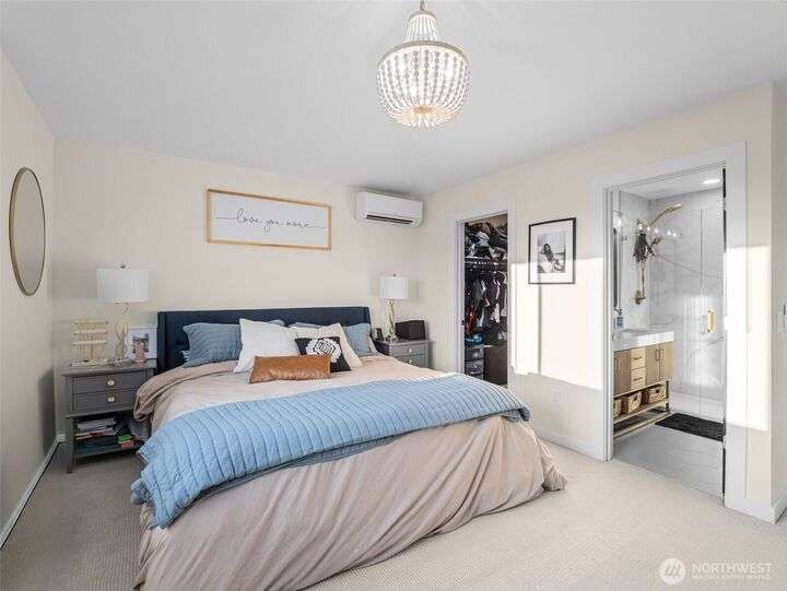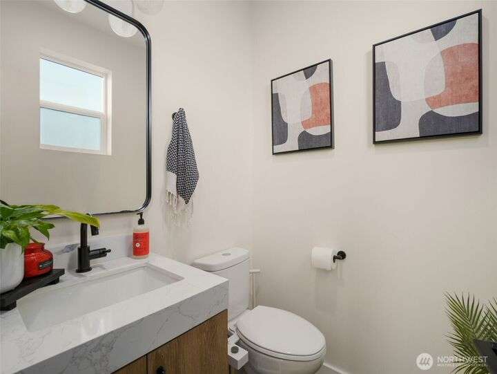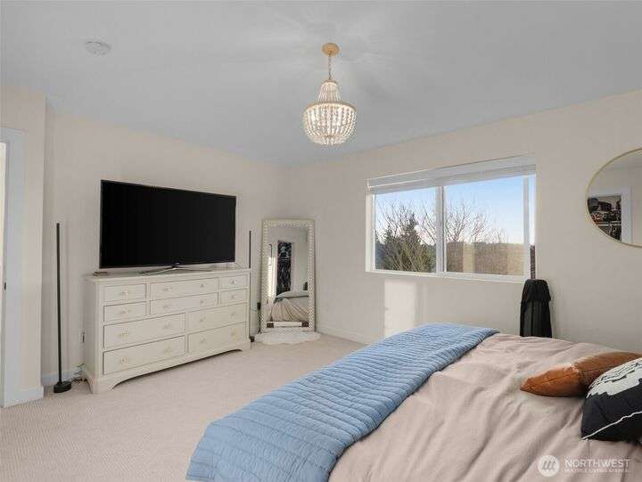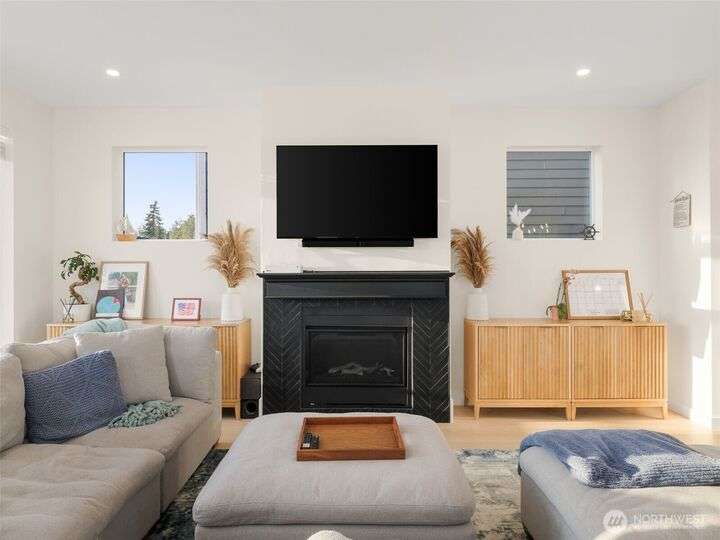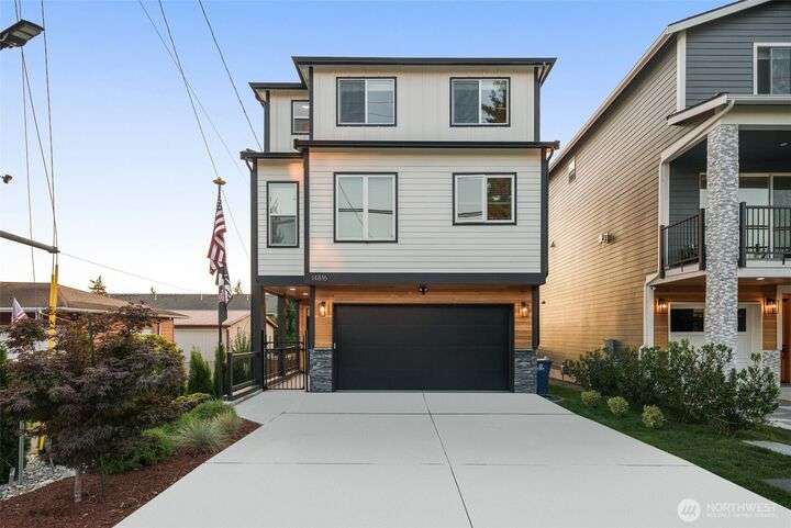This stunning former model home offers clean, modern luxury with custom finishes throughout. Step through the front door to a versatile main-level primary suite w/walk-in closet & ensuite bath, perfect for multi-generational living or home office. The second level feels open, bright and inviting with sleek custom cabinetry, a striking waterfall island, dedicated dining space, large living room w/gas fireplace and windows that allow for tons of natural light. Upstairs, you'll find generously sized bedrooms, including a primary suite w/ensuite bath. Other features include a two car garage, driveway parking, gated front entry and easy access to both 405 and I-5! Don't miss out on this gorgeous like-new home that blends efficiency with style!