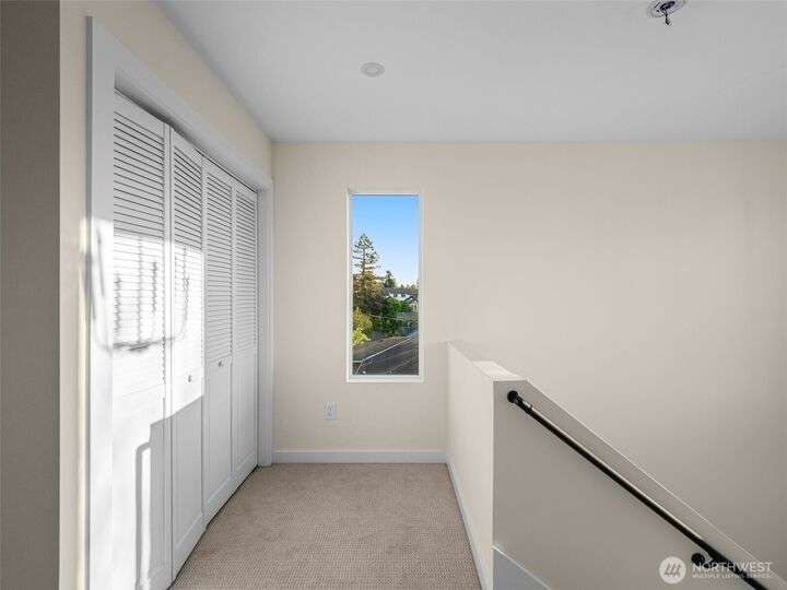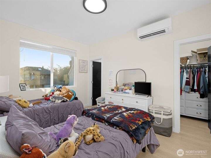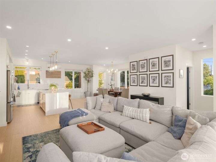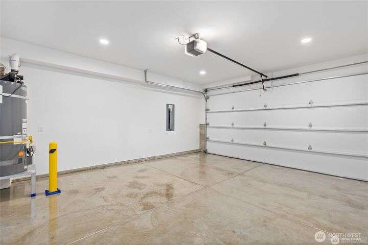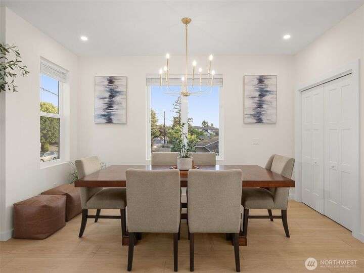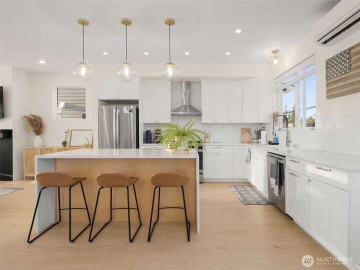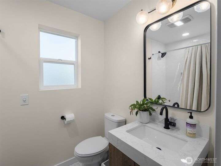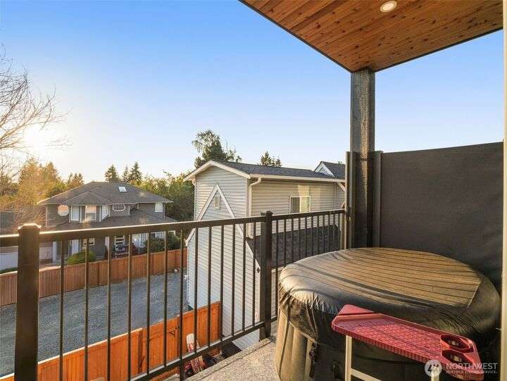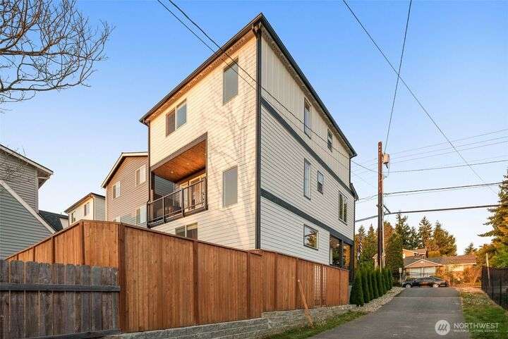 This stunning former model home offers clean, modern luxury with custom finishes throughout. Step through the front door to a versatile main-level primary suite w/walk-in closet & ensuite bath, perfect for multi-generational living or home office. The second level feels open, bright and inviting with sleek custom cabinetry, a striking waterfall island, dedicated dining space, large living room w/gas fireplace and windows that allow for tons of natural light. Upstairs, you'll find generously sized bedrooms, including a primary suite w/ensuite bath. Other features include a two car garage, driveway parking, gated front entry and easy access to both 405 and I-5! Don't miss out on this gorgeous like-new home that blends efficiency with style!