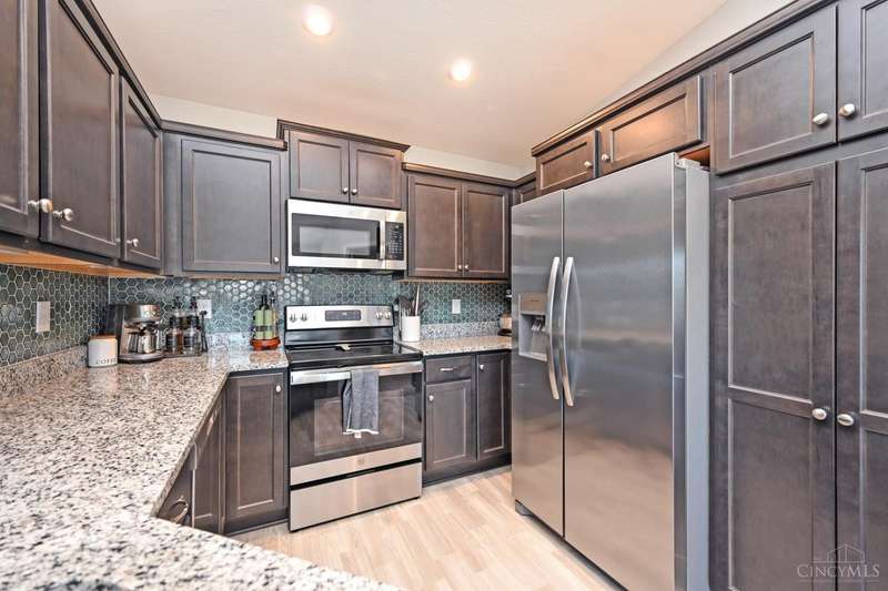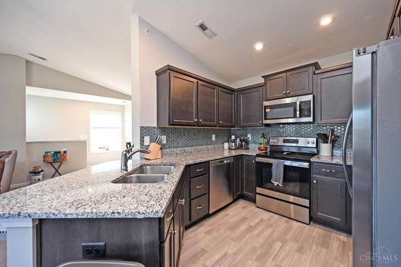 Your chance to buy in the neighborhood at this price. Only 2 years old with a great location near the clubhouse and pool. Easy parking. Low HOA includes clubhouse, pool, exercise facility, trash/sewer, snow removal, and water, plus allows dogs! Primary bedroom is ensuite w/ its own bathroom and walk in closet. Washer & Dryer stay. Kitchen has wood cabinetry w/ granite counters & stylish backsplash! Living room and dining room are open w/ vaulted ceilings. Enjoy no one living above you!