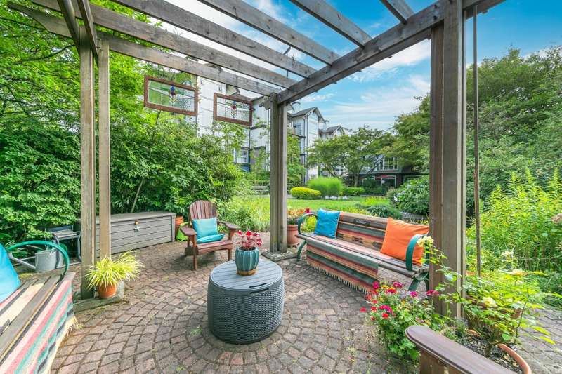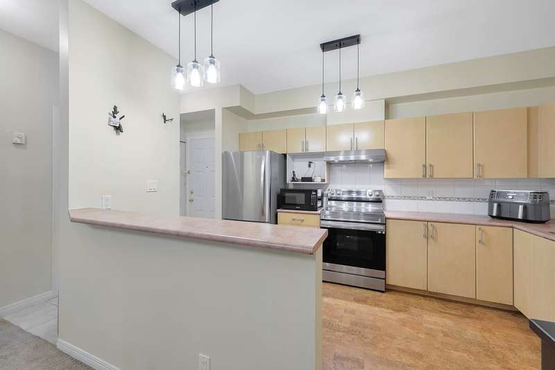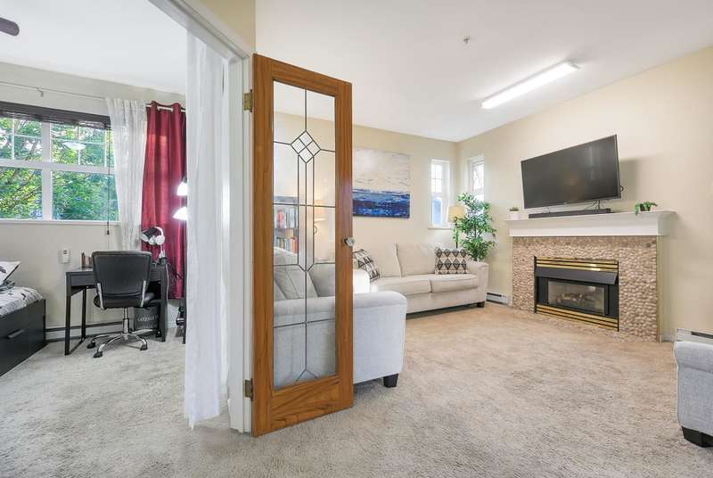 2-BDR Corner Unit at Residences by the River! This spacious street-level home features an open kitchen concept, lots of natural light & large windows, a cozy gas fireplace, and a private covered patio. Enjoy peaceful river views to the north, the building's landscaped garden, and a vibrant community garden just across the street. Great distribution and floorplan, with 9 ft tall ceilings and bedrooms on opposite sides for added privacy. Secure u/g parking w/ shared Car Wash station for residents. Located steps from scenic trails, Port Royal Park, the Q2Q ferry, & charming local shops. Only one block from transit - close enough for convenience, yet tucked into a quiet, low-traffic residential pocket. Includes 1 parking and storage.