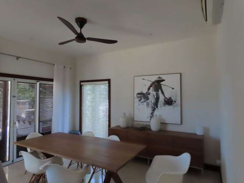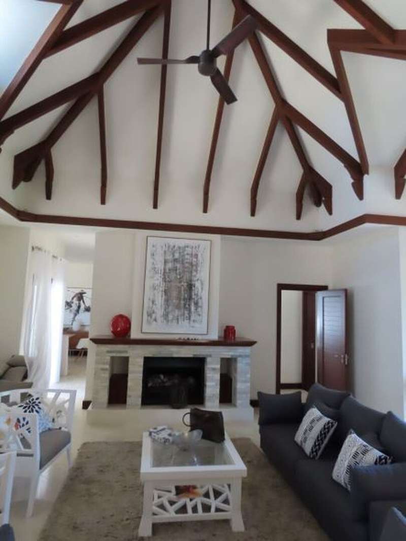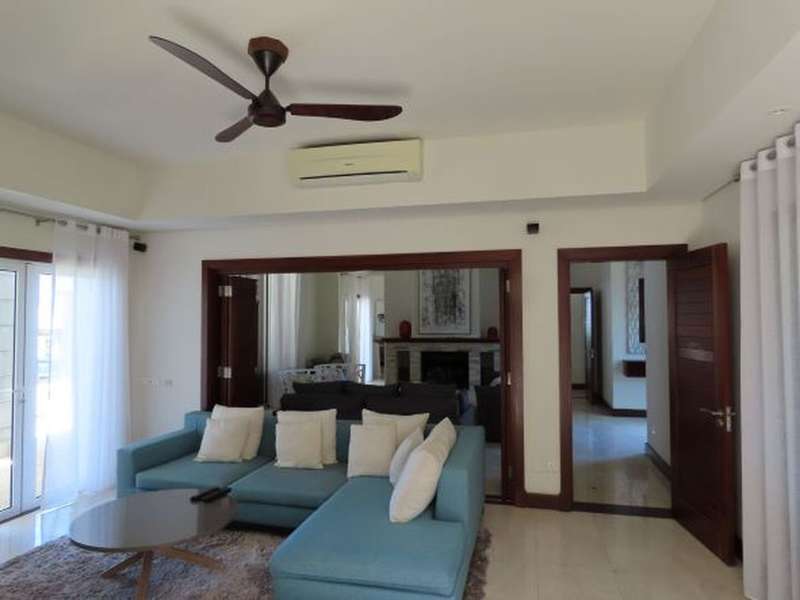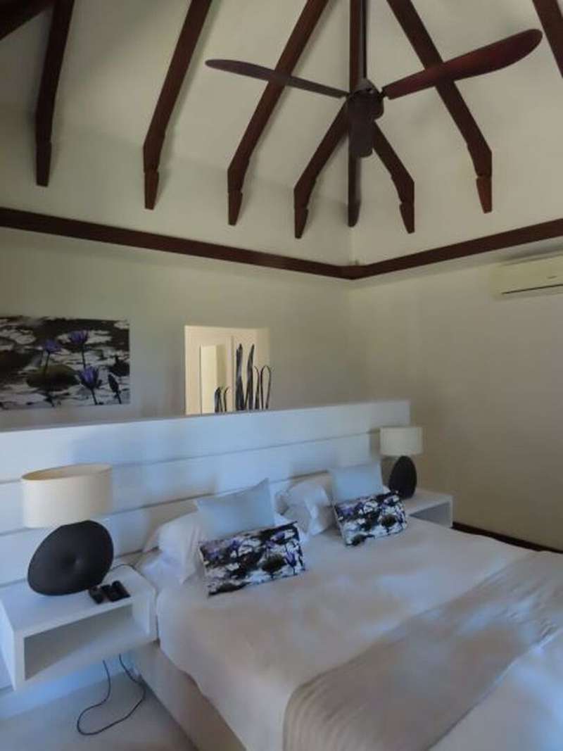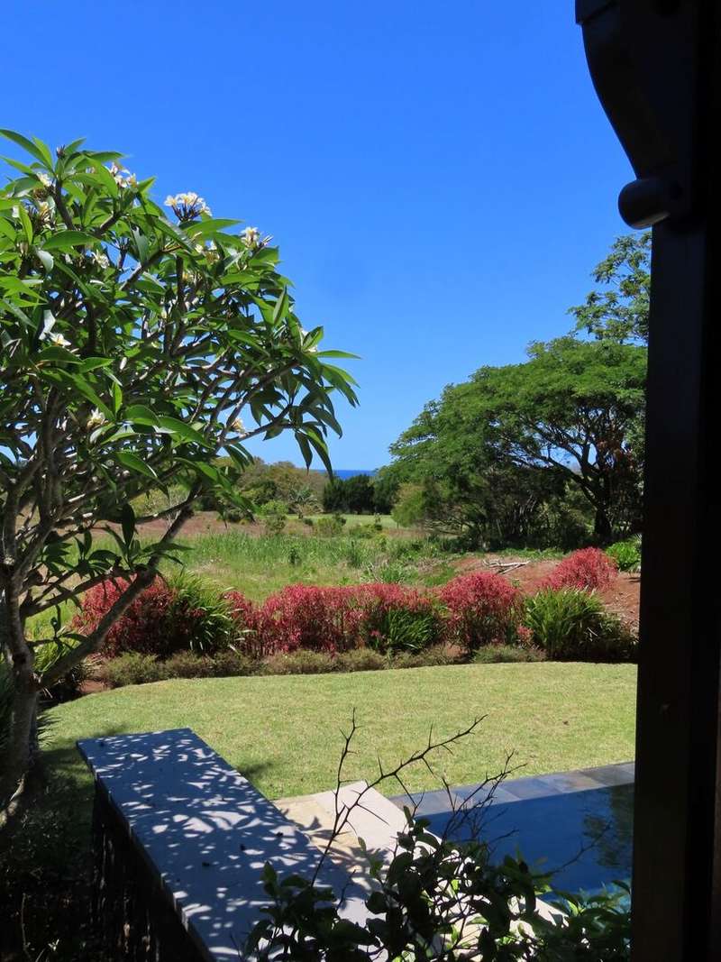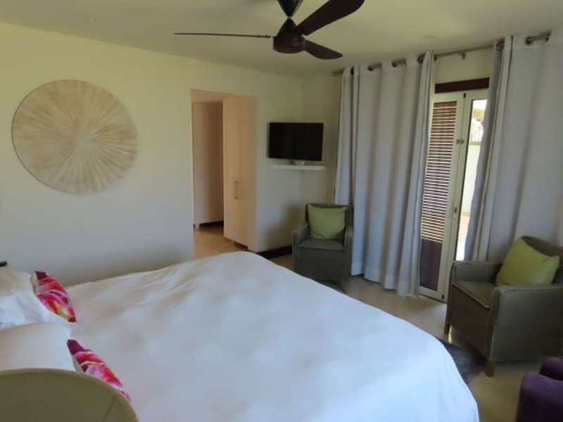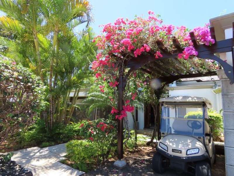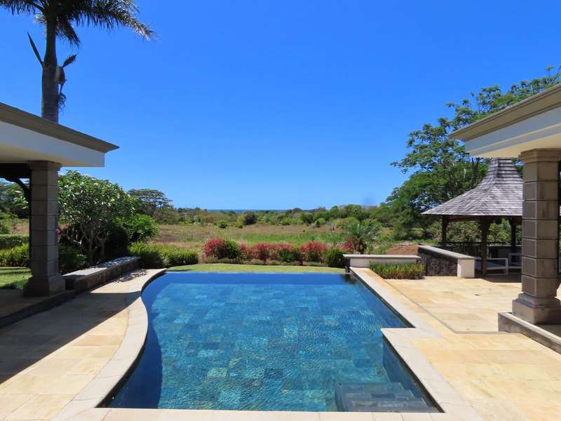 Outside, this single storey family home rises above the private 18 holes golf course, part of the Villas Valriche IRS Golf and Lifestyle Estate. It bears open views across a mature tropical garden of 660 m2, plus open land, then the golf course and finally distant sea views. With no close neighbours, this extremely private dwelling of 250 m2 is well-spaced from other villas. It also features a double car garage, plus a golf cart port, The U shape of this house surrounds a 40m2 rim flow concrete swimming pool with slate tile finish and two external showers, completed by a fully built gazebo kiosk, covered terraces, pool deck, bar and solid state barbecue for a total covered area of some 415 m2 and enclosed of 685 m2. Inside, a large gourmet kitchen, fully equipped with island, scullery, laundry room, direct outside and garage accesses, opens onto the 20 m2 dining room. It links to a 35 m2 living area and 25 m2 TV lounge. Both these spaces are separated by plantation shutters. Once opened to create a larger indoor entertainment space, it can also incorporate the bedrooms lobby of 13 m2, featuring a large dome light. The TV lounge has a separate covered terrace and leads to a secluded back garden which also opens up to one bedroom. High ceilings with timber frame and open fire chimney give character to the living room which is under pitched roof. All 4 bedrooms benefit from their private bathrooms. One provides a tub useful for youngsters. The master bedroom adds an en-suite separate dressing. The entrance hall caters for a guest toilet and a separate washbasin.