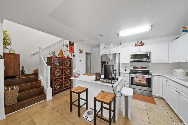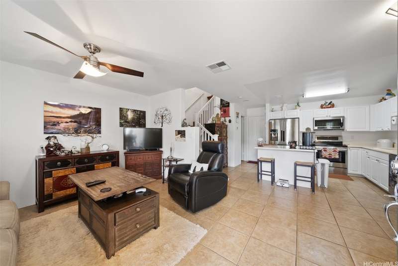 Don't miss out on this unbeatable deal in the highly sought-after Spinnaker community! This charming two-story townhouse boasts a desirable floor plan with seamless flow between the living room, dining area, and beautifully kitchen. Featuring 3 spacious bedrooms, 2.5 baths, and a generous 2-car garage, this home is perfectly located in Ewa Beach, just off the main roads for added privacy. Upstairs, the home's 3 bedrooms and 2 full bathrooms offer comfort and convenience, including a large primary bedroom with its own ensuite bath and walk-in closet. Additional storage space is available at the top of the stairs. Enjoy refreshing cross breezes through open windows or stay cool with central air conditioning throughout the home. The private, fenced-in yard is beautifully landscaped and ideal for outdoor entertaining, and the community amenities include a pool, hot tub, and BBQ area, all just one block away. With ample guest parking available throughout the complex, you'll never have to worry about finding space. Spinnaker offers a prime location close to Laulani Shopping Center, the new Wai Kai community, top-rated schools, parks, restaurants, and pristine beaches.
