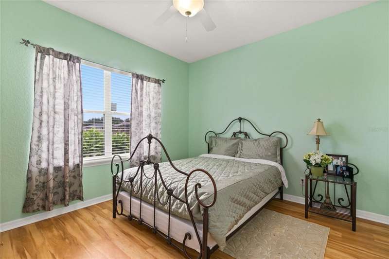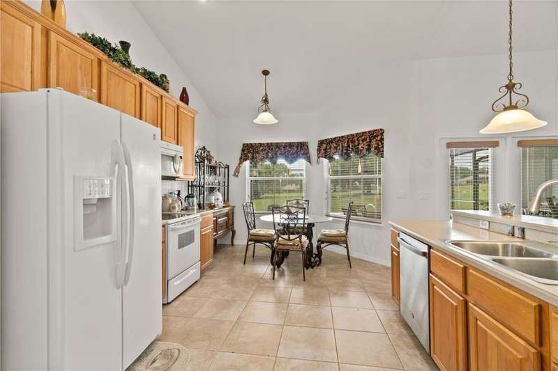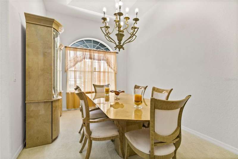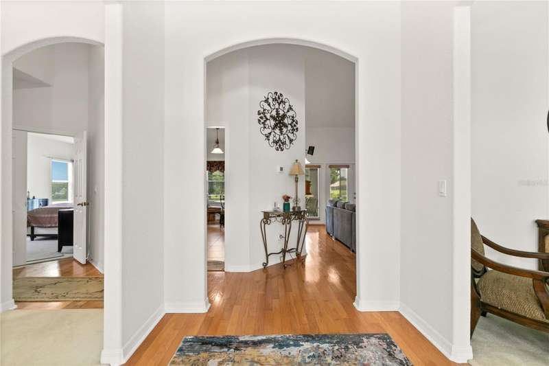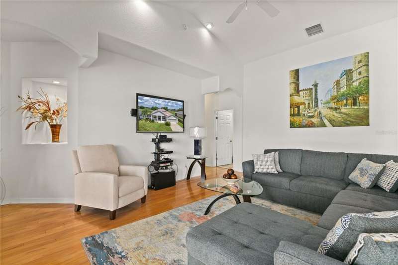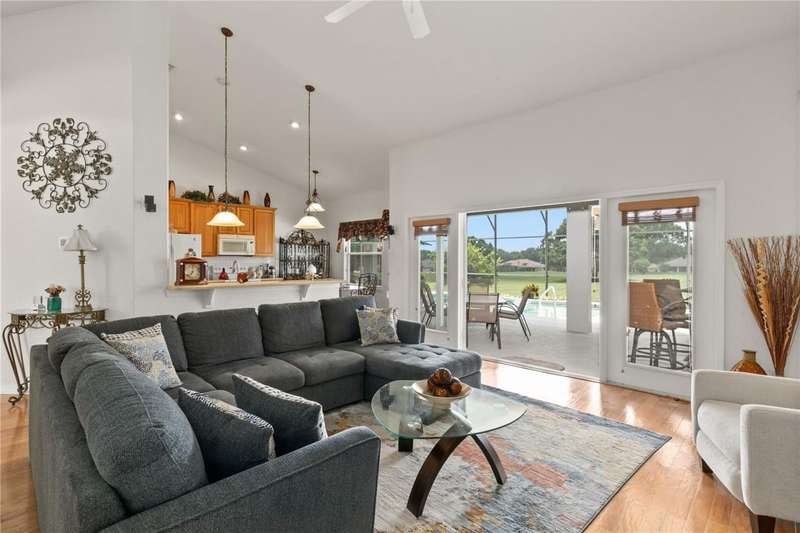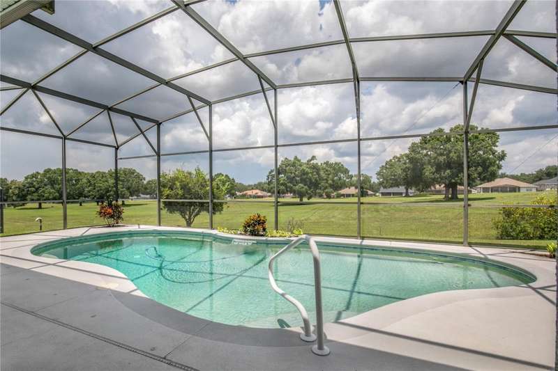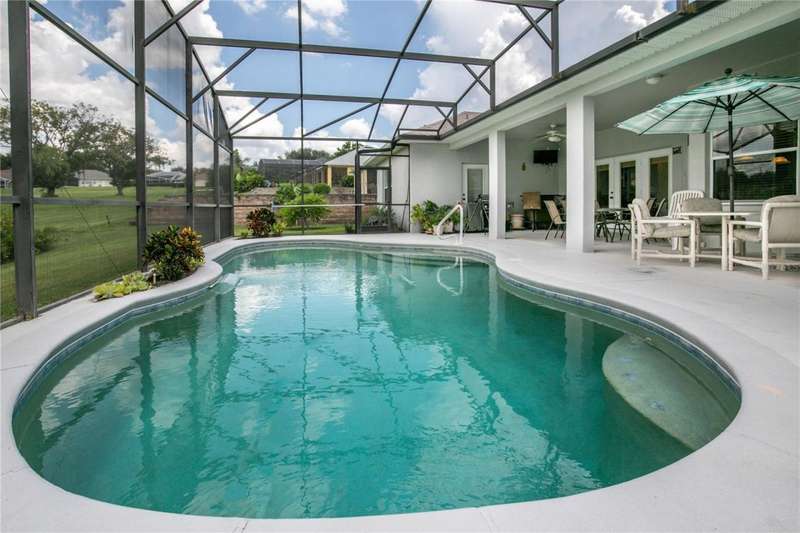 MAJOR PRICE REDUCTION. Welcome to this spacious and beautiful 4-bedroom, 2.5-bath pool home located in the highly desirable community of Palisades. Situated on a former golf course, now green space with no rear neighbors, this residence offers both privacy and stunning views. Inside, you'll find a bright, open floor plan with beautiful wood flooring, freshly painted rooms, and plenty of natural light. The kitchen features 42-inch wood cabinets, beautiful countertops, a large pantry, and a breakfast bar that flows into the family room, along with seperate formal dining and formal living rooms. Roof (2022) AC (2022) Hot Water Heater powered by solar panel. The primary master suite is a private retreat, complete with tray ceilings, French doors leading to the lanai, two separate closets, a walk-in for her, with dual sinks, a luxurious whirlpool tub, and a separate shower. Fourth bedroom can be used as a study or den.Step outside and the first thing you notice is no rear neighbors, only green space and the fruit trees.The rear has a screened-in pool and a generous lanai which is partical covered looking out to the greenspace of a fomer golf course, no rear neighbors, making it a perfect area for relaxing or entertaining. This is the one.