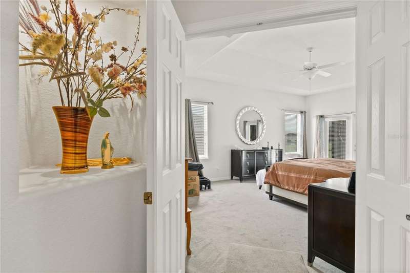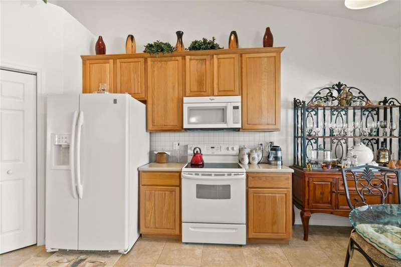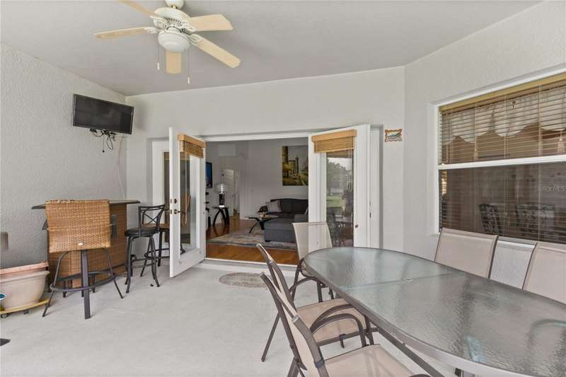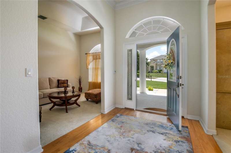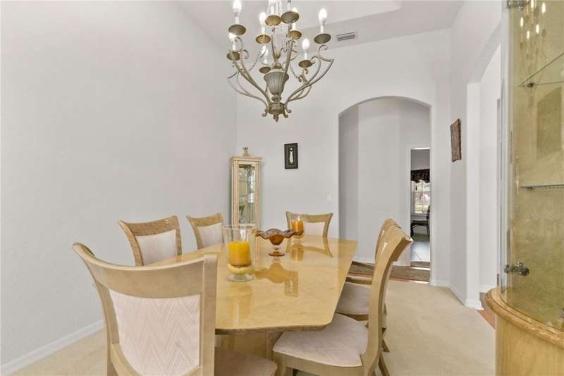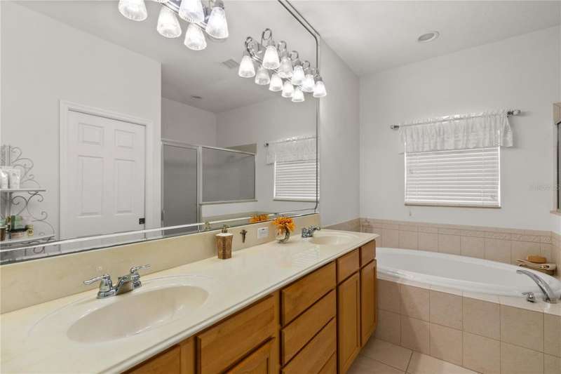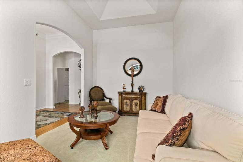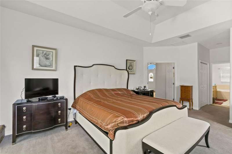 MAJOR PRICE REDUCTION. Welcome to this spacious and beautiful 4-bedroom, 2.5-bath pool home located in the highly desirable community of Palisades. Situated on a former golf course, now green space with no rear neighbors, this residence offers both privacy and stunning views. Inside, you'll find a bright, open floor plan with beautiful wood flooring, freshly painted rooms, and plenty of natural light. The kitchen features 42-inch wood cabinets, beautiful countertops, a large pantry, and a breakfast bar that flows into the family room, along with seperate formal dining and formal living rooms. Roof (2022) AC (2022) Hot Water Heater powered by solar panel. The primary master suite is a private retreat, complete with tray ceilings, French doors leading to the lanai, two separate closets, a walk-in for her, with dual sinks, a luxurious whirlpool tub, and a separate shower. Fourth bedroom can be used as a study or den.Step outside and the first thing you notice is no rear neighbors, only green space and the fruit trees.The rear has a screened-in pool and a generous lanai which is partical covered looking out to the greenspace of a fomer golf course, no rear neighbors, making it a perfect area for relaxing or entertaining. This is the one.