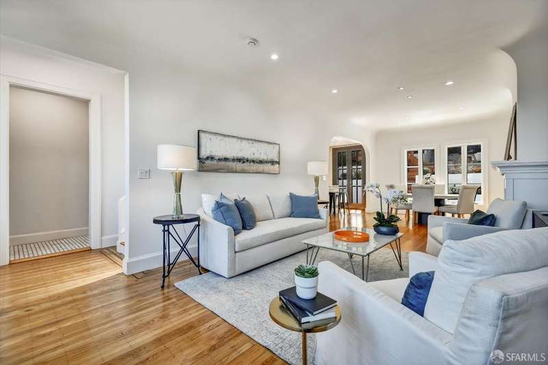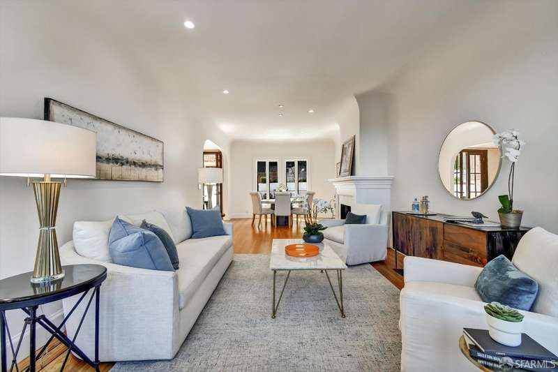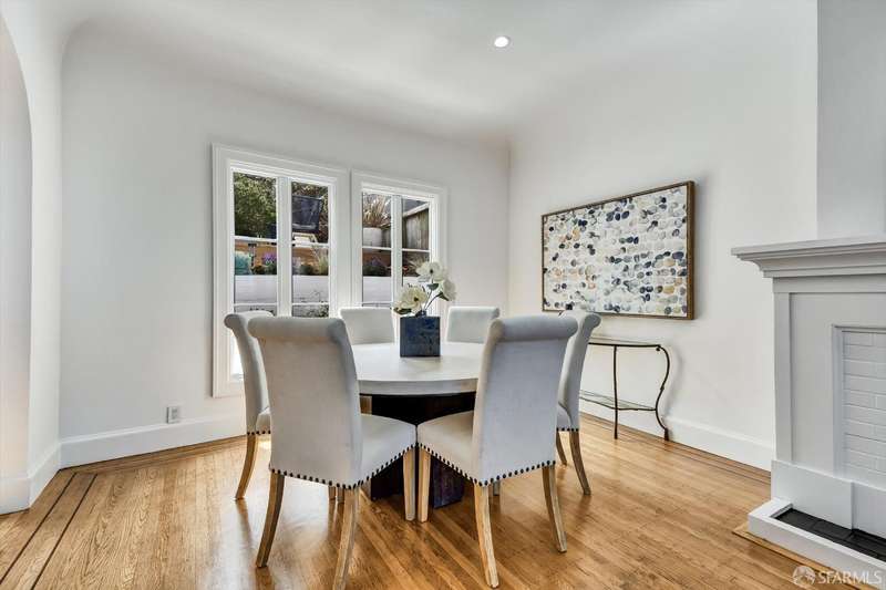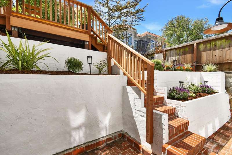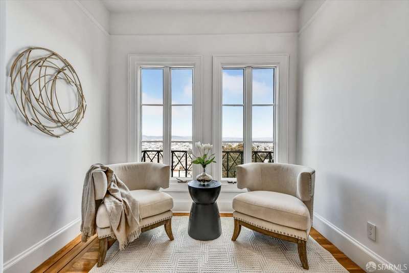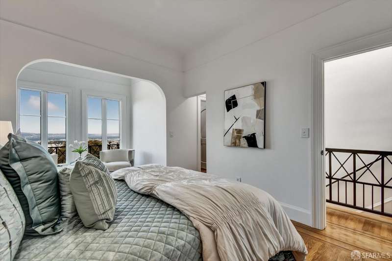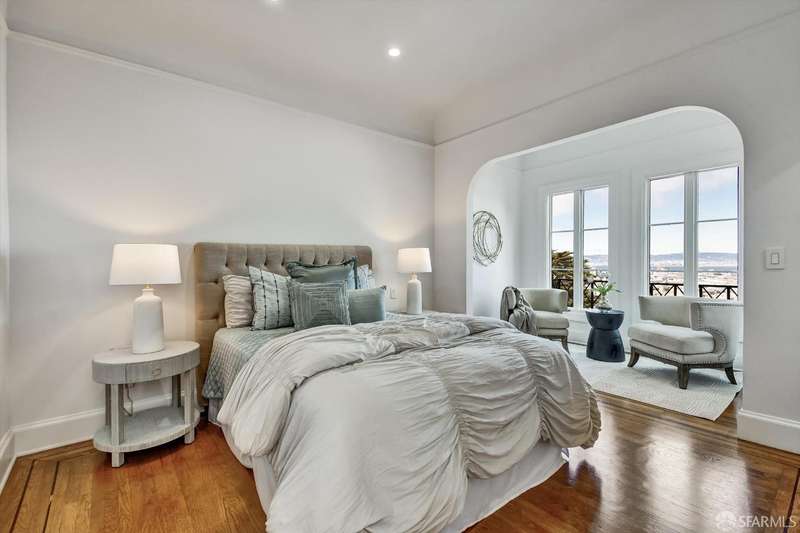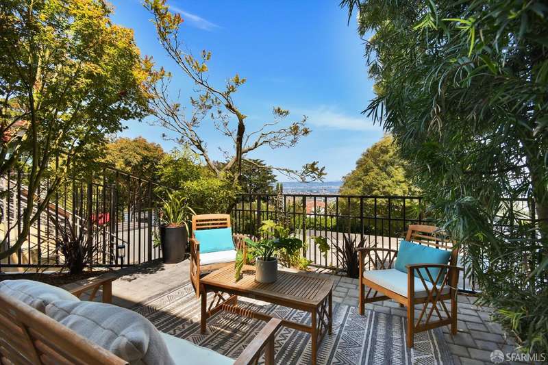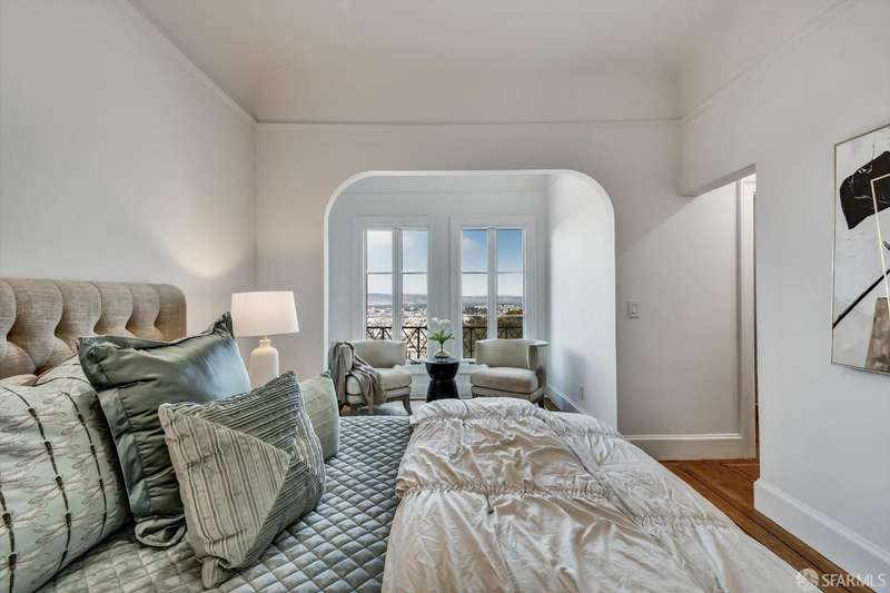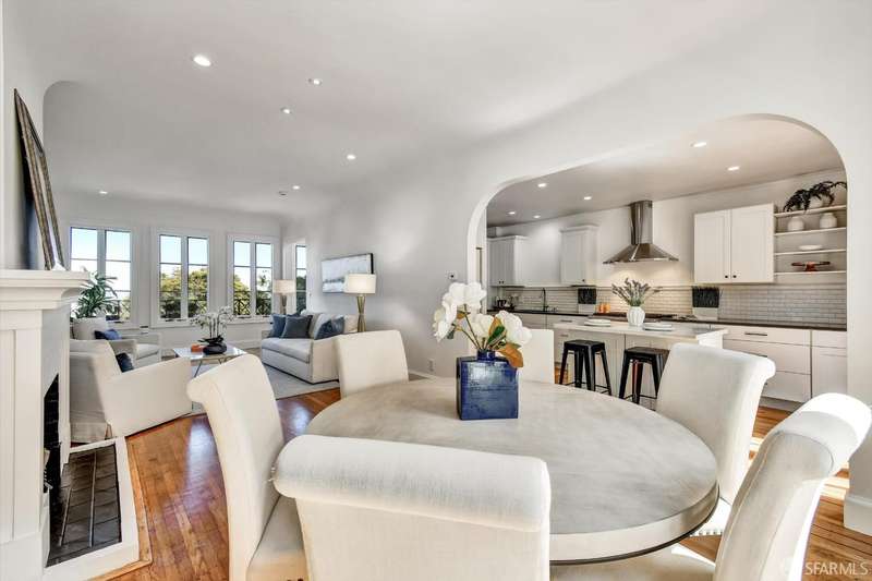 Behind a rose-lined entrance and gated garden patio, this beautifully updated home in prestigious Clarendon Heights offers stunning views from the Bay to Downtown San Francisco, Mount Diablo, and beyond. Blending classic Neo-Edwardian architecture with modern finishes, the open floor plan features coved ceilings, a powder room, spacious living and dining areas, and a gourmet kitchen that flows into a terraced backyardperfect for entertaining or morning coffee. The sunlit living room boasts sweeping Bay views and a cozy wood-burning fireplace. Upstairs, two guest bedrooms overlook a serene garden, while the primary suite includes iconic views, a walk-in closet, and a luxurious en suite bath. Includes a large two-car garage and easy access to shopping, dining, and city conveniences.