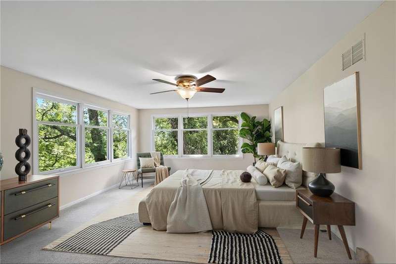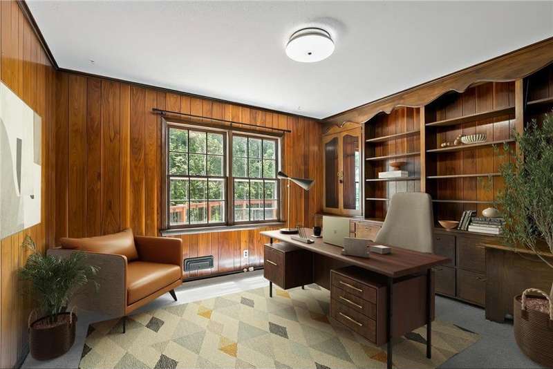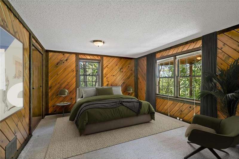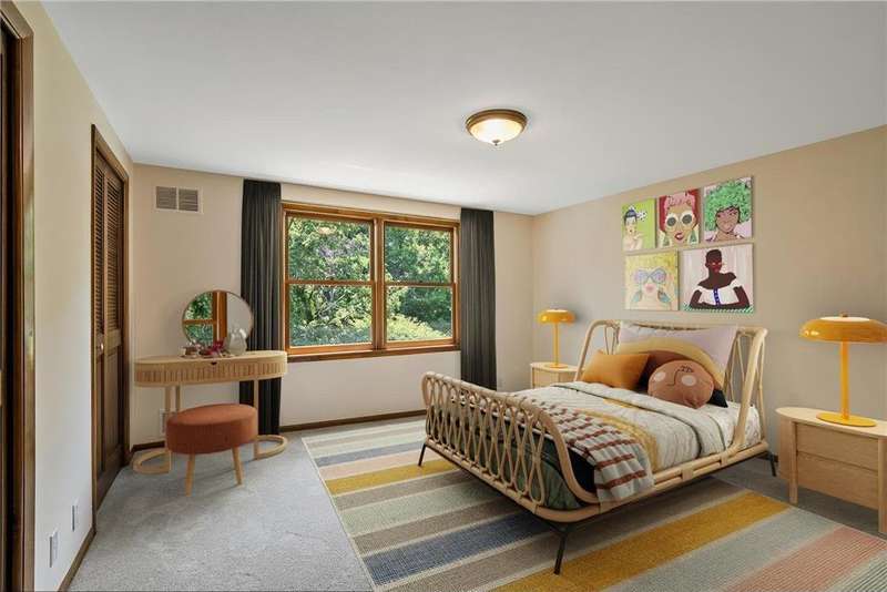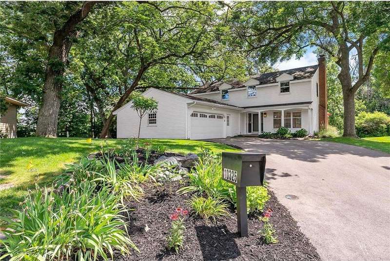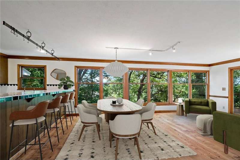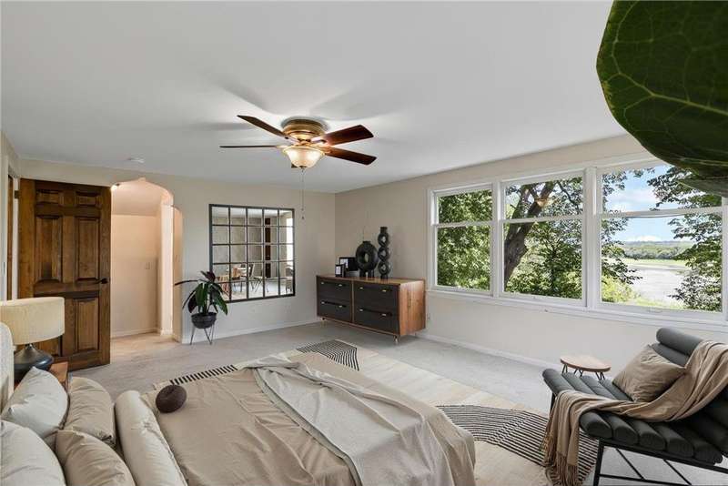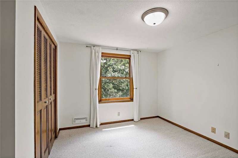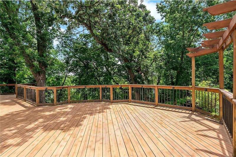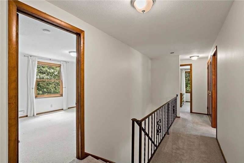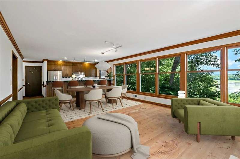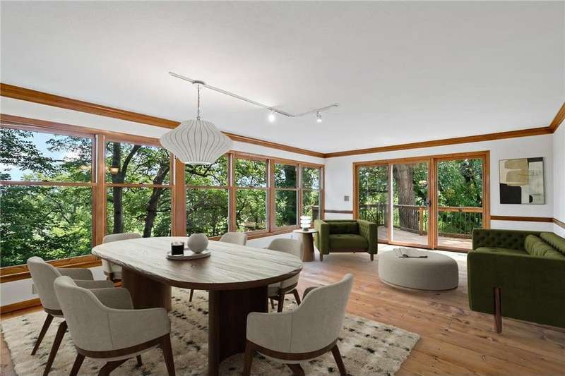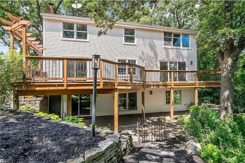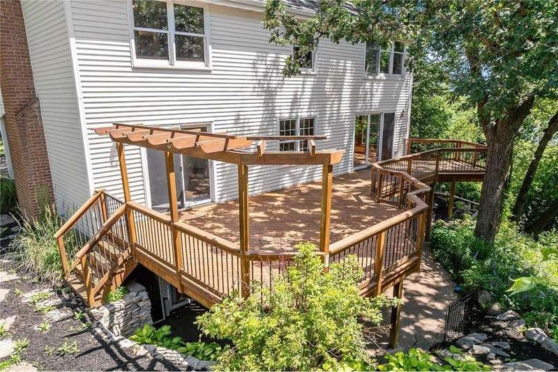 A River Bluff Retreat Like No Other - Welcome to the crown jewel of the neighborhood - a rare opportunity to own the premier lot on a quiet private cul-de-sac, hand-selected by the builder for its unparalleled river bluff views. This home was designed to celebrate nature's beauty from every angle, with sweeping vistas framed perfectly through expansive windows in the dining, kitchen and family room, plus upstairs primary suite. Step outside onto the stunning wraparound deck, which faces east and south to capture morning light and soaring bald eagles overhead. Whether you're sipping coffee at sunrise or enjoying a glass of wine at dusk, the ever-changing backdrop of lush summer greenery, brilliant fall foliage, and peaceful snow-covered landscapes in winter makes e3very moment feel like a getaway. Inside, possibilities abound. Keep the kitchen's chic mid-century vibes - warm wood, vintage charm-or re-imagine the space entirely; the generous footprint lets your creativity run wild. Four spacious bedrooms upstairs anchor the private wing, while a sunny main-floor office offers work-from-home flexibility. The walk-out lower level extends the living space with a guest suite (or second office), a full sauna ready for finishing touches, and direct access to the backyard for seamless indoor-outdoor entertaining. Perfect for relaxing after a long day or hosting overnight visitors. This is more than a home - it's a canvas ready for your personal touch, filled with opportunities to create a truly one-of-a-kind retreat. Don't miss your chance to to own a home where nature, privacy, and potential come together in perfect harmony.