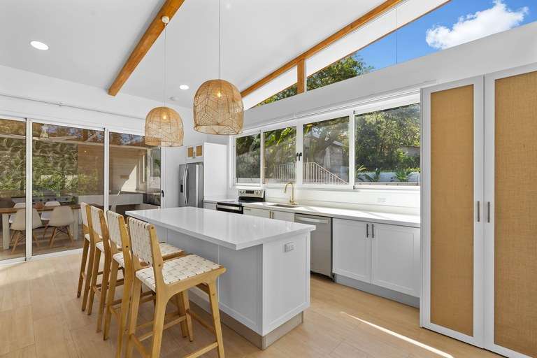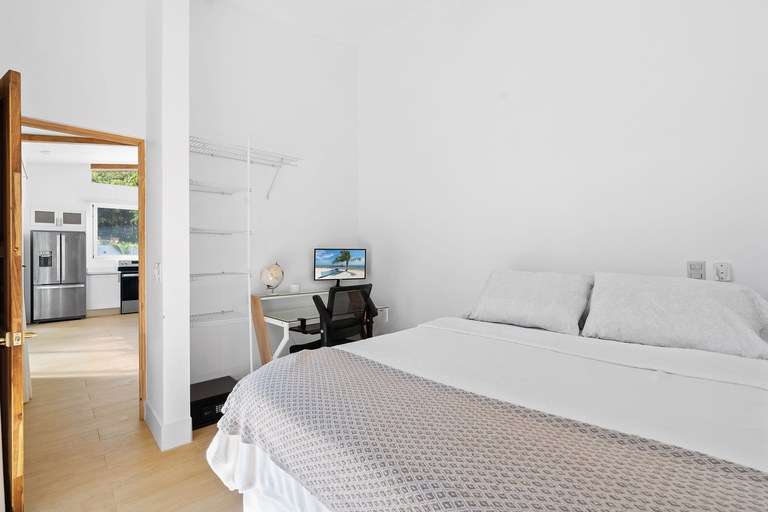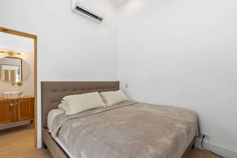 The home has spacious and inviting living areas with an open-concept design that connects the living room and kitchen. The living area is filled with sunshine throughout the day and large glass sliders lead to a spacious, covered terrace. This area is equipped with a grill and 2 sinks, perfect for dining and entertaining. The kitchen was designed by Luxury Kitchen, all doors/drawers are slow-close with brushed gold pulls and faucet. Counters are white quartz countertops and there is ample storage space. There are two generously sized bedrooms, each with its own en-suite bathroom and private terraces. The spacious yard is private, with a large above ground pool and built around deck, perfect for cool dips on sunny days. It's a perfect place for kids to enjoy. There's parking space for 3+ cars in the long driveway and plenty of room on the lot to expand, build multiple guest homes or 1 larger sized home.