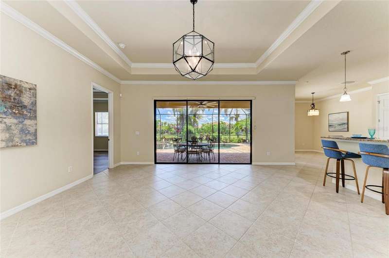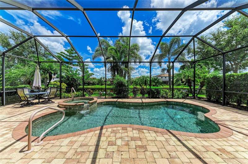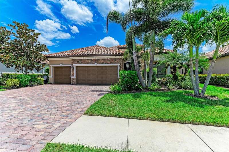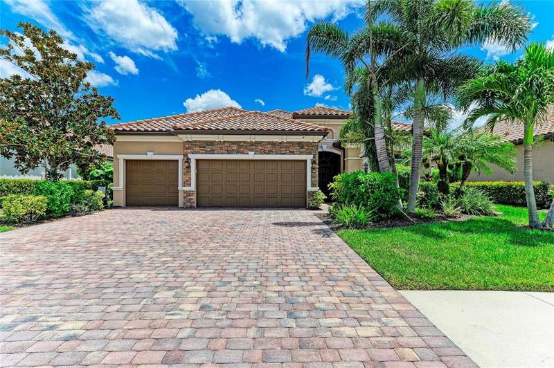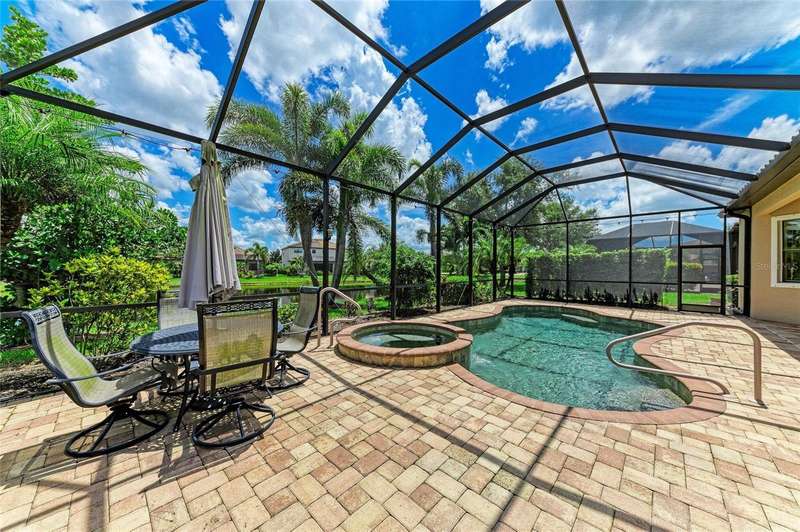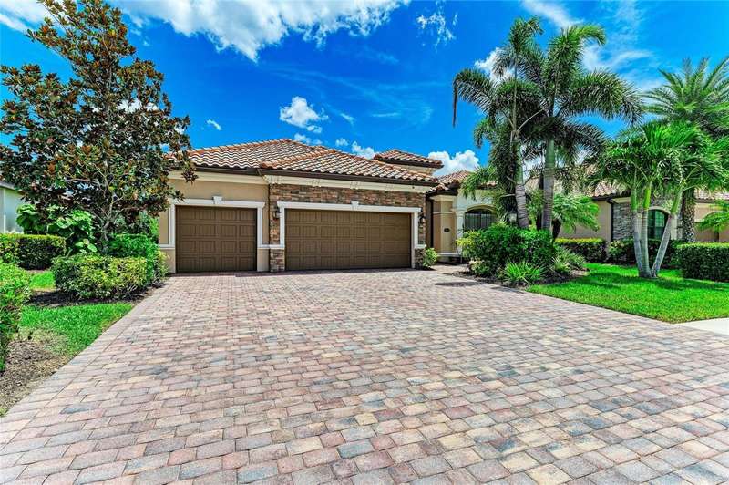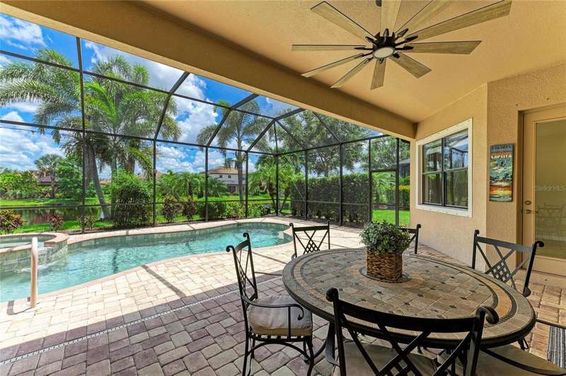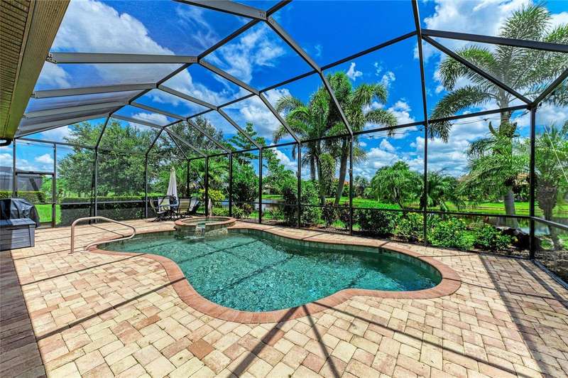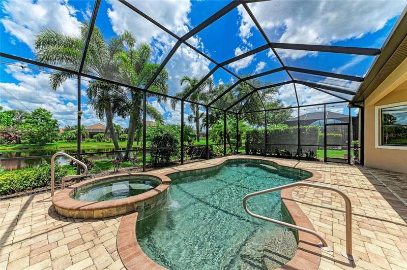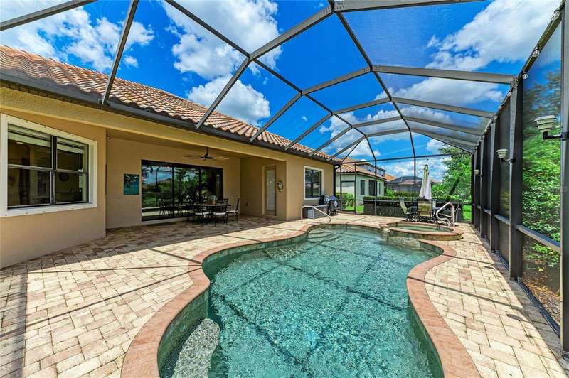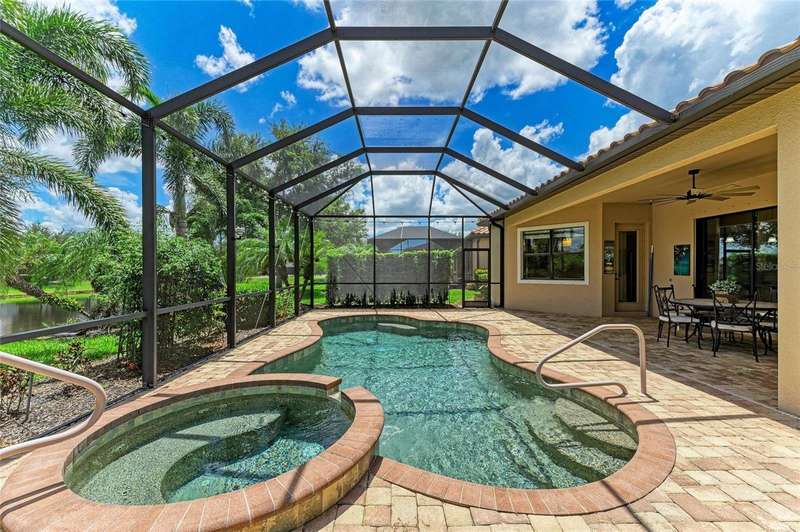Under contract-accepting backup offers. Experience the best of Florida living in this sought-after Princeton floor plan, featuring 4 bedrooms, 2 baths, 2,244 sq. ft., and a 3-car garage—plus a heated pool and spa—set on a tranquil water-view homesite with stunning outdoor lighting. Step inside to a bright, open layout where the kitchen flows seamlessly into the living room—ideal for hosting friends and family. The living area impresses with tray ceilings, recessed lighting, and fully pocketing sliding glass doors that open to an expansive lanai, complete with a sparkling heated pool, spa, and generous entertaining space. The primary suite is a private retreat with a tray ceiling, room for a king-sized bed and sitting area, and direct lanai access. Its spa-like bath offers dual vanities, a soaking tub, a Roman shower, and an oversized walk-in closet with custom shelving. Three additional bedrooms provide versatility for guests, a home office, or hobbies, while an open dining room or additional sitting area adds even more options for entertaining or relaxing. Elegant finishes are found throughout, including tray ceilings, crown molding, 8-foot doors, 5-inch baseboards, extended tile in the main living areas, and rich laminate flooring in the bedrooms. Practical upgrades include a full laundry room with cabinetry, a paver driveway and lanai, and ground maintenance included in the HOA for true ease of living. Bridgewater at Lakewood Ranch is a gated, maintenance-free community of just 275 single-family homes—no townhomes or condos—offering manicured landscaping, walking paths, a park, playground, and gazebo overlooking a scenic lake. Low HOA fees cover lawn care, reserves, and common area upkeep, so you can spend more time enjoying world-class golf, top-rated schools (including Lakewood Ranch Preparatory Academy), the UTC Mall, dining, shopping, and nearby white-sand Gulf beaches. With quick access to I-75, Sarasota, Tampa, and St. Petersburg are just a short drive away. Move-in ready and brimming with upgrades, this home blends refined design with relaxed elegance in Florida’s #1 master-planned community.