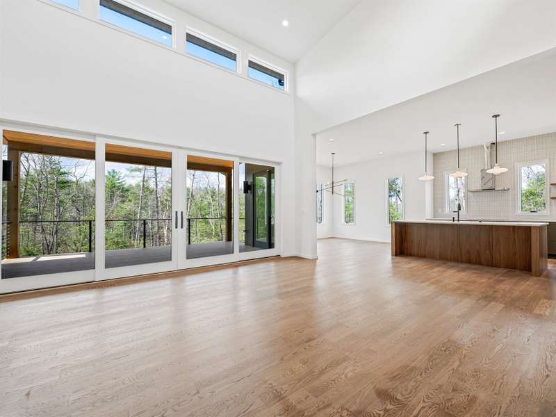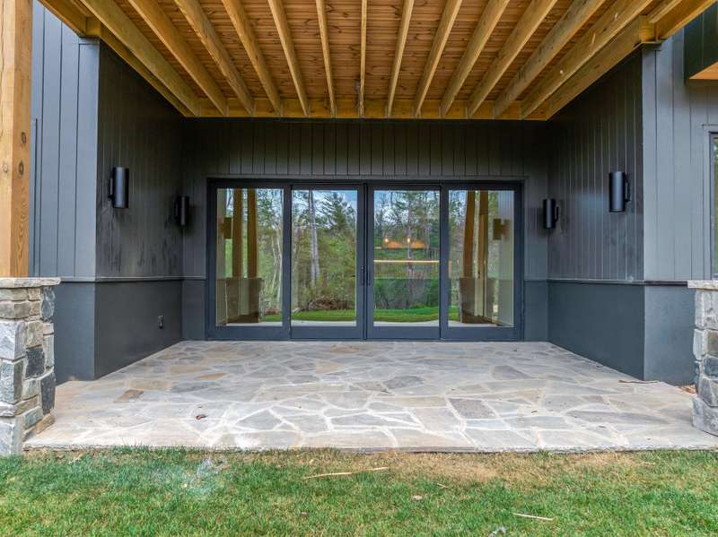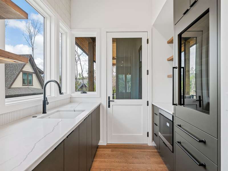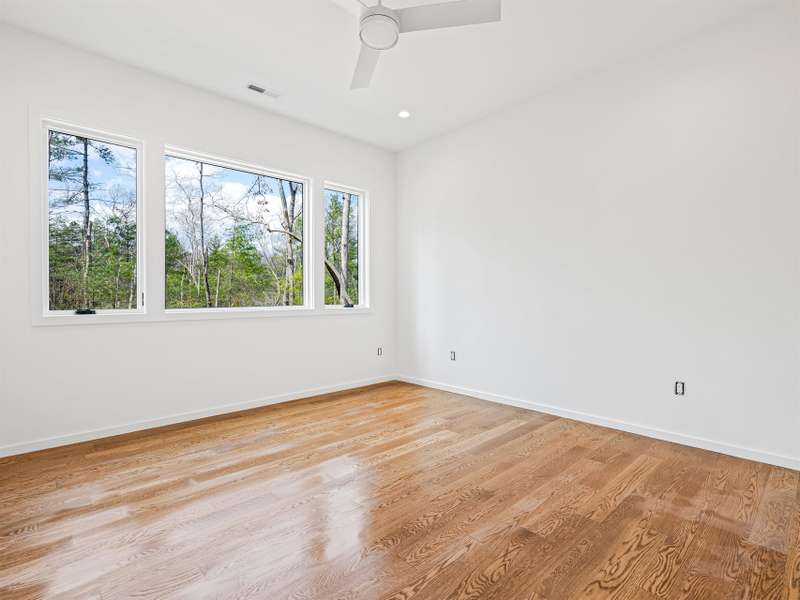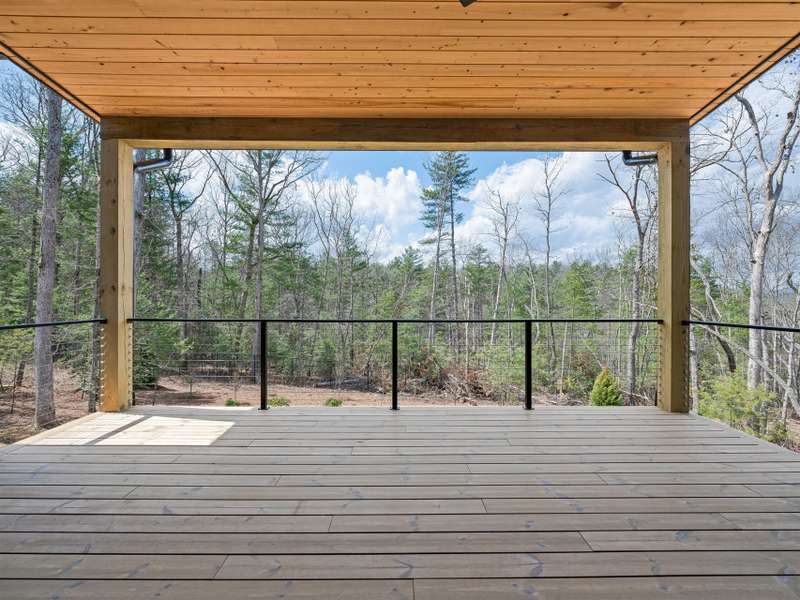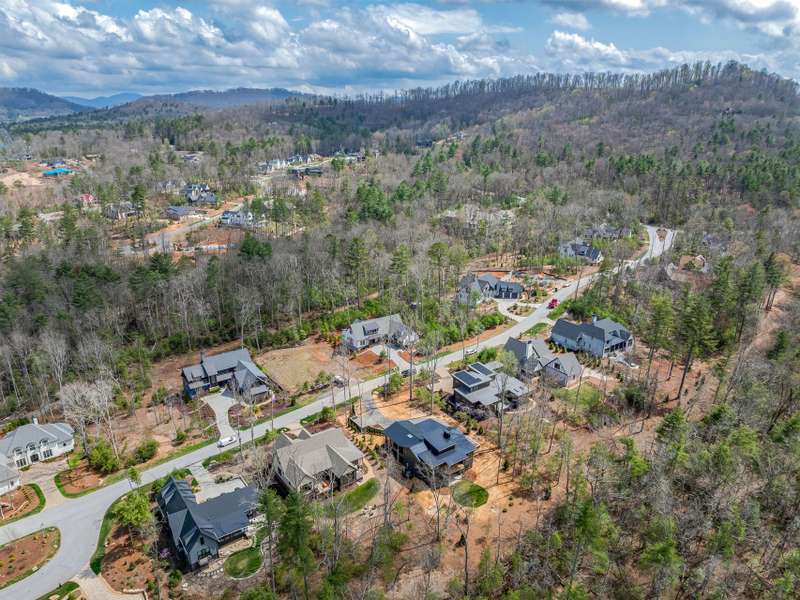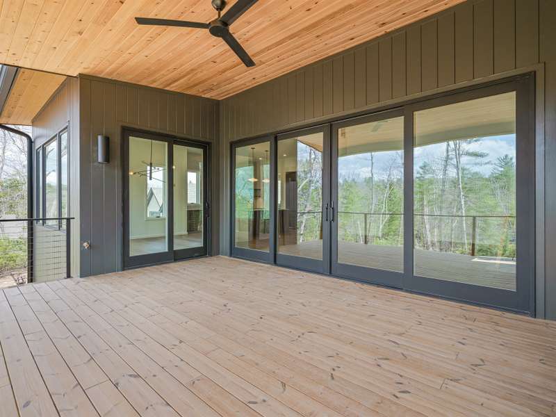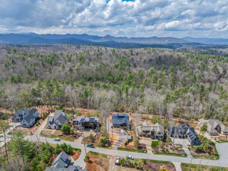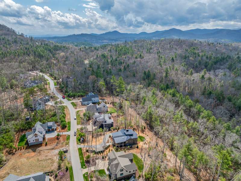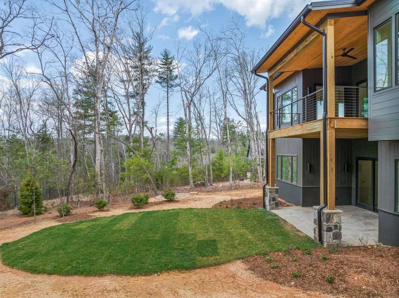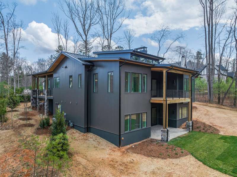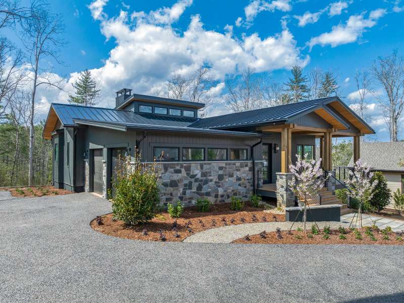 Construction completed on this contemporary new build with sleek mosaic stone and James Hardie Artisan V-groove vertical siding, a stone foundation and topped with a standing seam metal roof. A steel frame and glass panel front door invites you into a hall leading to the main open spaces with a light-filled office on the right. Ultimate sleek kitchen with island, walk in pantry and GE Monogram appliances. 5" select white oak flooring and tiled bathrooms throughout. Owners suite on the main level with a comfortable walk in closet and separate tub and shower. Gather comfortably on the front or back porch, in the downstairs living room with wet bar and a wine cellar or outdoor patio. This site backs up to woods near the Blue Ridge Parkway for extensive wooded privacy. Enjoy miles of trails, parks, fitness center, saline pool, tennis, pickleball, bocci, 24/7 security and three gated entrances.